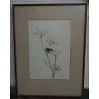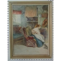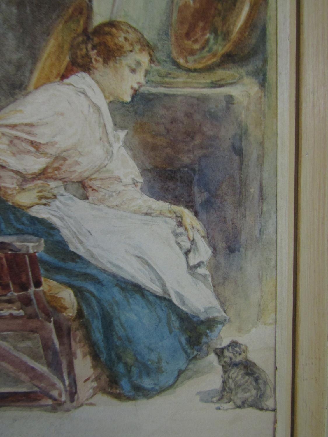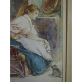 Late 19th century school - Cottage Interior with seated young lady and kitten, monogrammed WB, watercolour, 37 x 27 cm, framed