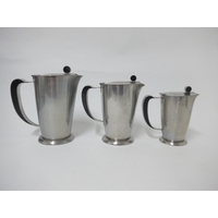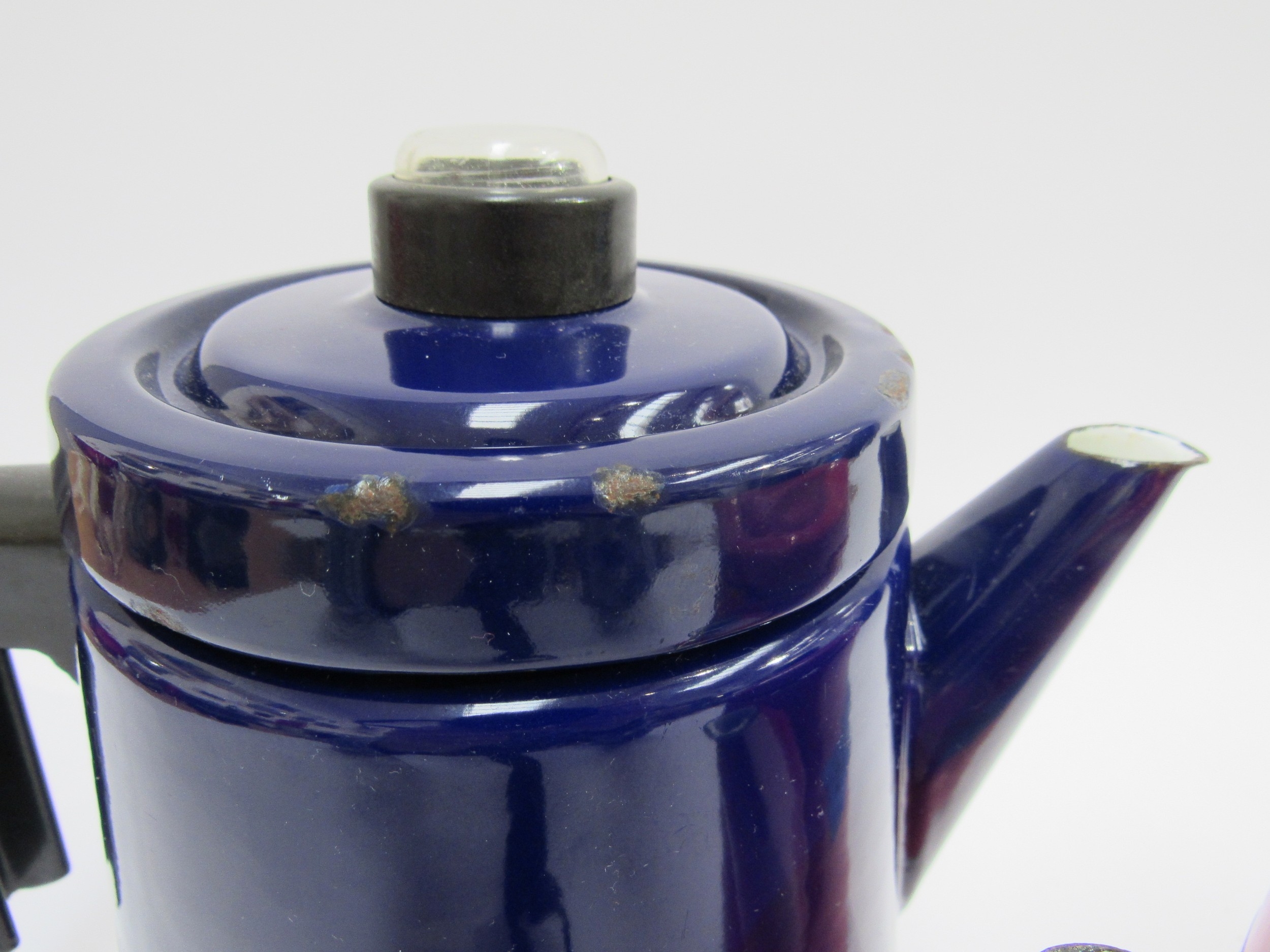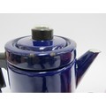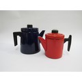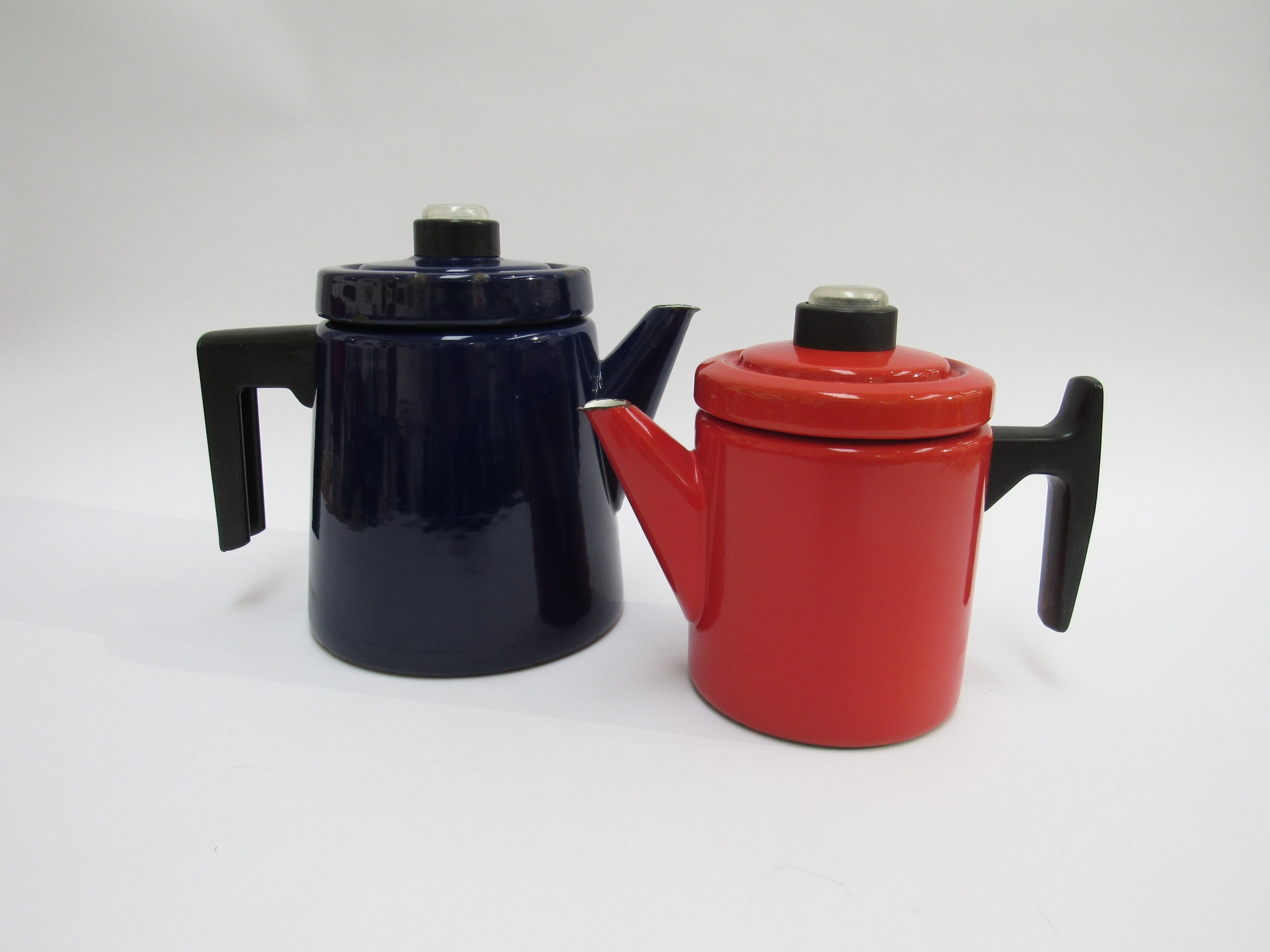 Finel 1960's Finnish enamel coffee pots, one red, 16cm high, one dark blue, 19cm high, designed by Antti Nurmesniemi