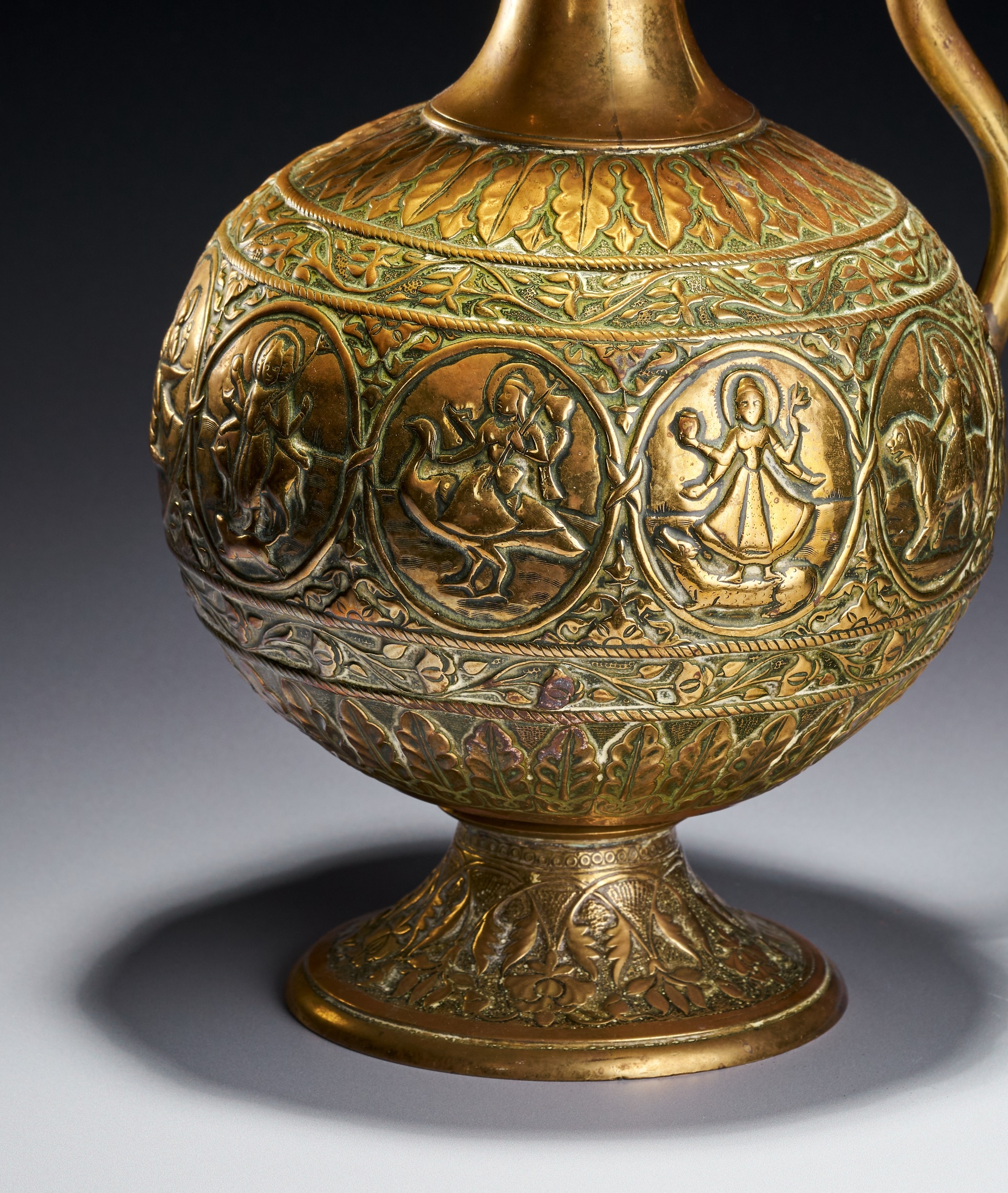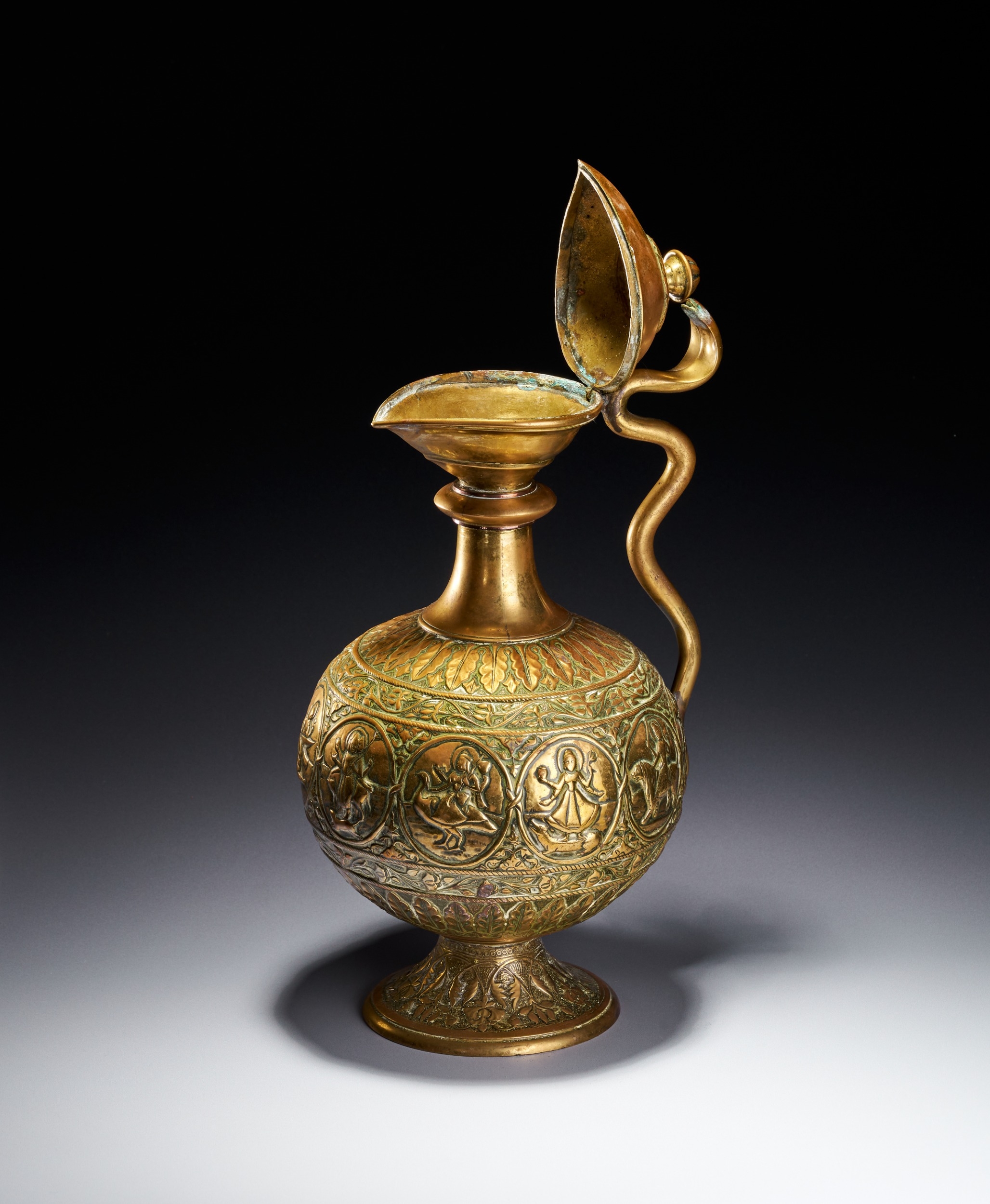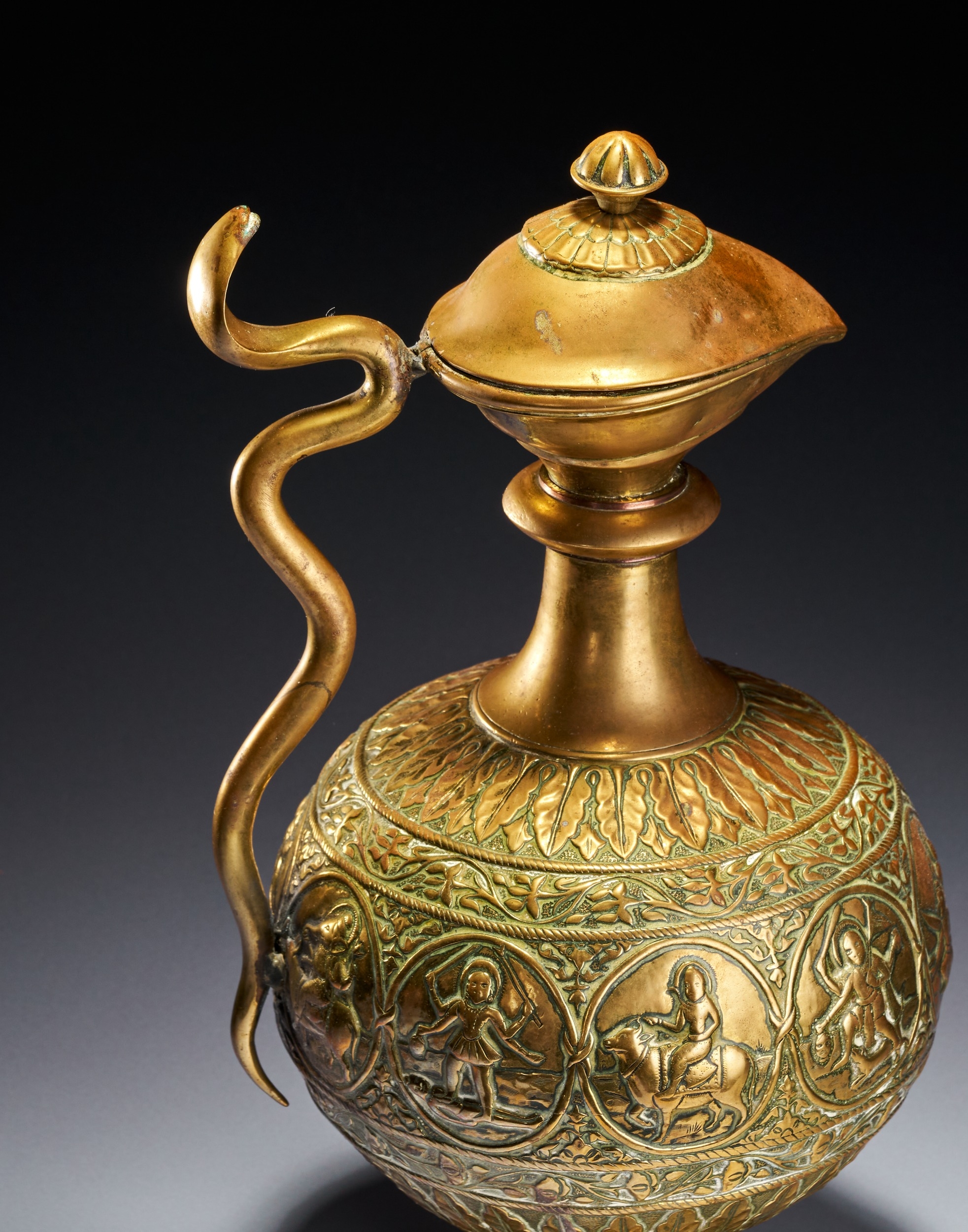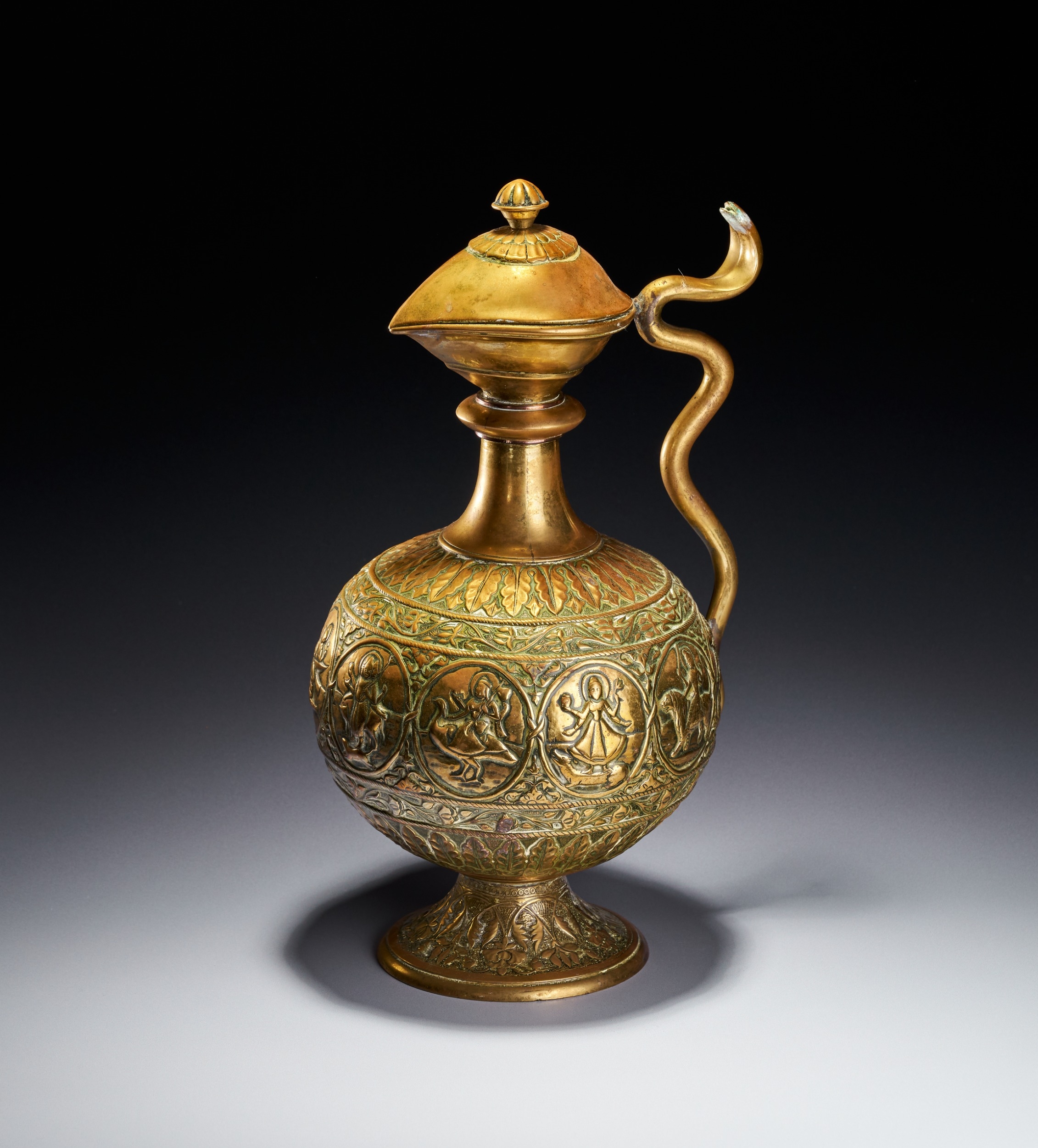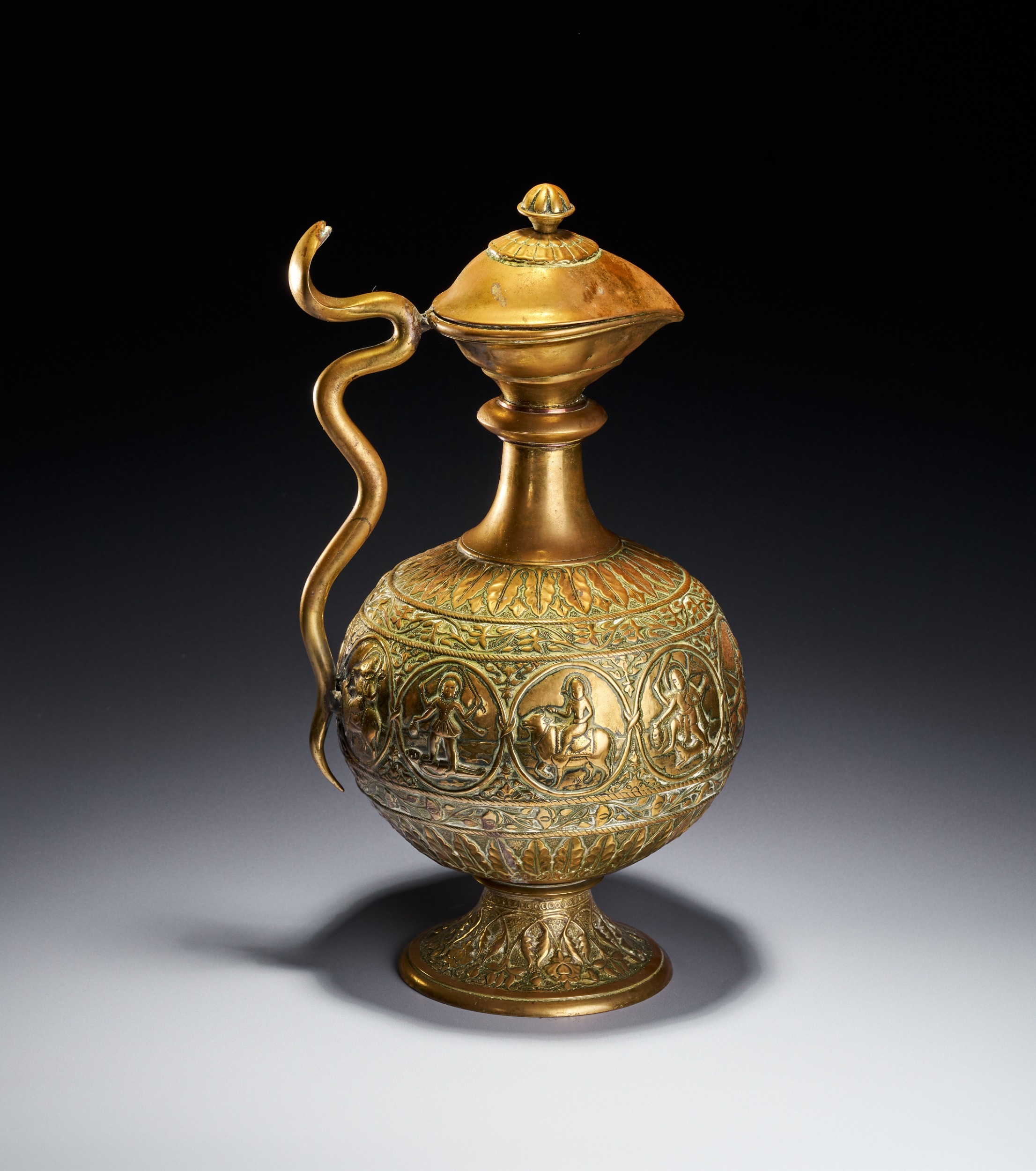 This Indian brass ewer, or aftaba, is constructed from a copper alloy and features a globular body supported by a flared pedestal foot. The vessel is decorated with a central horizontal band of circular medallions containing various figures from Hindu iconography. Identifiable figures include Shiva seated upon the bull Nandi and other multi-armed deities in traditional poses. These medallions are separated by vertical foliate dividers and surrounded by scrolling floral vines. The shoulder and foot are embellished with radiating leaf patterns and textured borders. A sinuous handle modeled in the form of a serpent is attached to the neck and body. The ewer includes a waisted neck leading to a flared rim and a hinged, domed lid topped with a bud-form finial. The underside of the foot shows a recessed foliate pattern and a central circular metal plug from the assembly process.