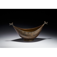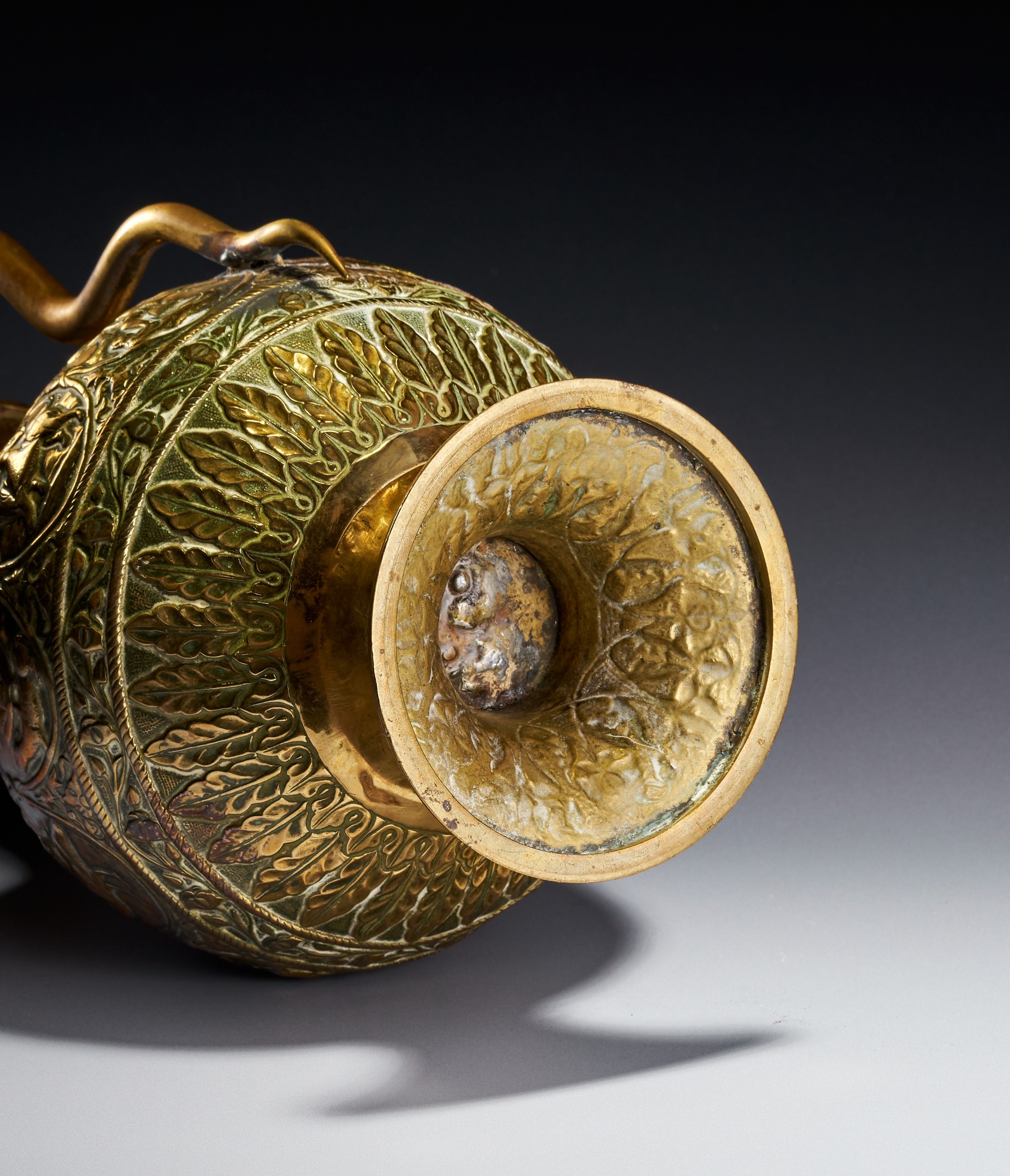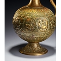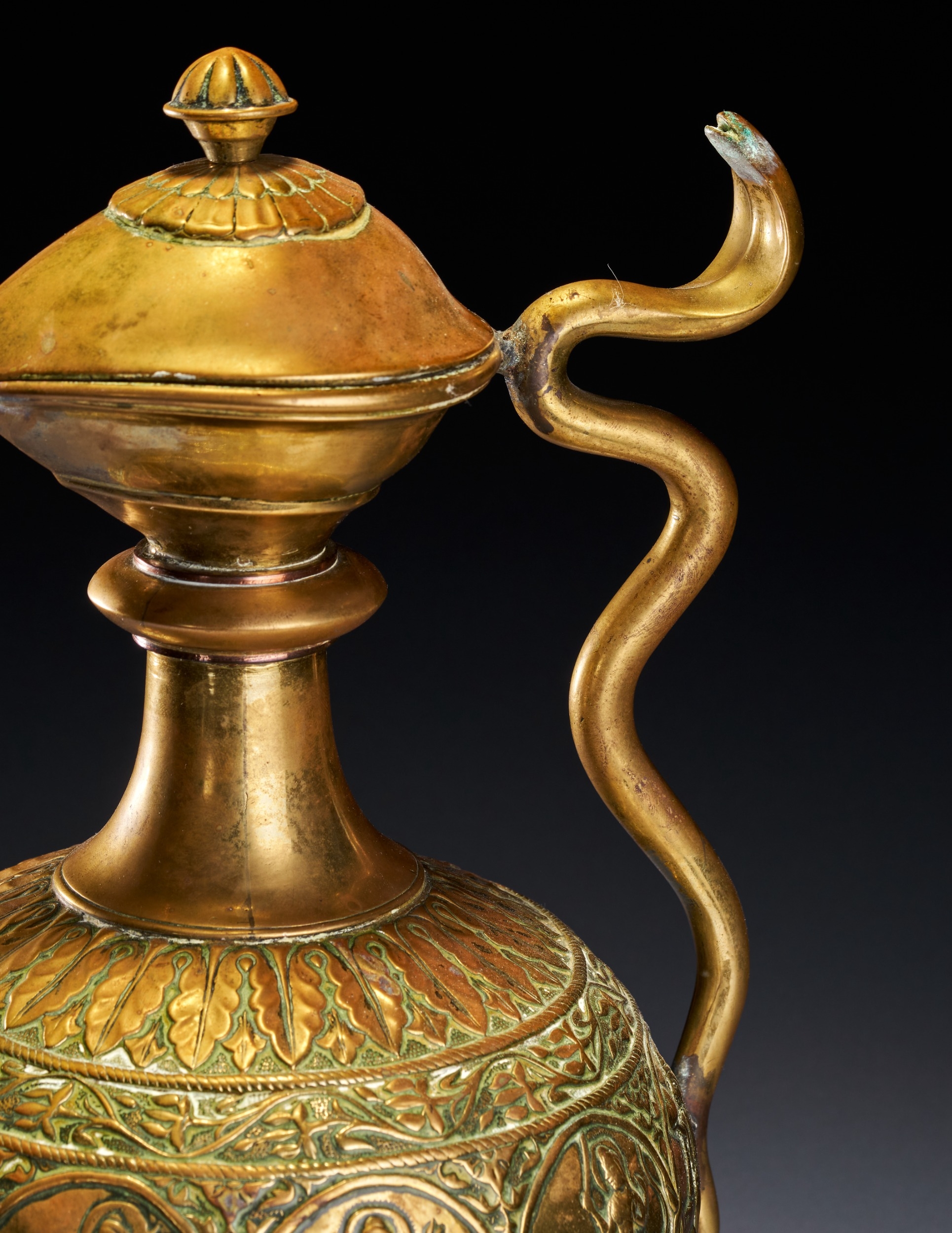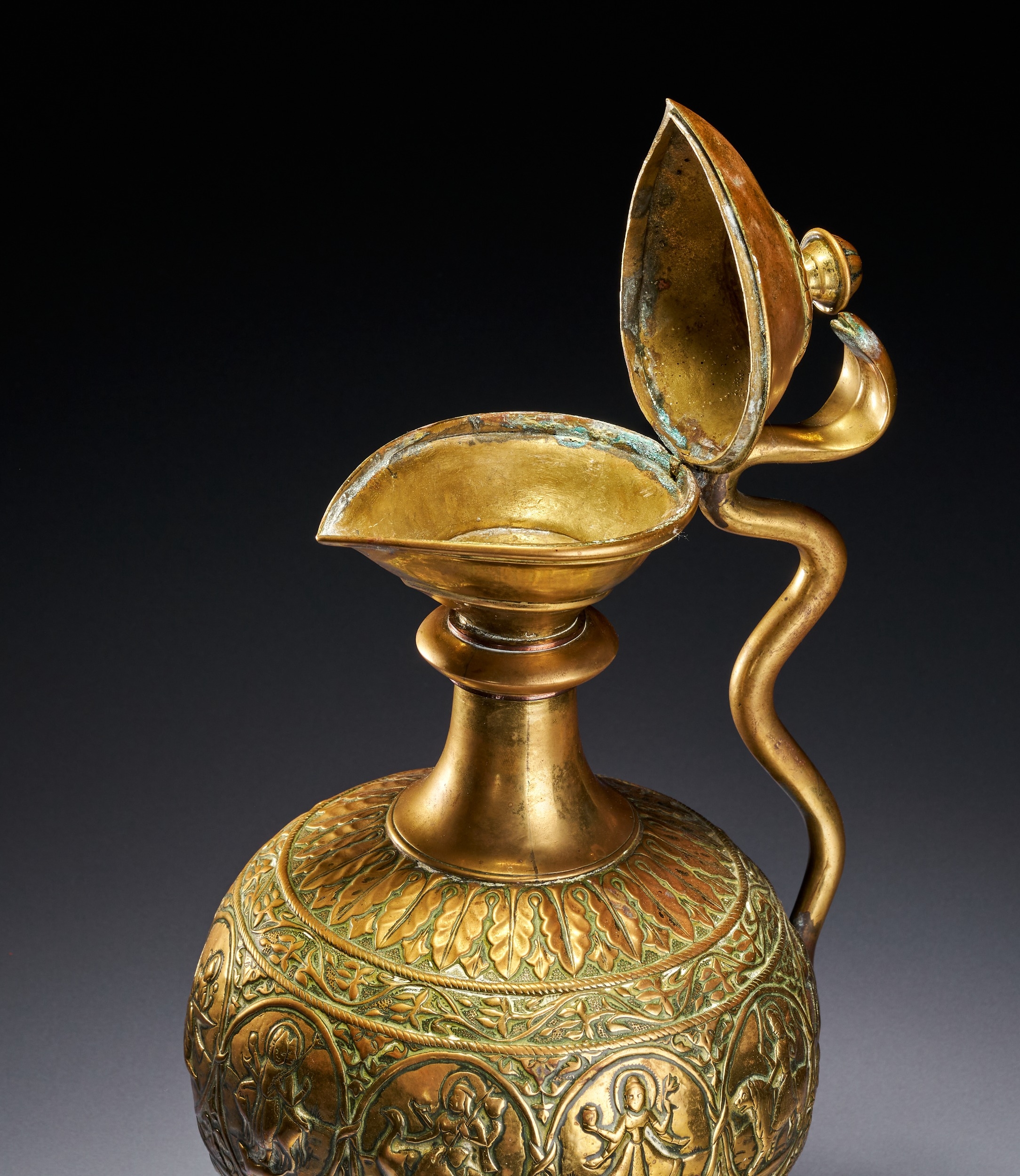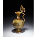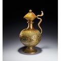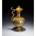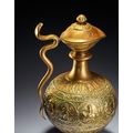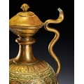 A CHASED BRASS AFTABA EWER WITH SERPENT HANDLE AND HINDU DEITIES, SOUTH INDIA, 19TH CENTURY