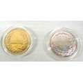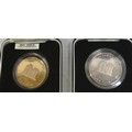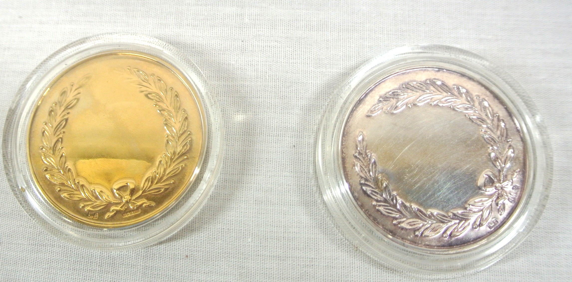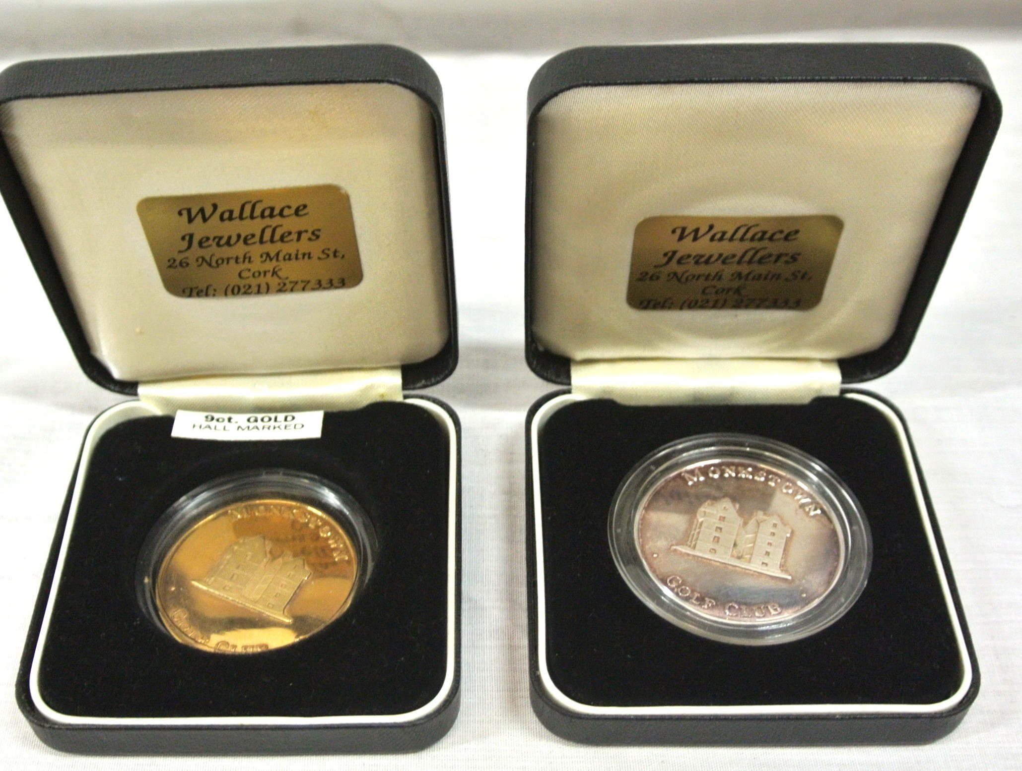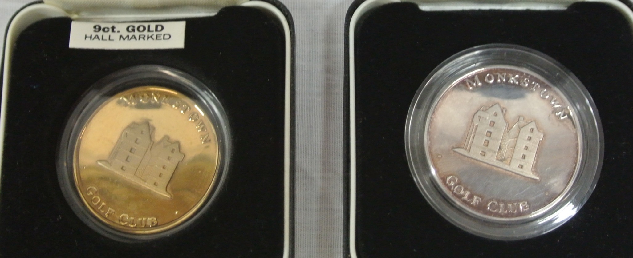 Two commerative Monkstown Golf Club tokens /medals, one 9ct gold hall marked, one silver, in black cases. Stamped Wallace Jewellers, North Main Street, Cork.