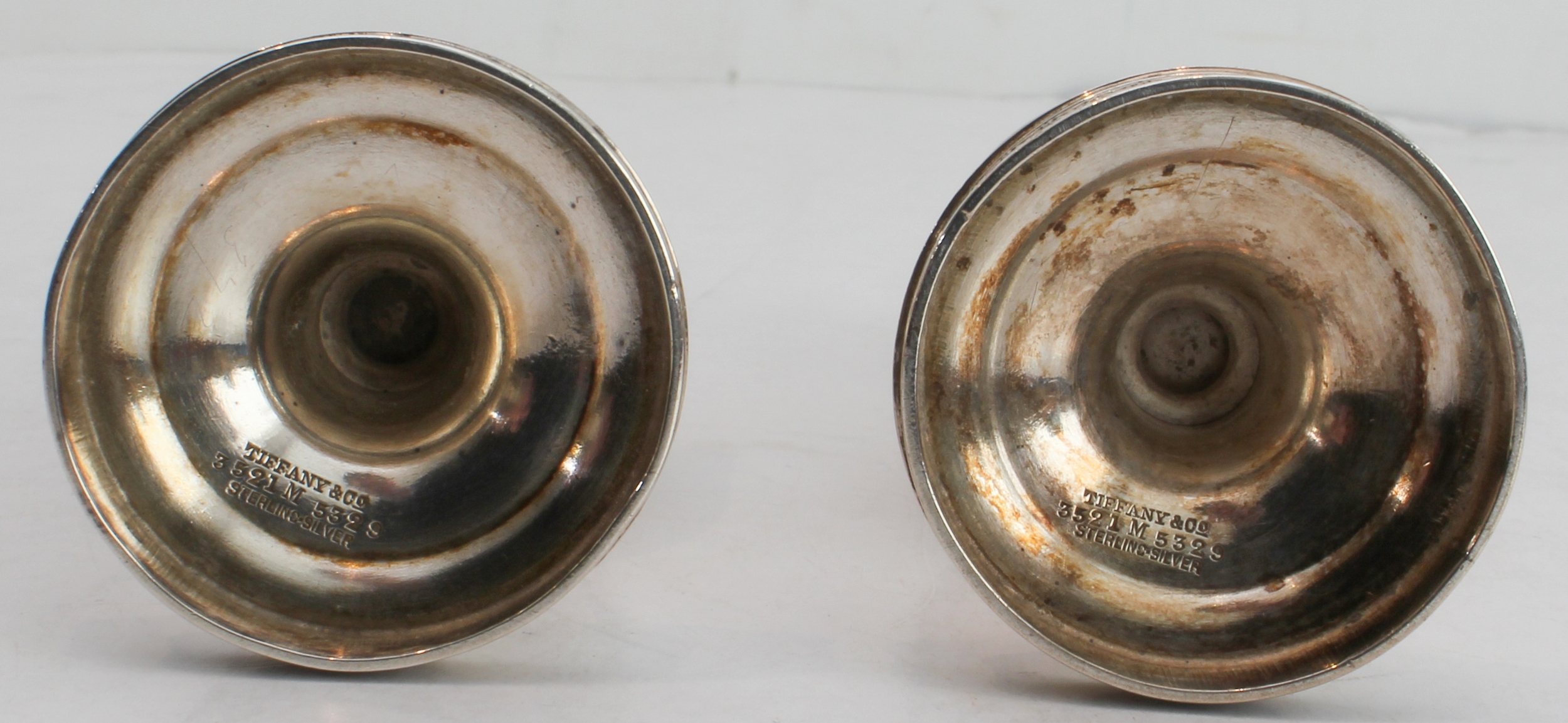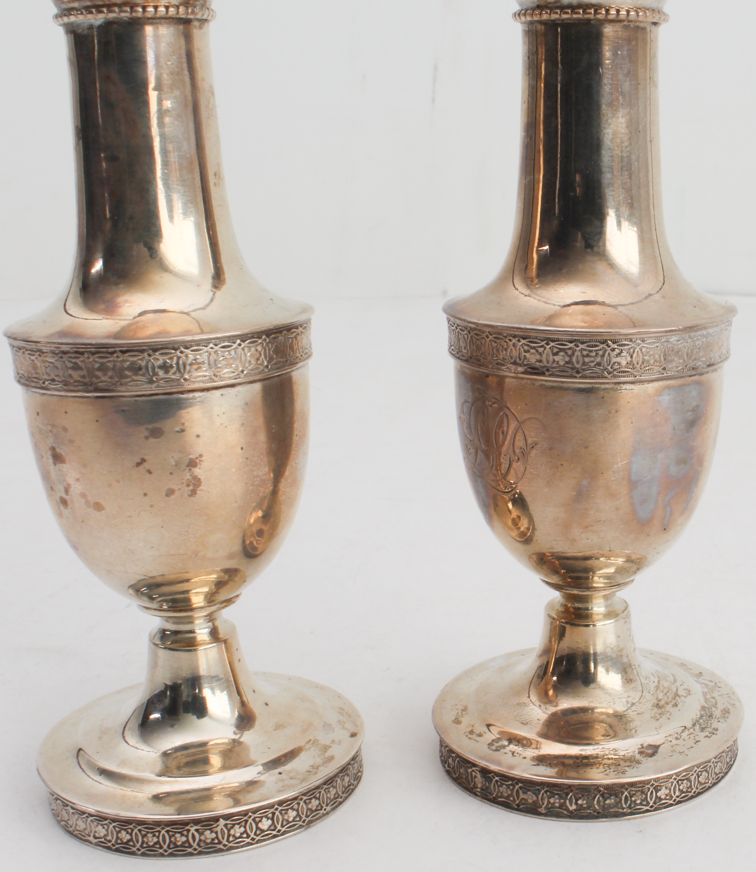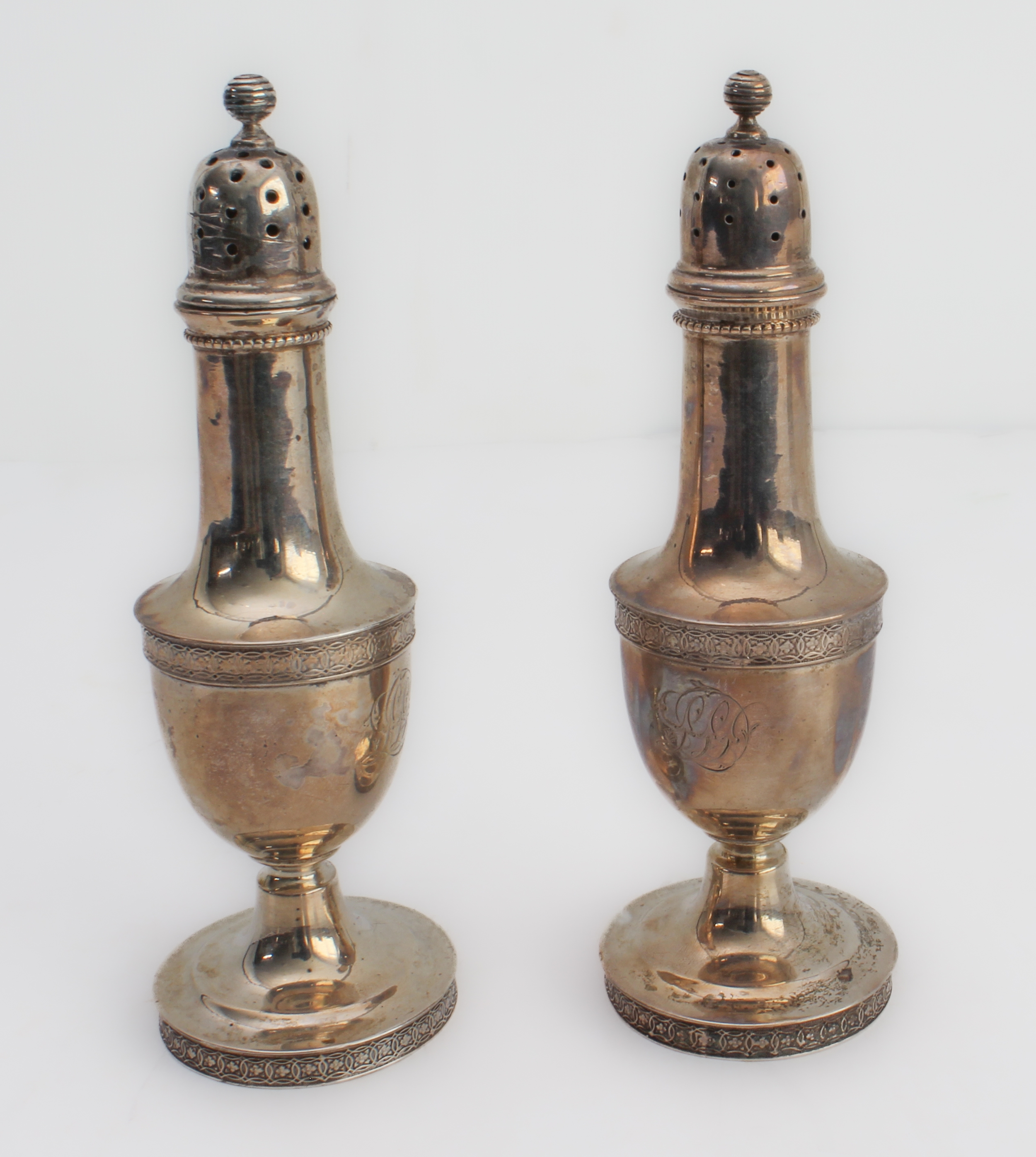 A pair of early 20th century Tiffany & Co. sterling silver pepperettes, each with Celtic-style bands and engraved with monogram (12.5 cm high). (Total weight approx. 119 g)
