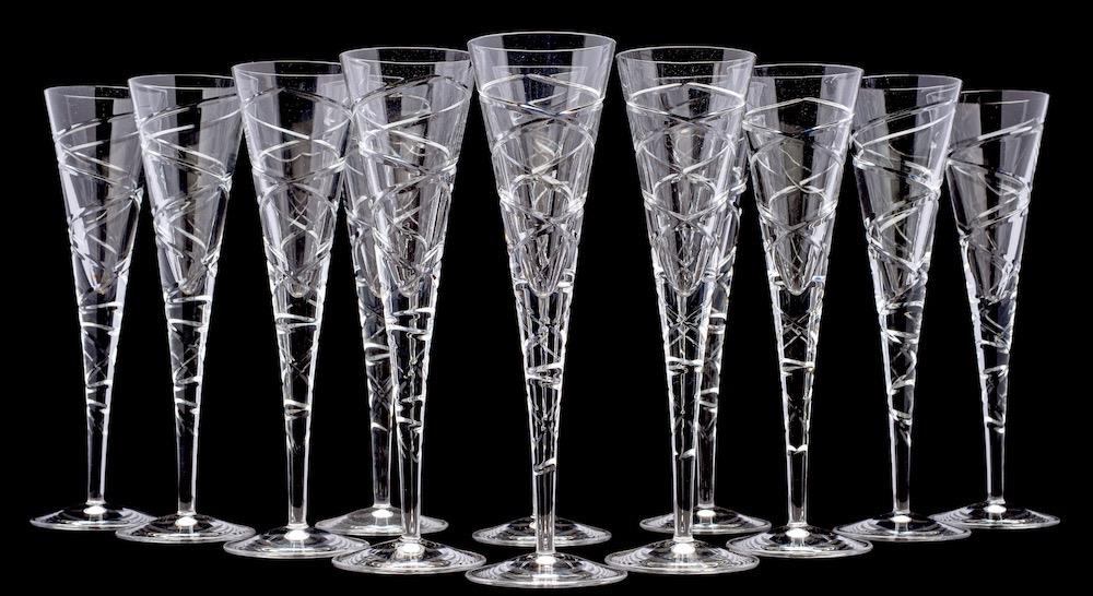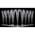 Twelve contemporary 'cross swirl' champagne flutes, with cut decoration to the bowl and stem, 27cm high.