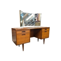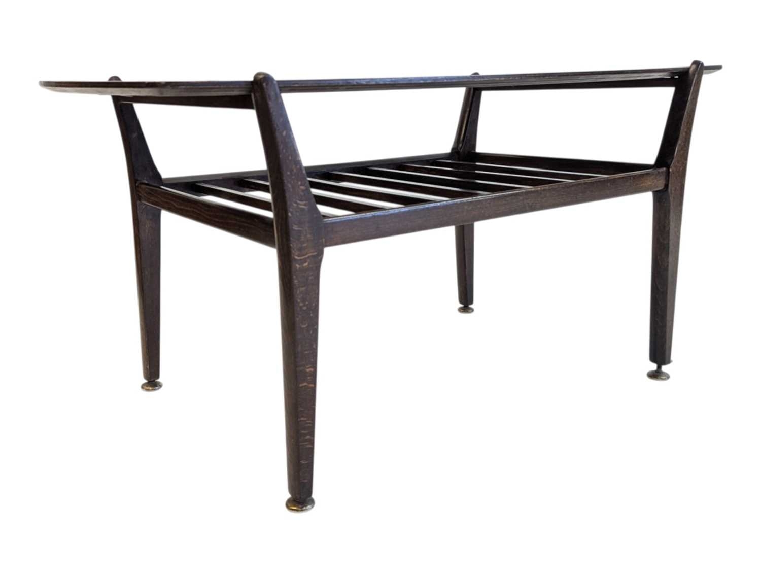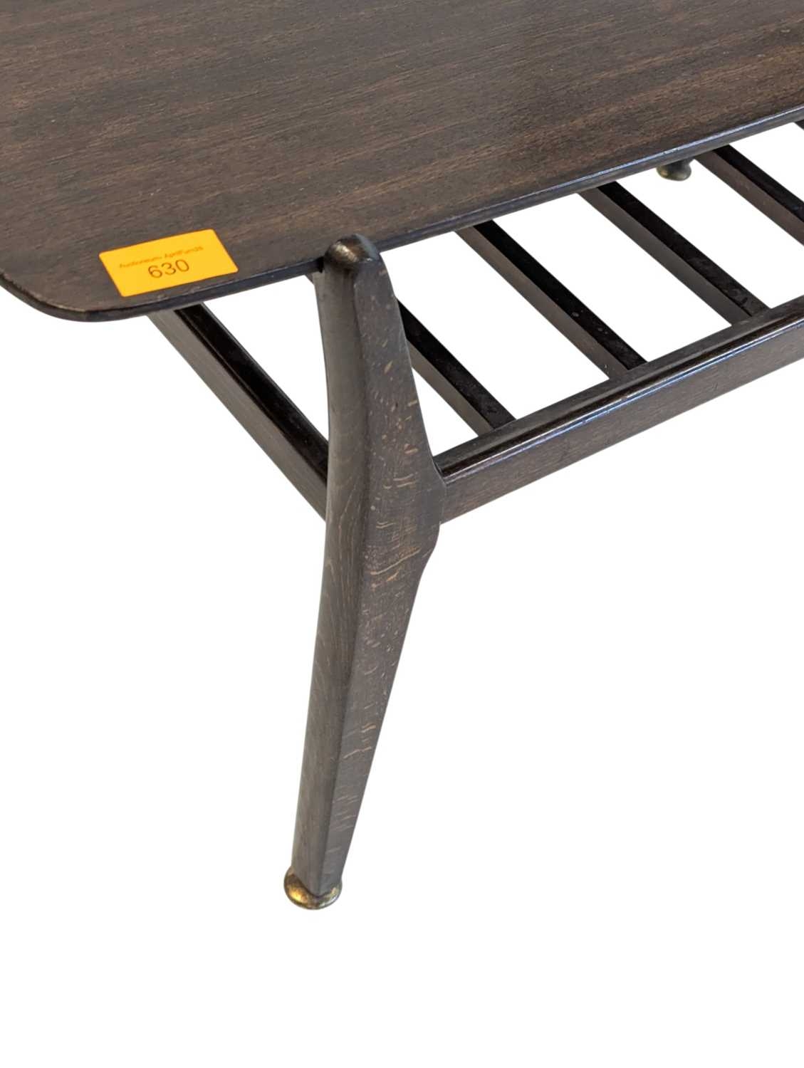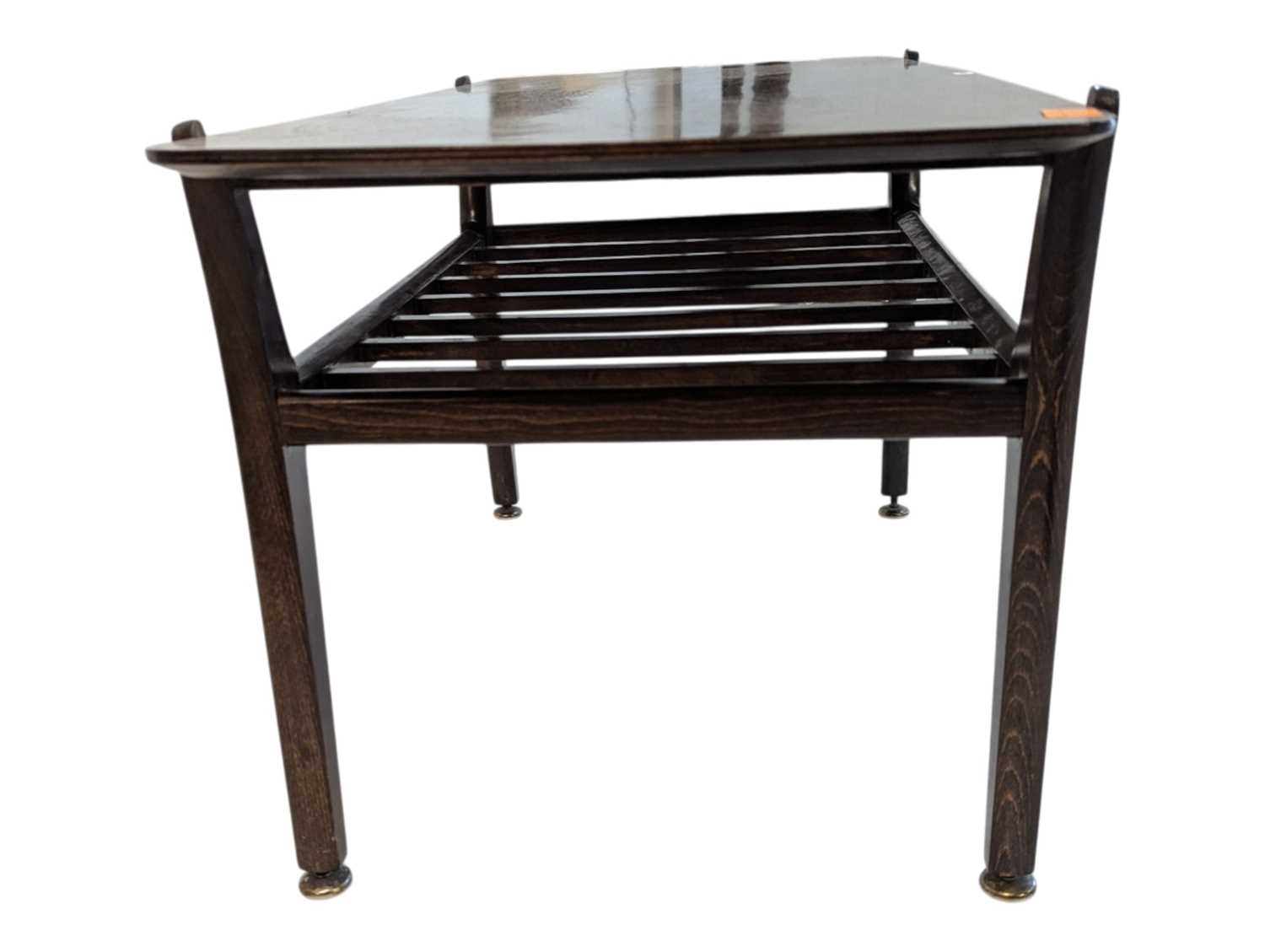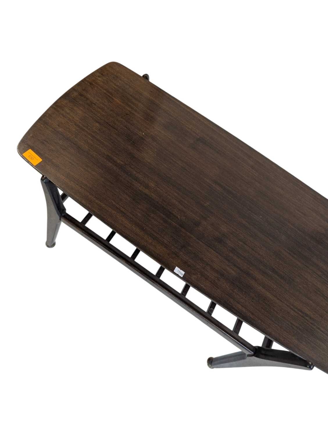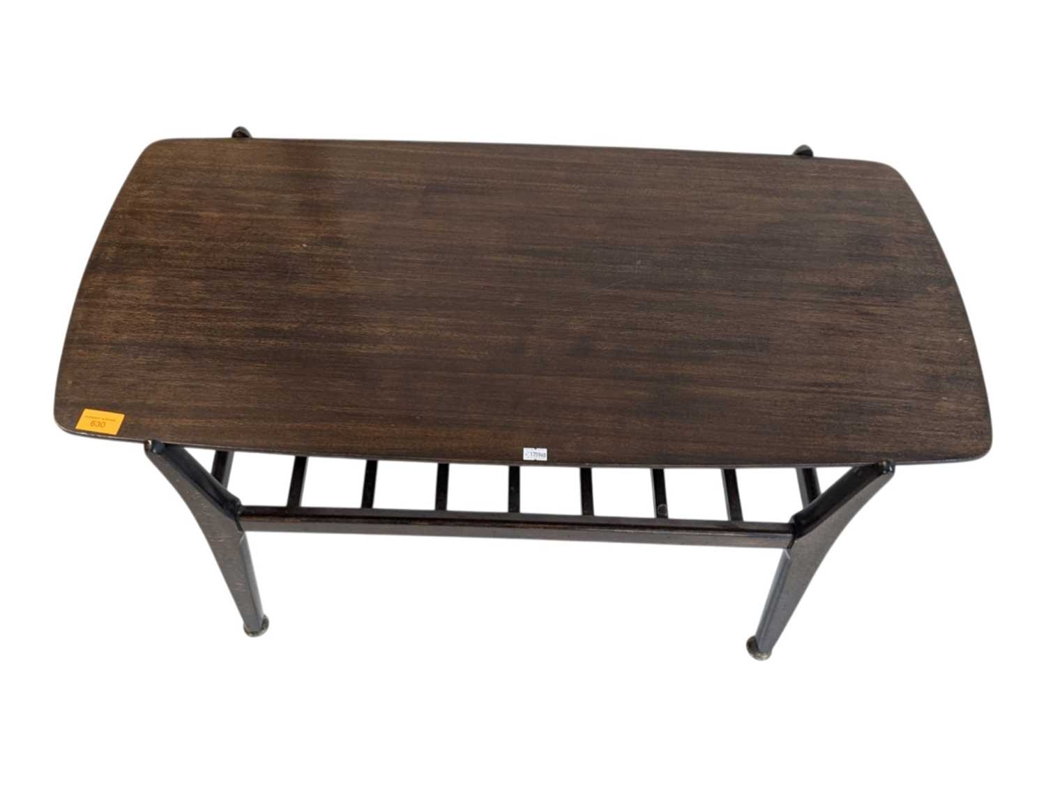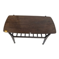 British Modern Design - Mid century teak wood coffee occasional table raised on shaped legs with magazine rack and rectangular top above. Measures approx: 45x90x44cm