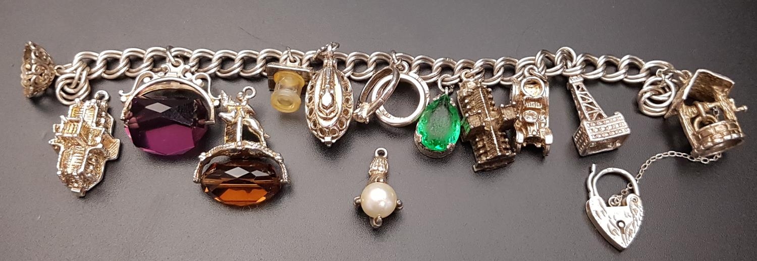 with silver double curb link bracelet with silver heart padlock clasp and mostly silver charms (three unattached from bracelet) including two swivel fobs, a well with hanging bucket, an articulated cathedral opening to reveal a wedding, a vintage motor car and Blackpool tower, total weight approximately 64.7 grams