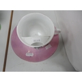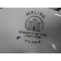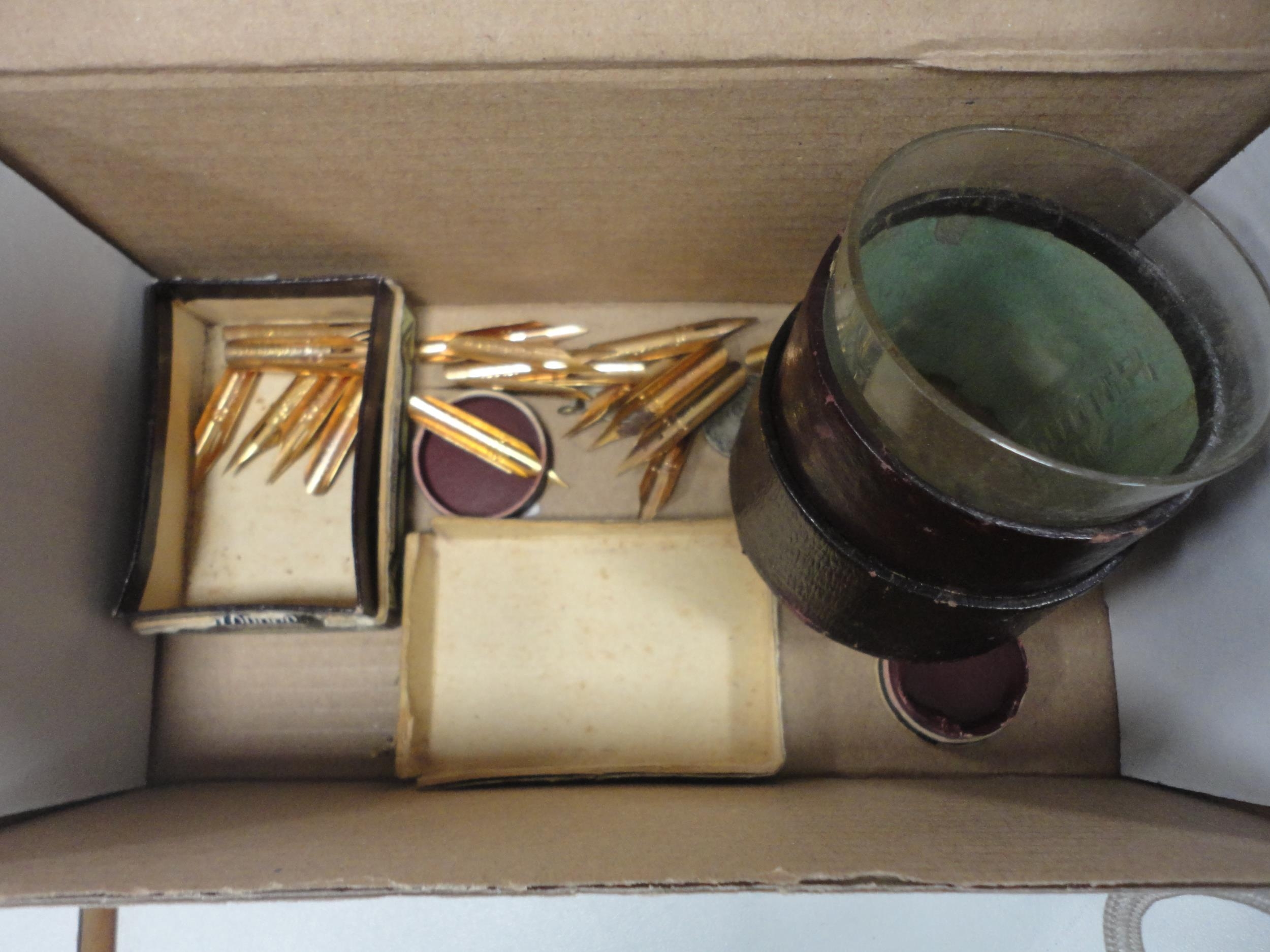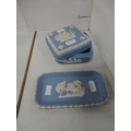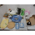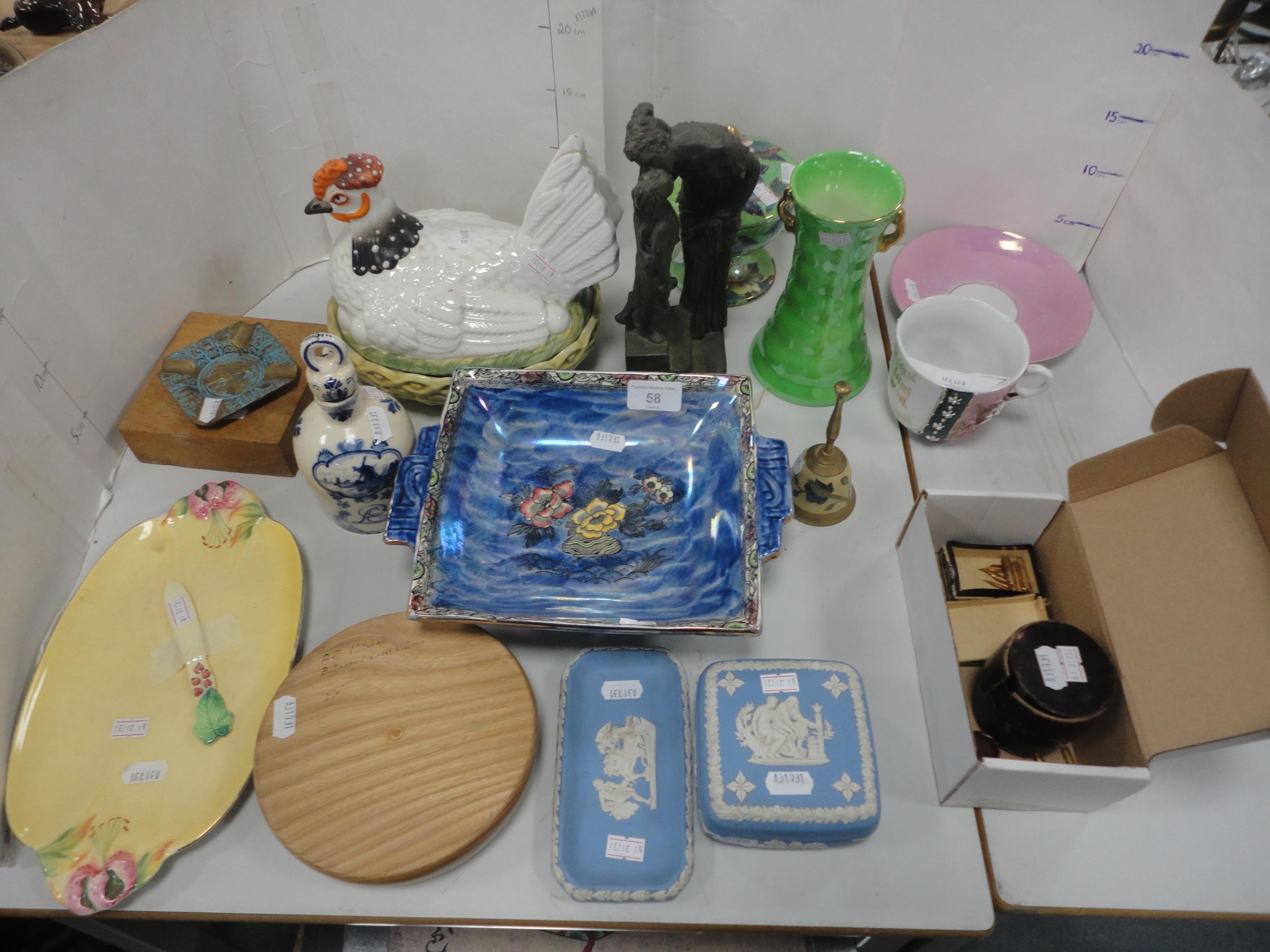 Group of mixed ceramics to include pen nibs, Wedgwood Jasper ware trinket box, moustache cup and saucer, Maling dish and cover vase, Delft oil bottle and stopper, hen tureen, Miró figure of a woman and child on stand etc.