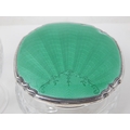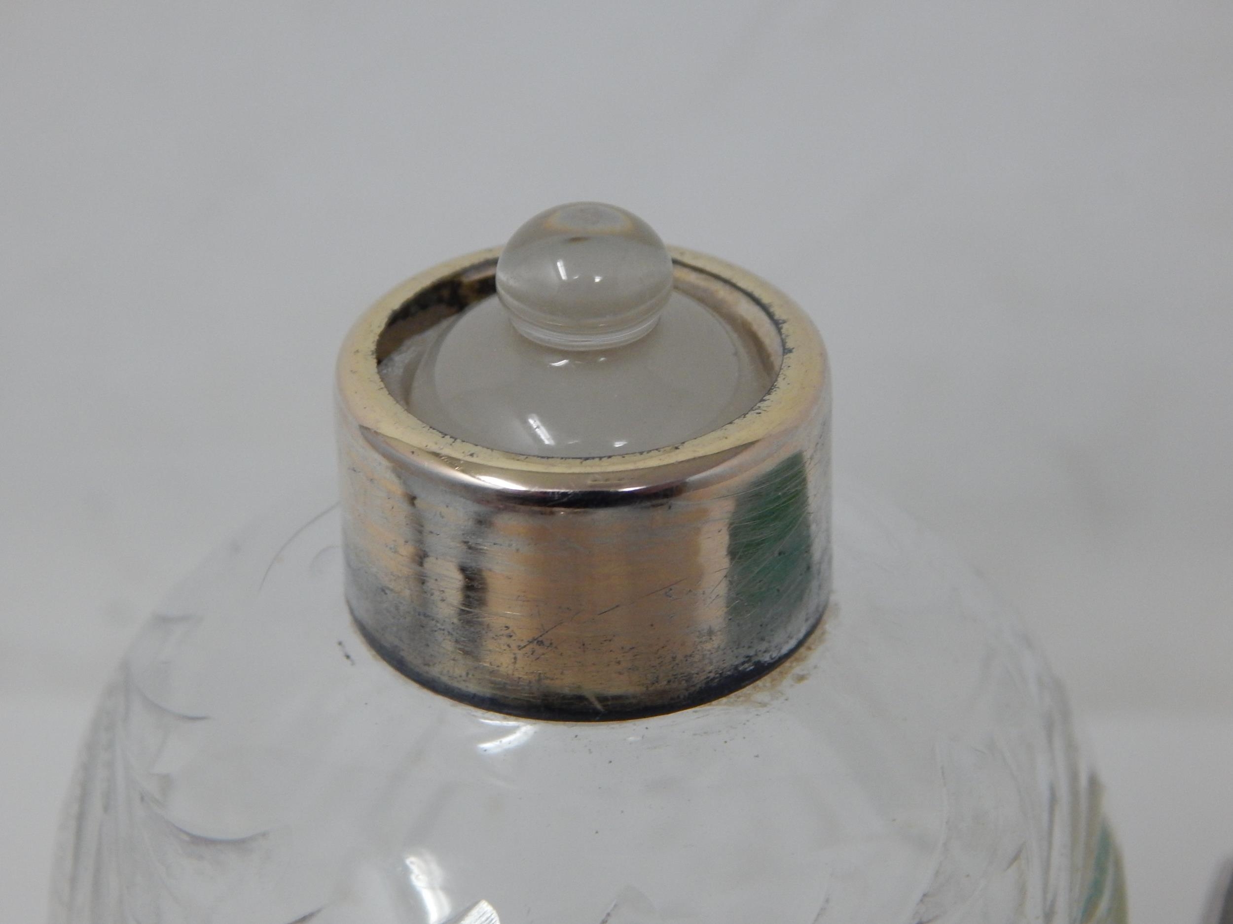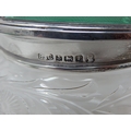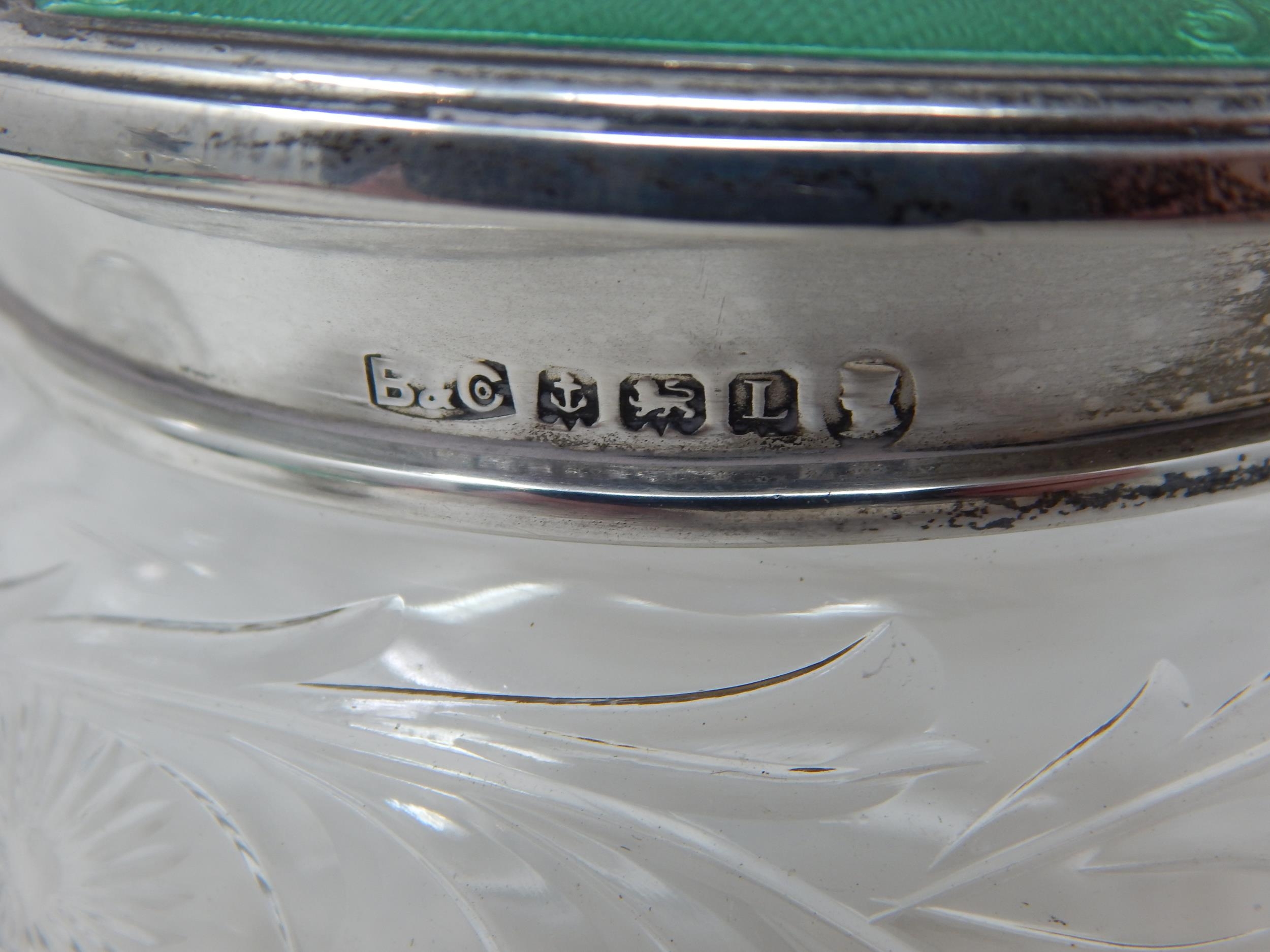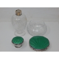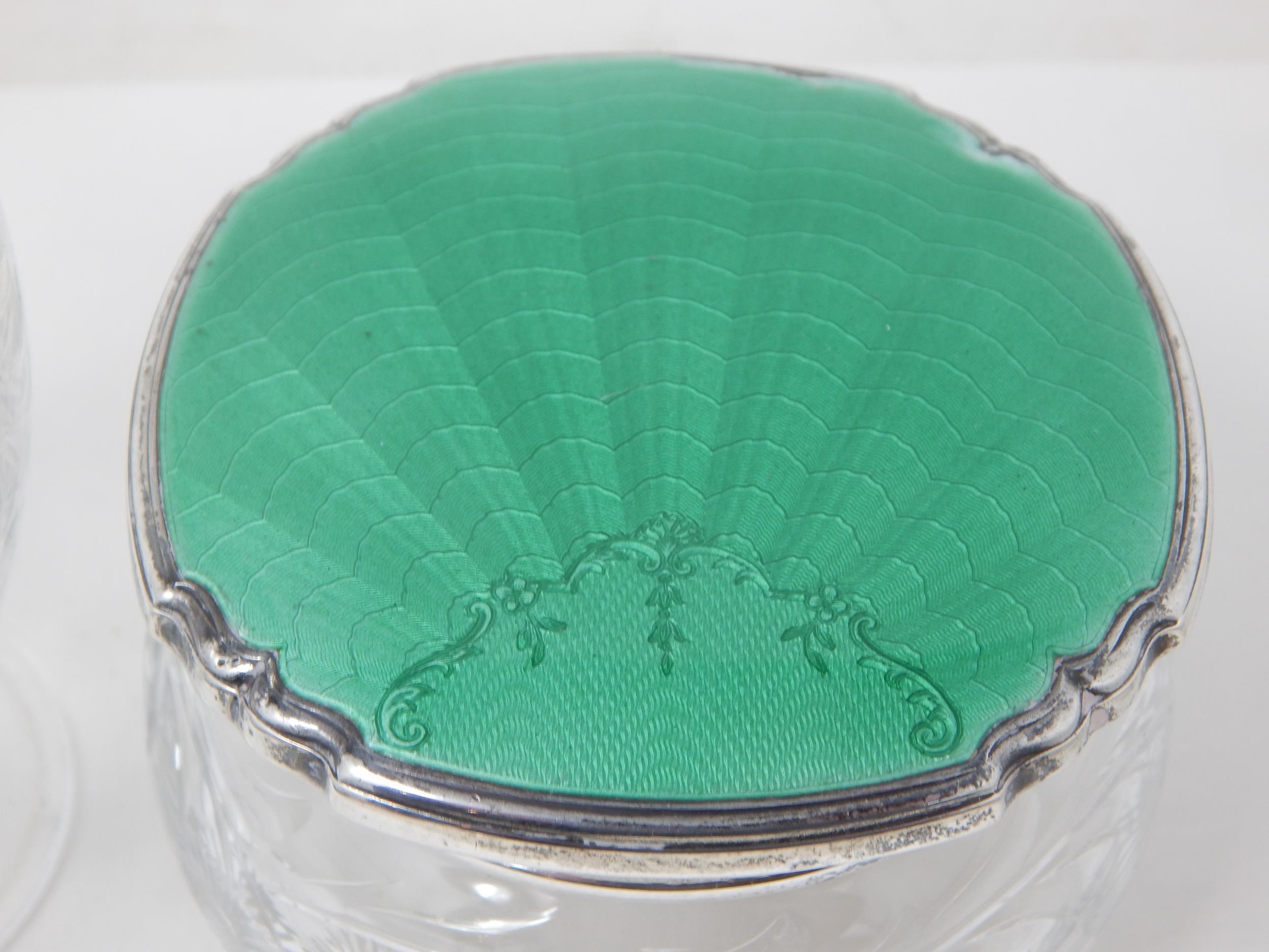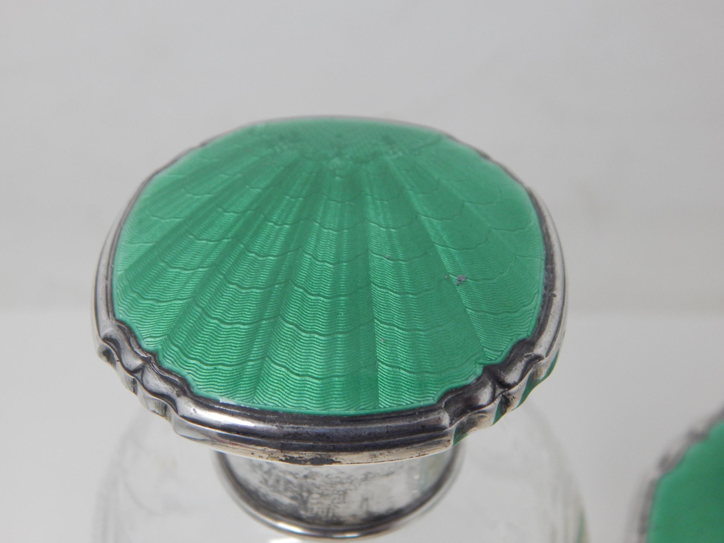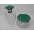 Art Deco Silver & Green Guilloche Enamel Scent Bottle with Stopper 13.5cm high together with a Matching Powder Jar: Hallmarked Birmingham 1936 by Broadway & Co