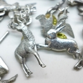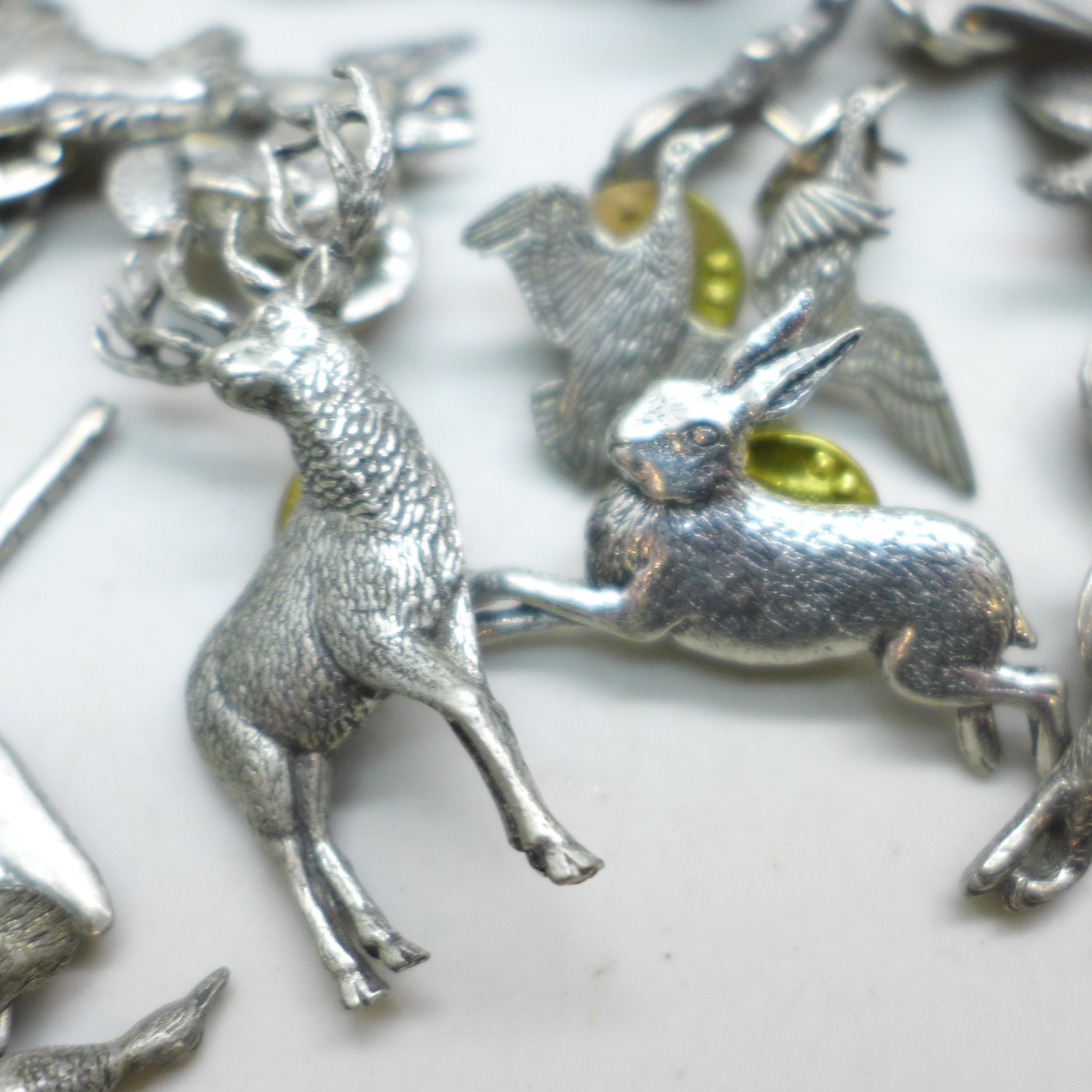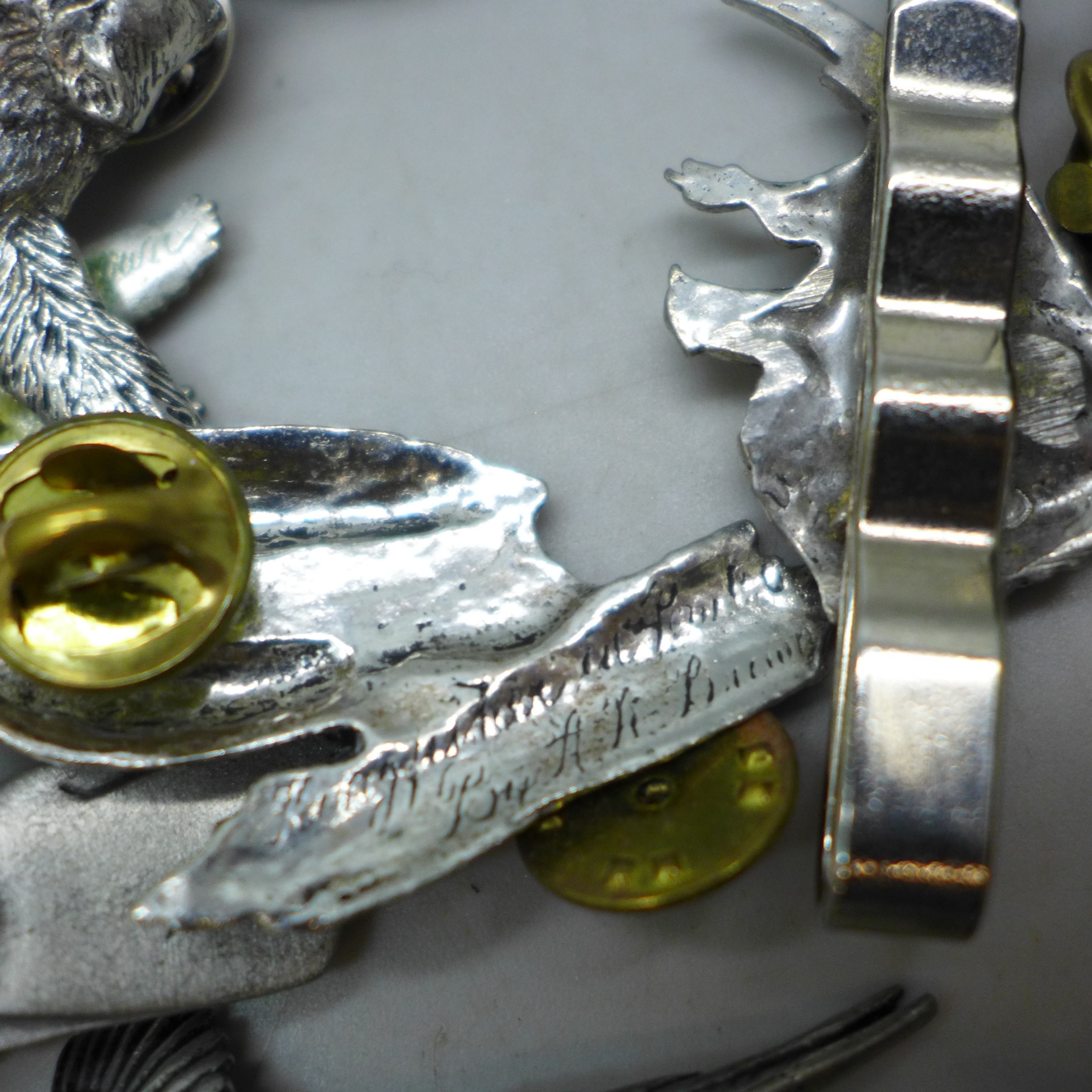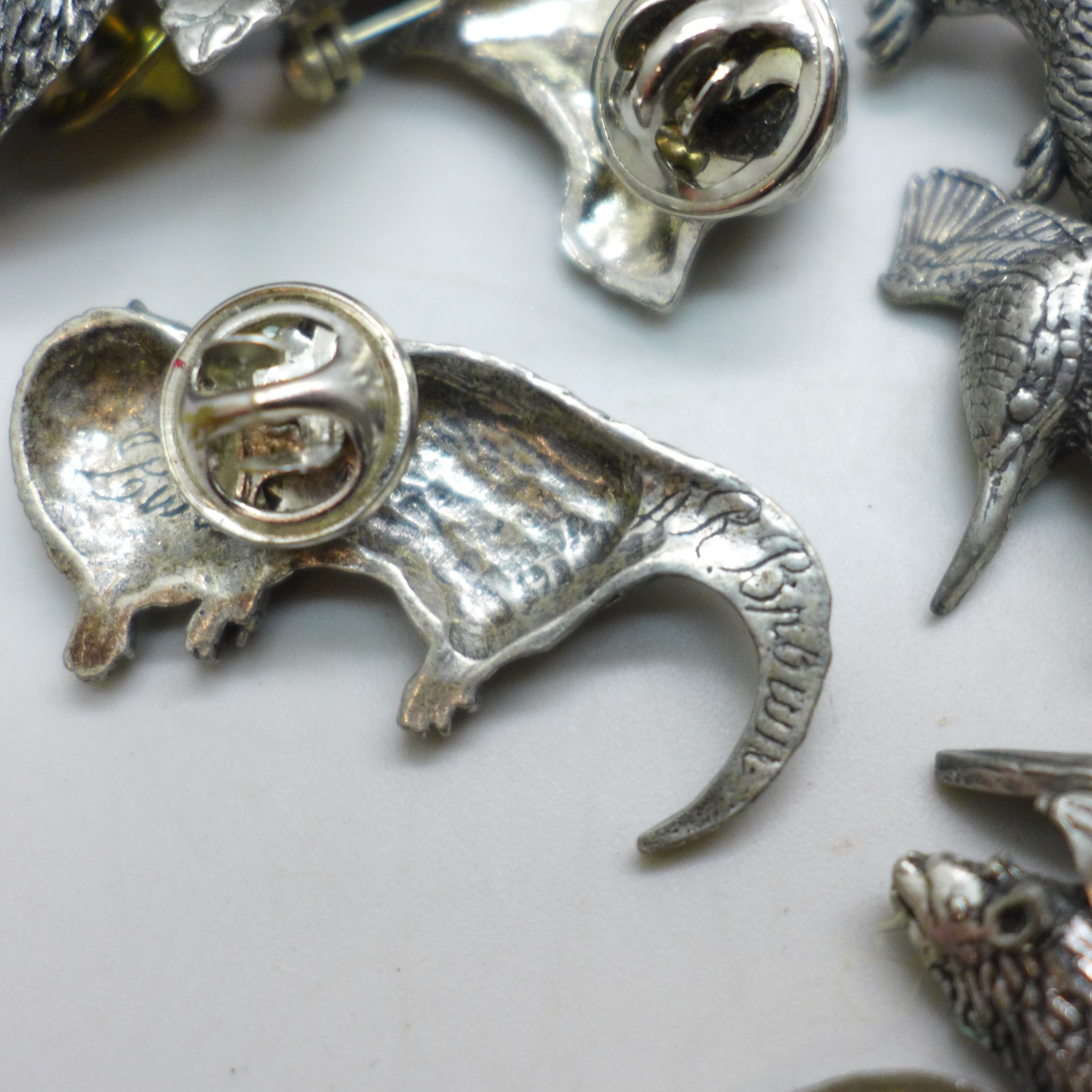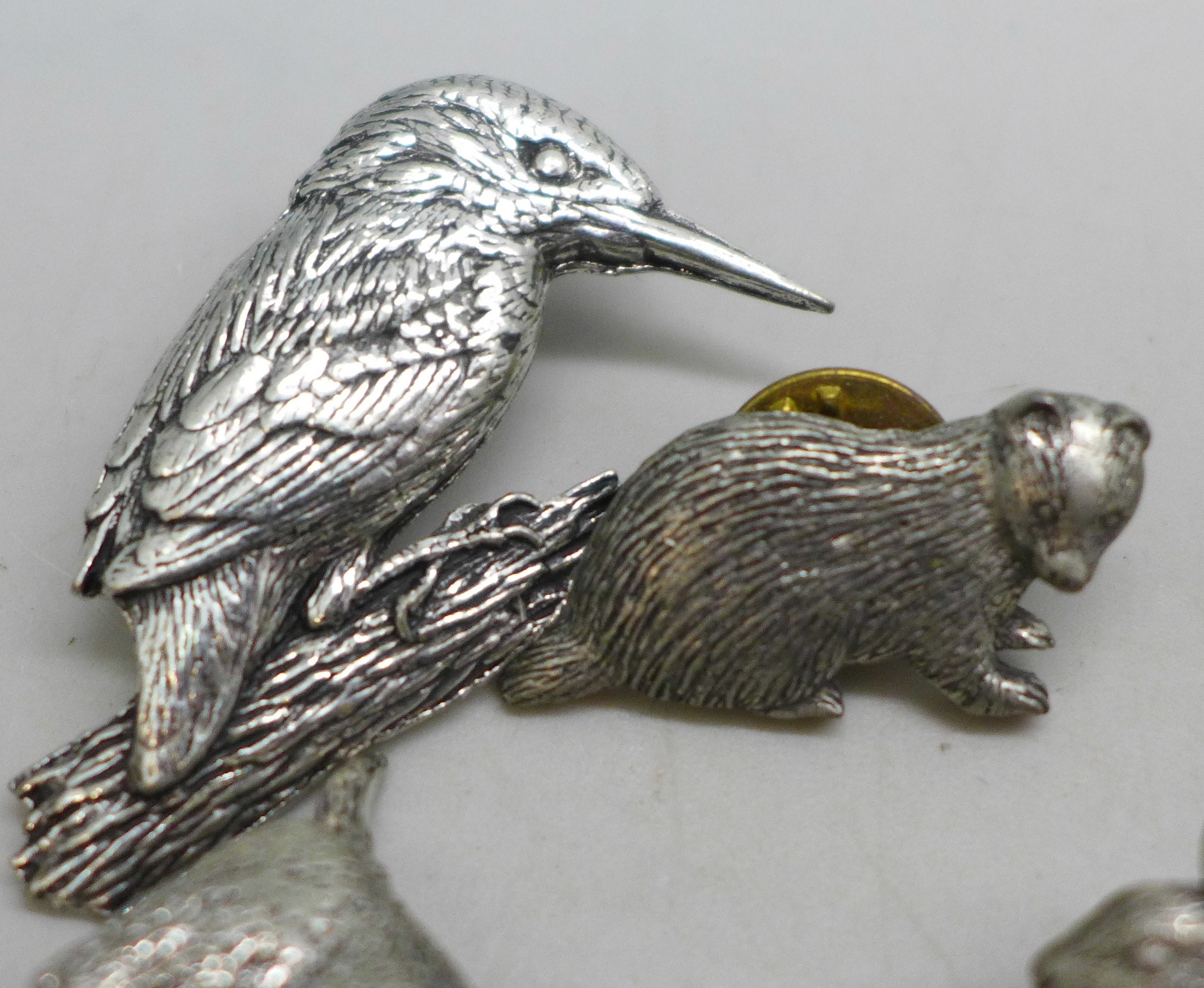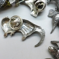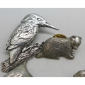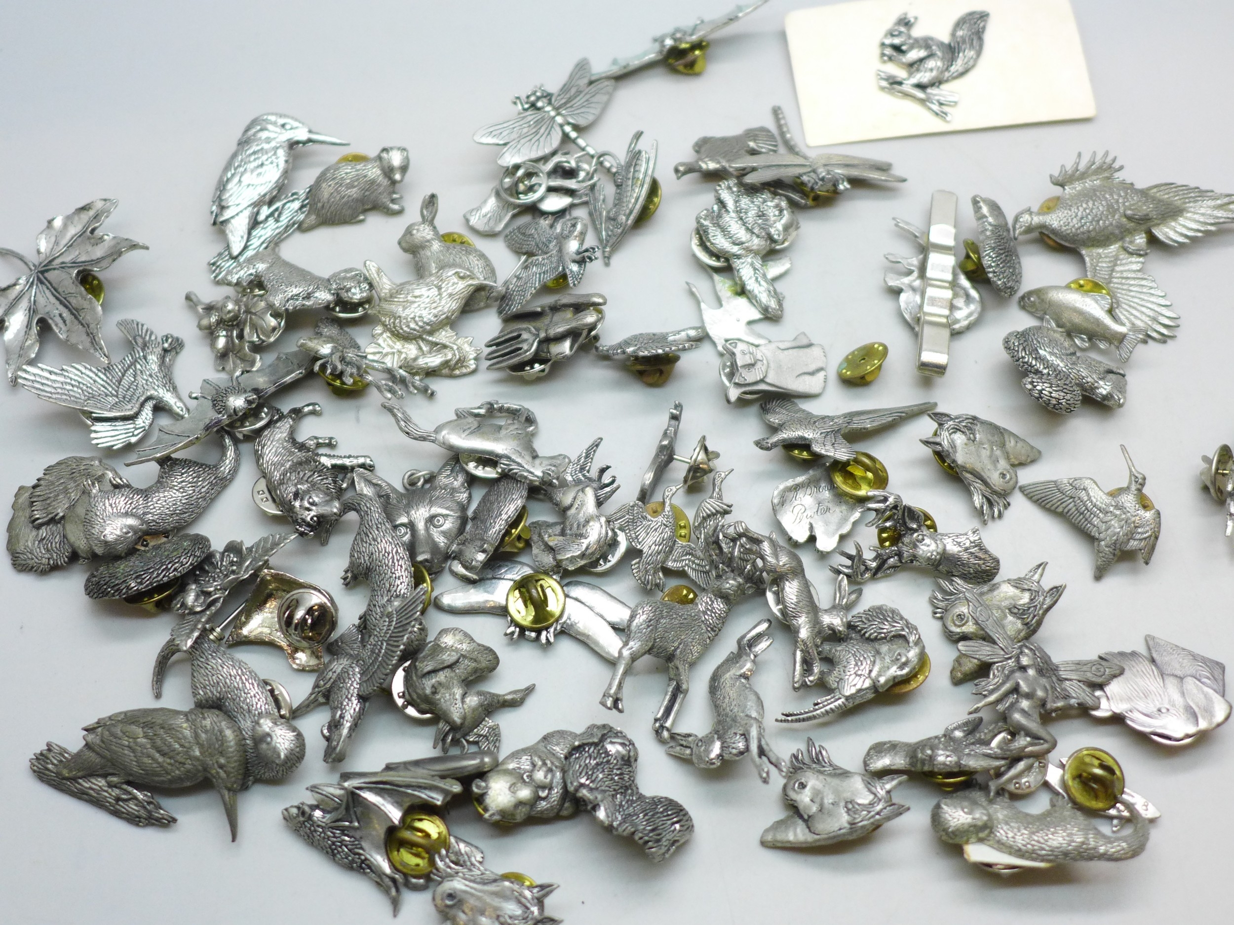 A collection of pin badges, animals and birds