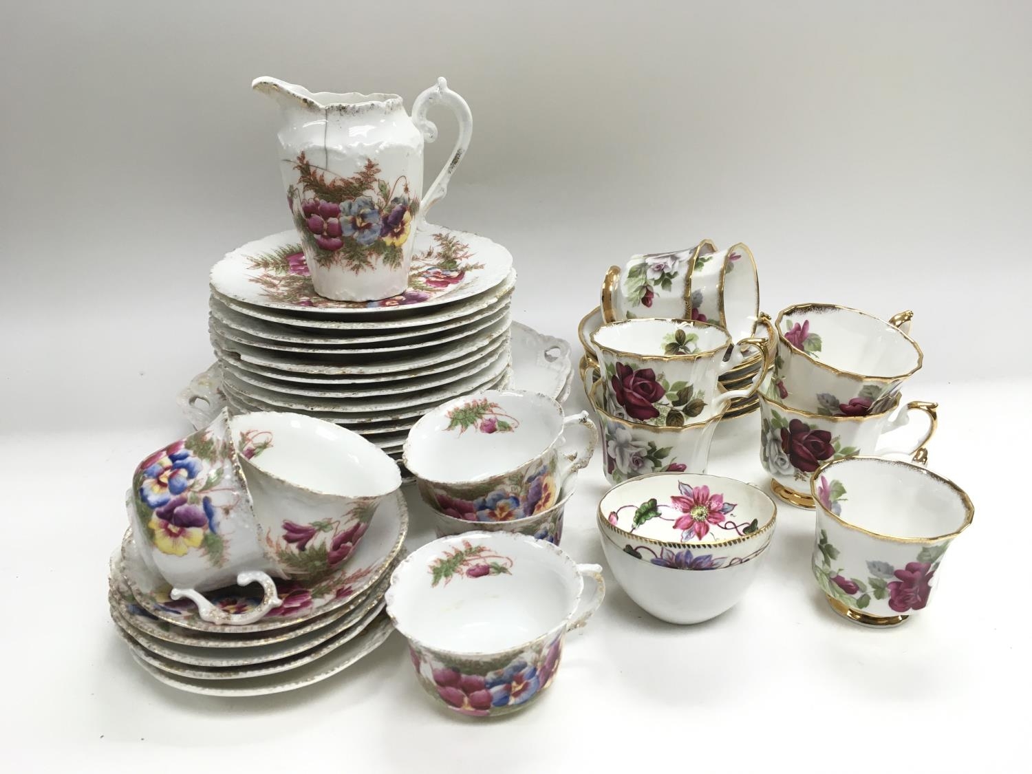 Two decorative china tea sets decorated with flowers on a white ground. NO RESERVE.