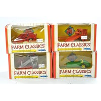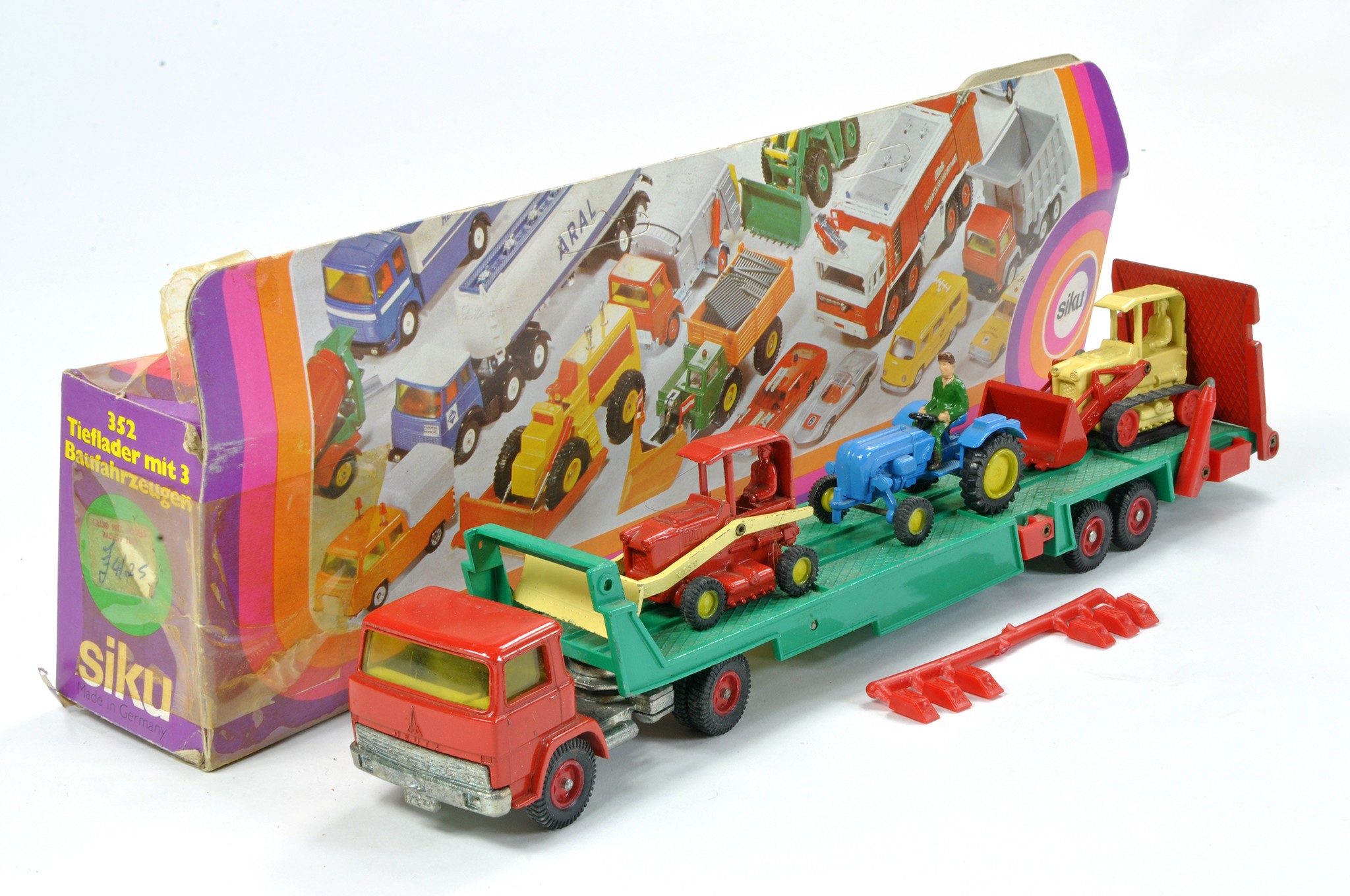 Siku vintage Set no. 352 comprising truck and low loader with trio of vehicle loads including crawler tractor x 2 plus tractor. Generally very good to excellent, a few minor marks in fair box, missing cellophane and with tears and significant storage wear.
