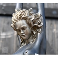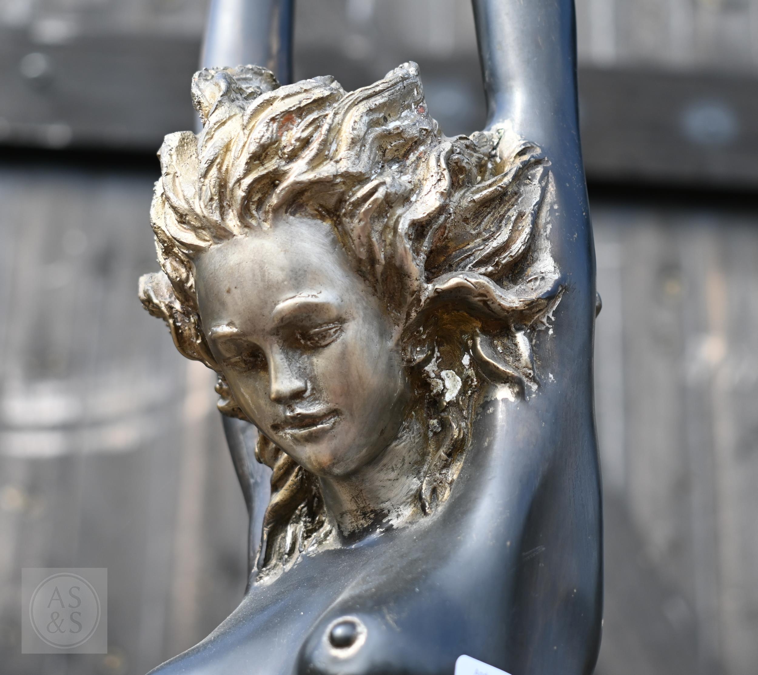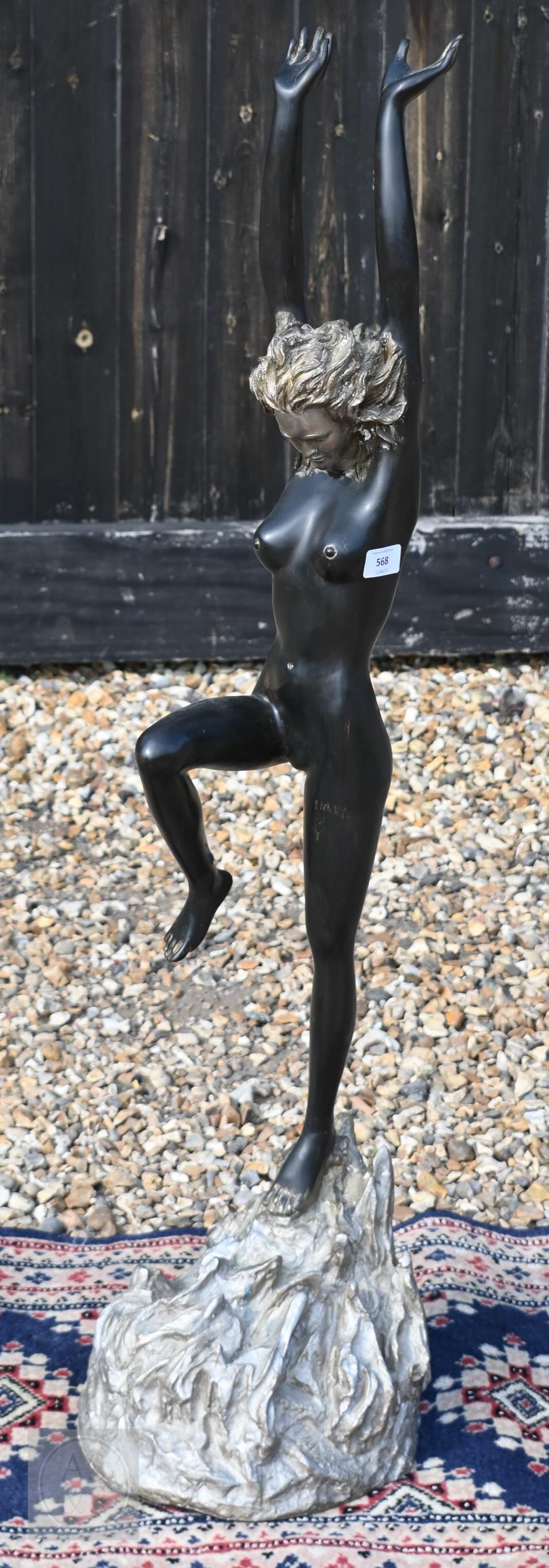 A large bronzed figure of a nude dancer with arms raised, 110 cm high