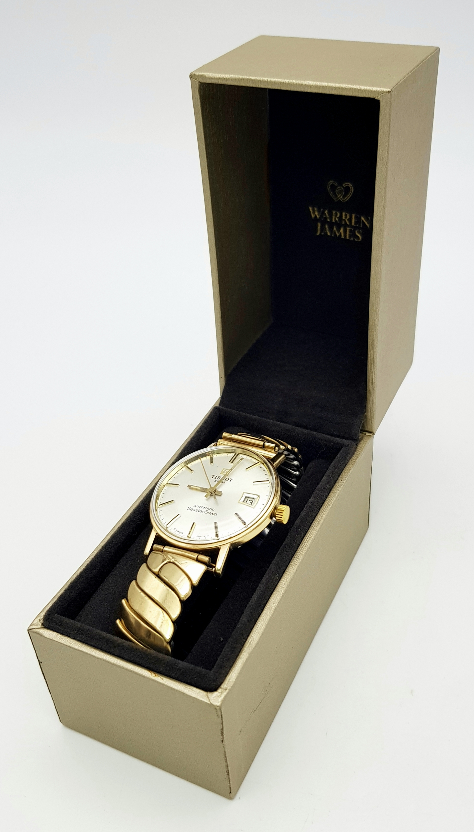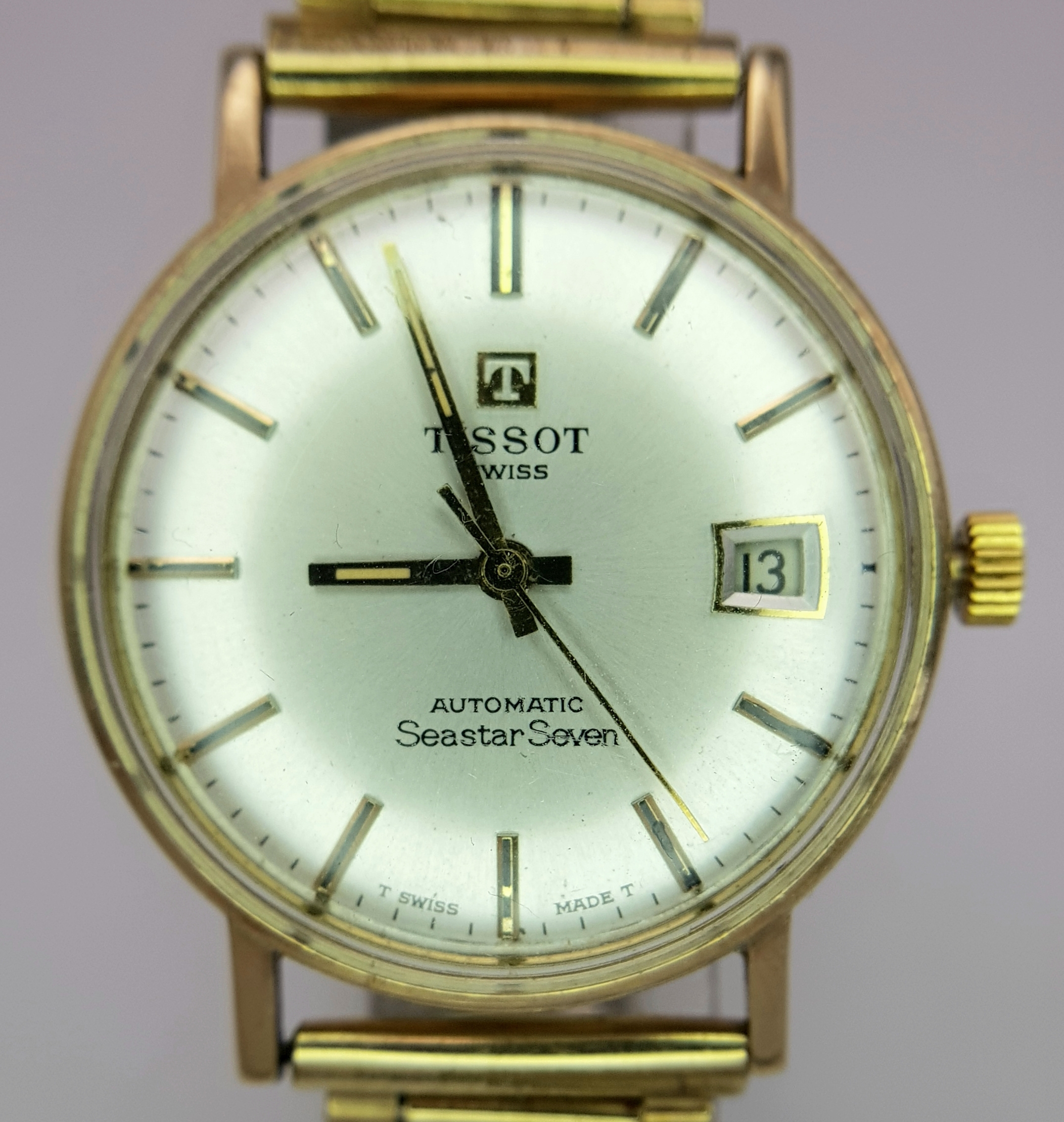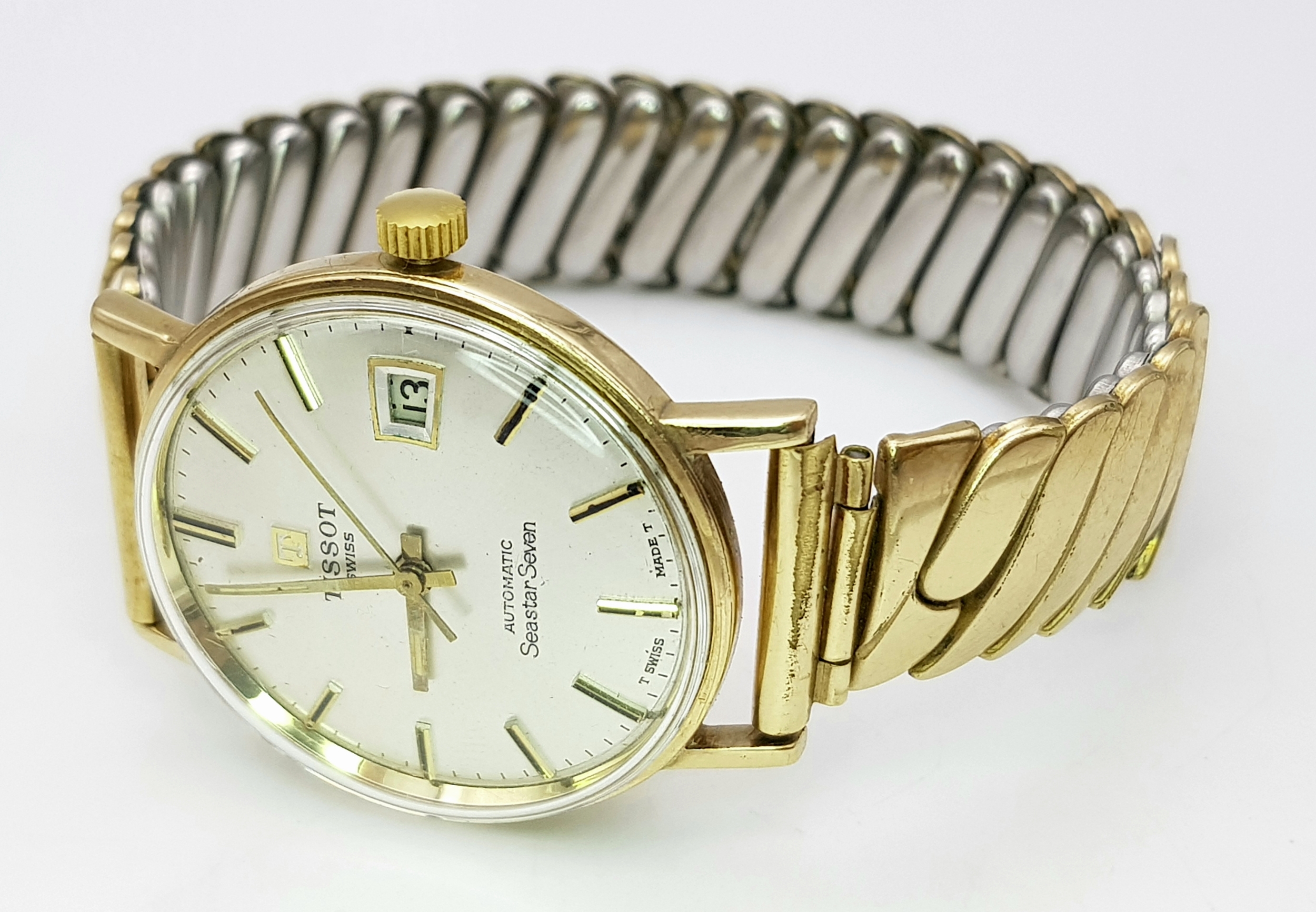 A Classic Tissot Automatic Seastar Seven Watch. Circa 1960s. Expandable bracelet. 9K gold case - 33mm. Silver-toned dial with date window. In working order. Ref: 62001