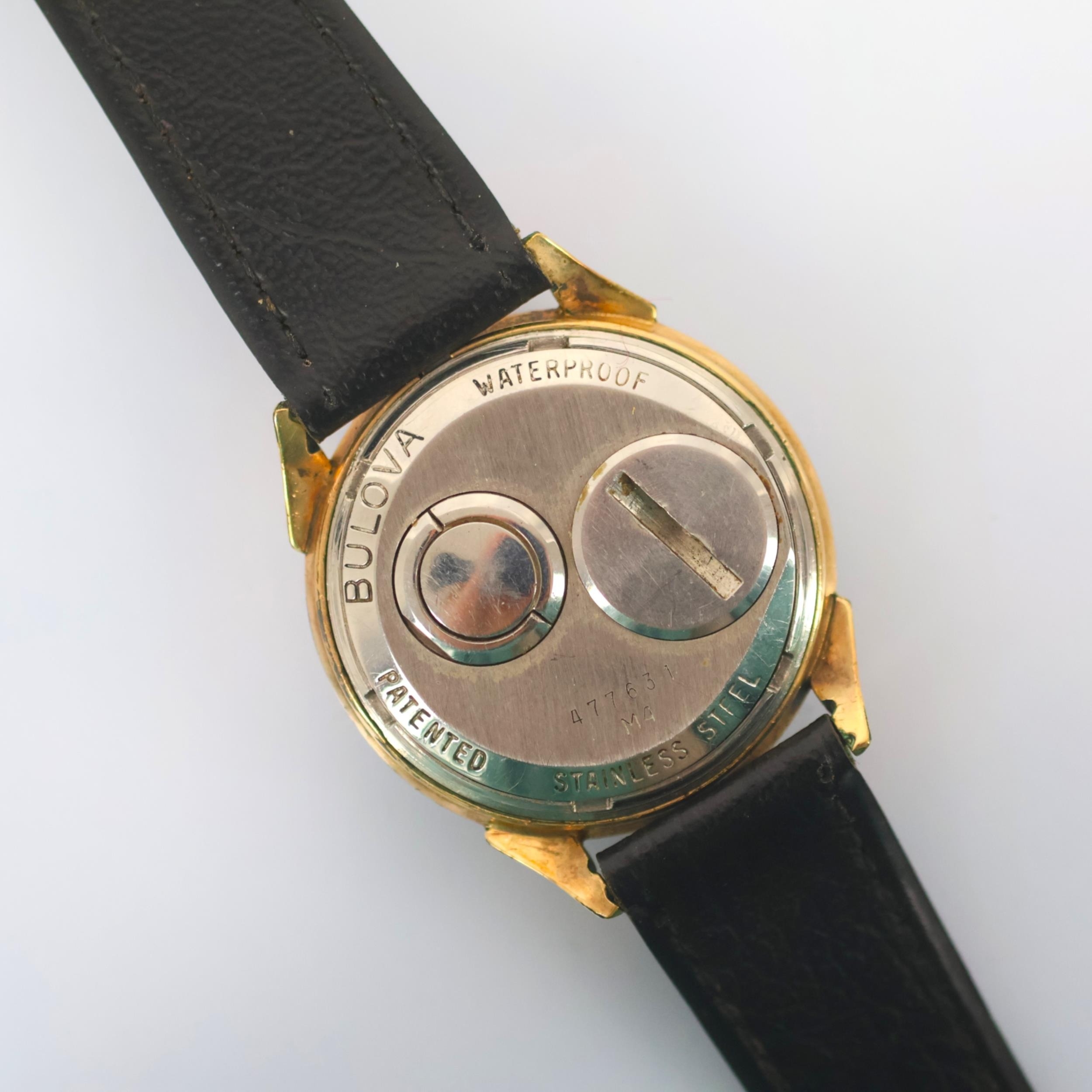 A mid 20th century Bulova Accutron 'M4' 'Spaceview' wristwatch, the circular dial showing inner mechanism, set to plain polished gold plated case, 3.5cm wide, marked to reverse 'Patented Bulova, waterproof, stainless steel' 'M4 477631' upon associated strap, gross weight 33gms (including movement and strap)