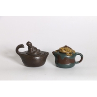 Two Yixing clay teapots, one of rectangular section, 11cm, and another with figural lid, 12cm tall. (2)