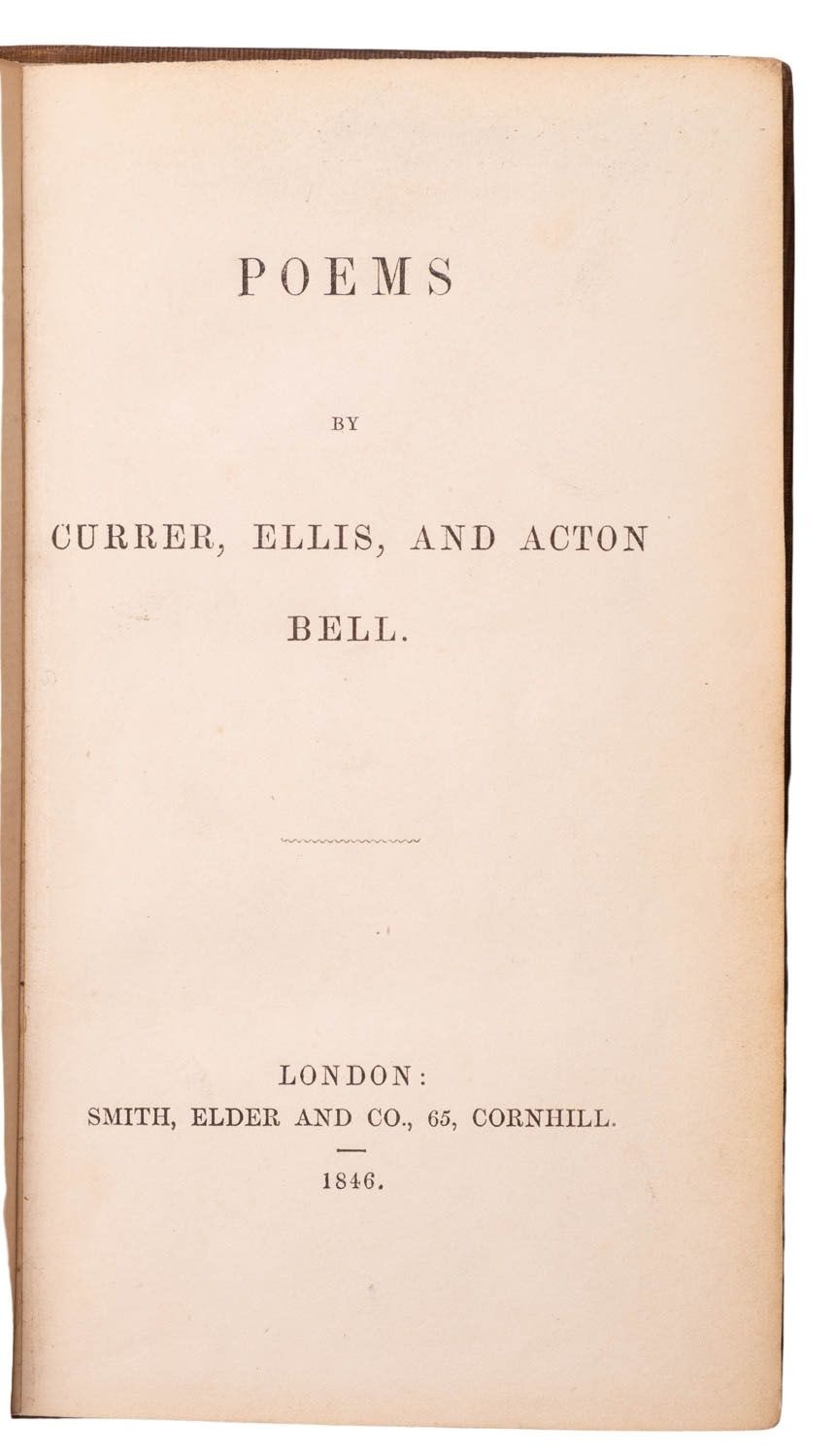 [BRONTË, Charlotte, Emily & Anne]. Poems by Currer, Ellis, and Acton Bell, 1st edition, 2nd issue, London: Smith, Elder and Co., 1846 [but 1848], advertisement leaf and final blank, orig. blindstamped green cloth by Westleys & Co. (binder's ticket to rep), bumped/toned, old re-back retaining parts of orig. backstrip, 8vo.