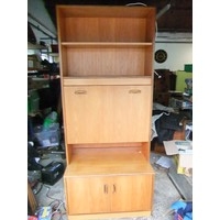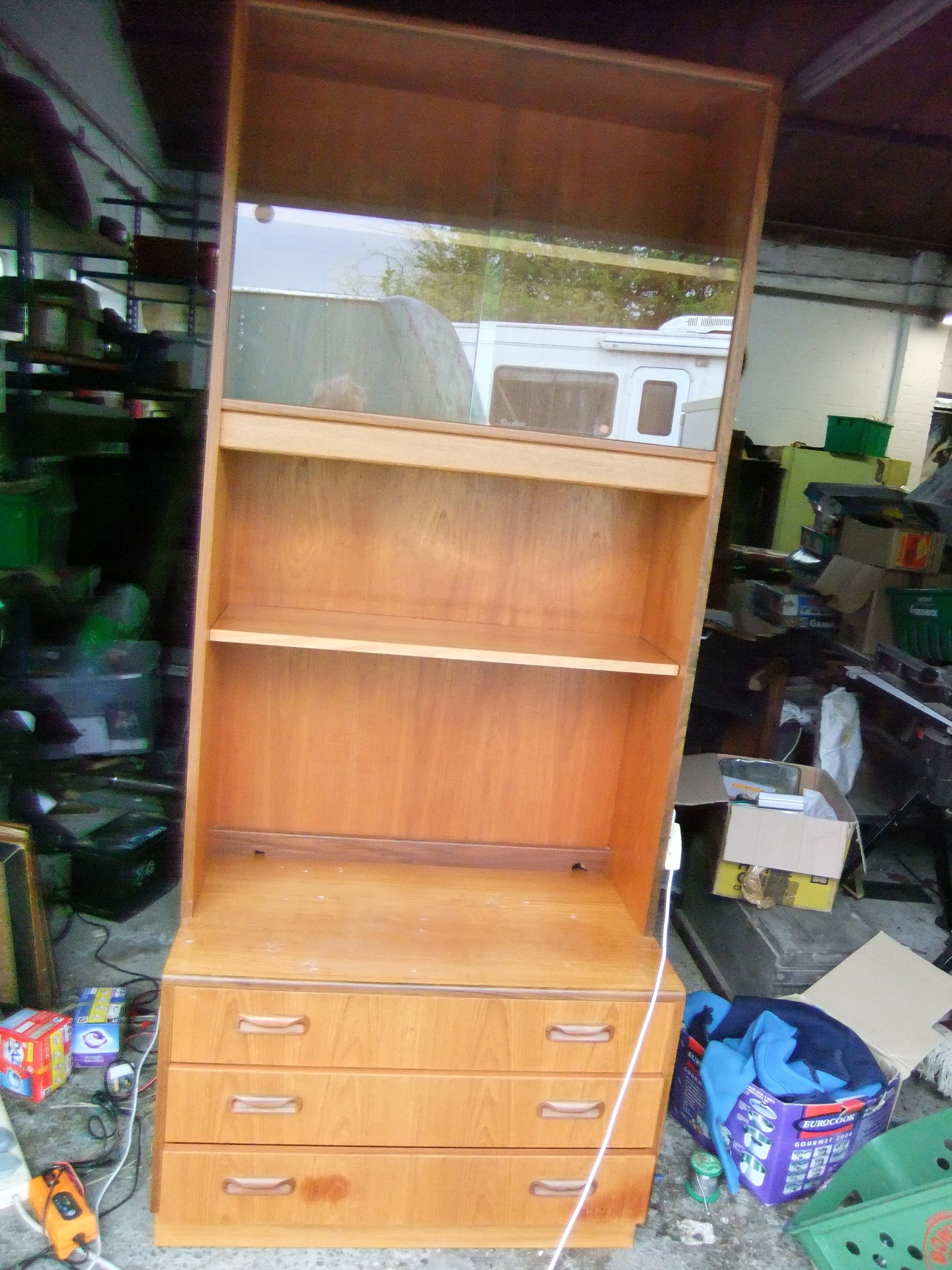 A G-Plan (E Gomme) wall unit with drawers to base, shelving and then glazed to top, internal lighting, in good order with some marks from use, stands very roughly 6' 6" tall (splits for transport). (Picture of unit in use to left, but with different base unit [cupboard and not drawers])