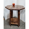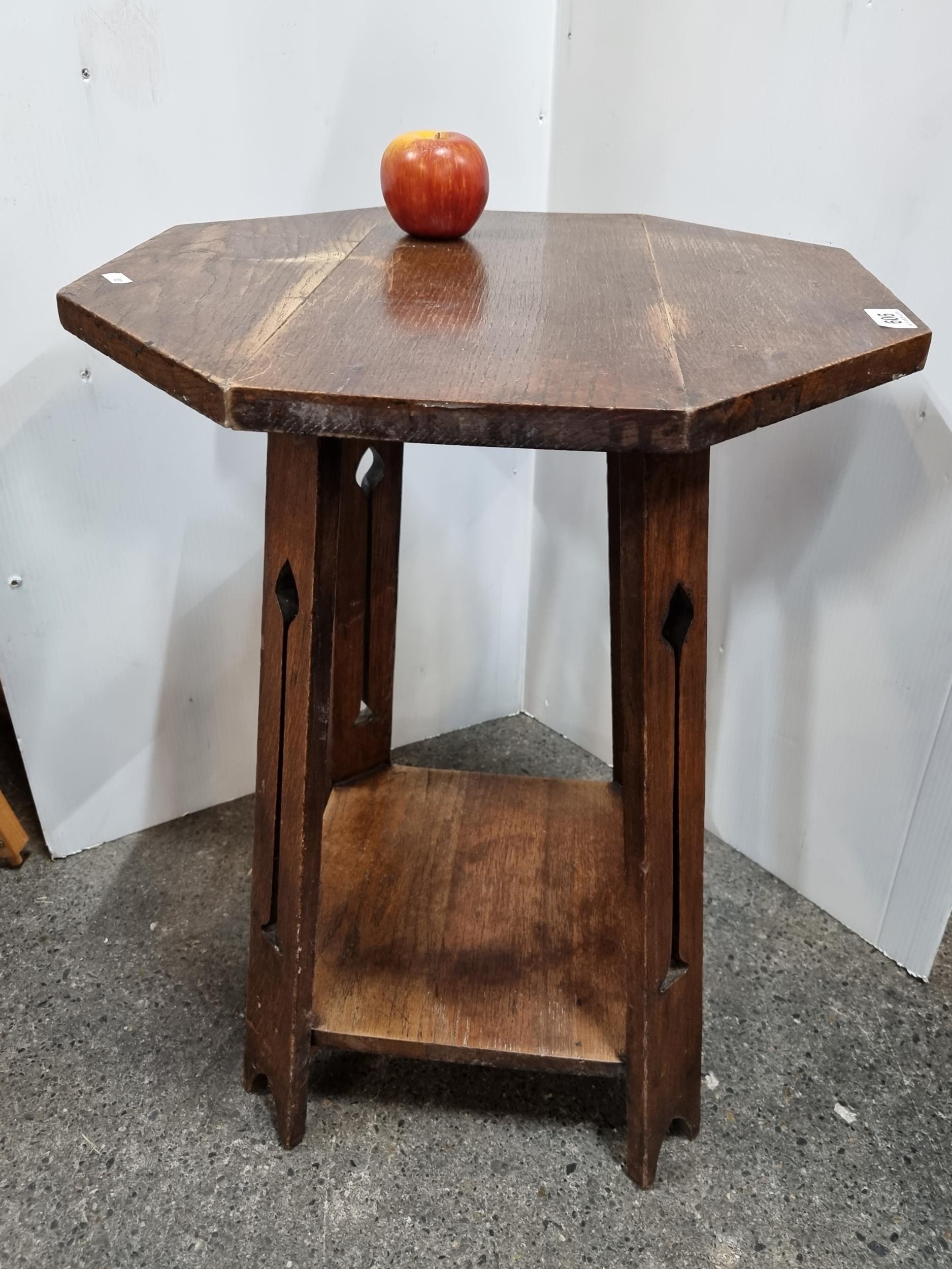 An early 20th century octagonal oak table from the Arts and Crafts movement. The four pierced legs with rounded arrow and arch cutouts support a square lower shelf.
