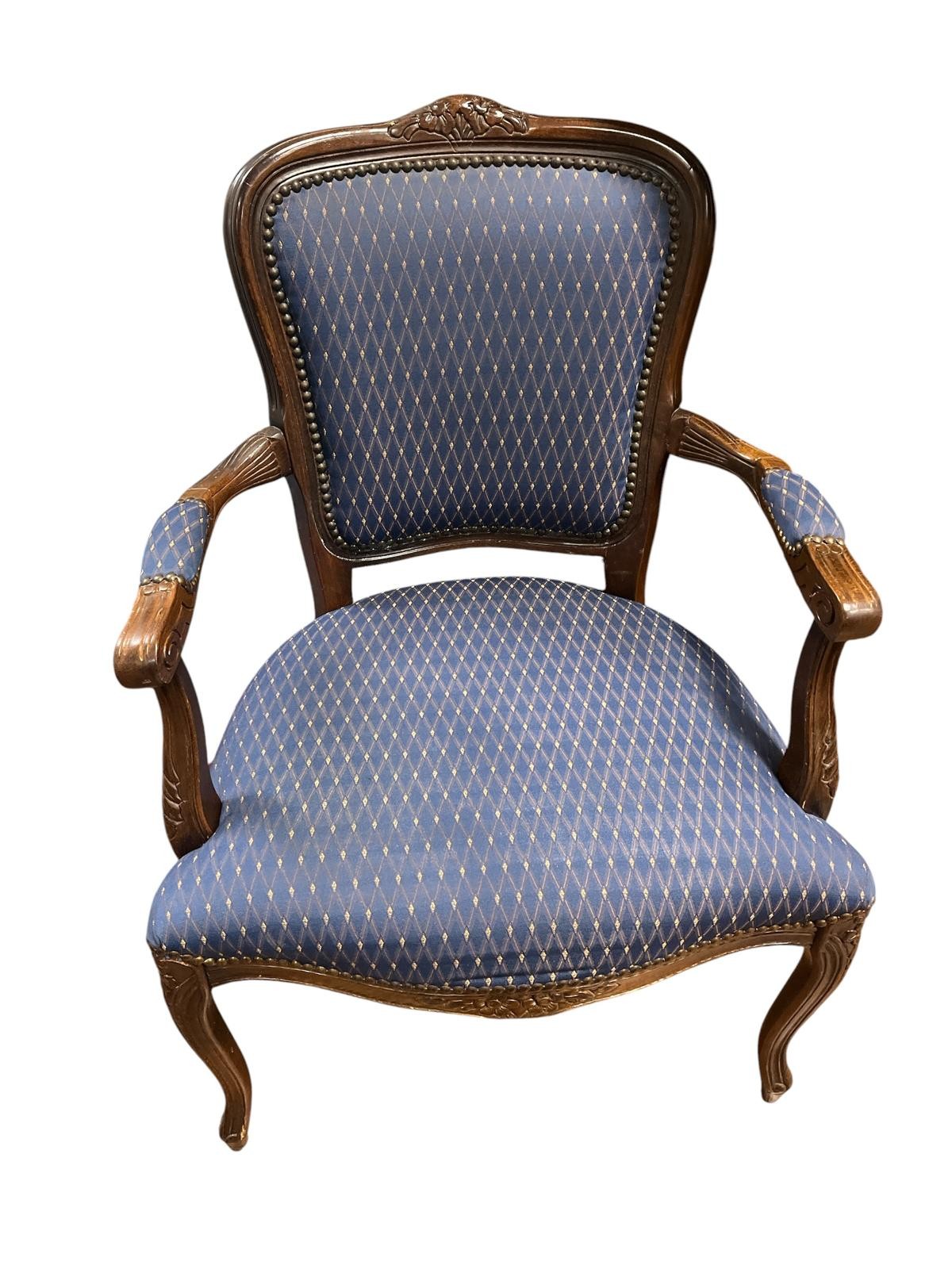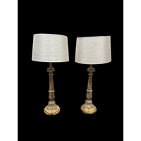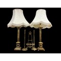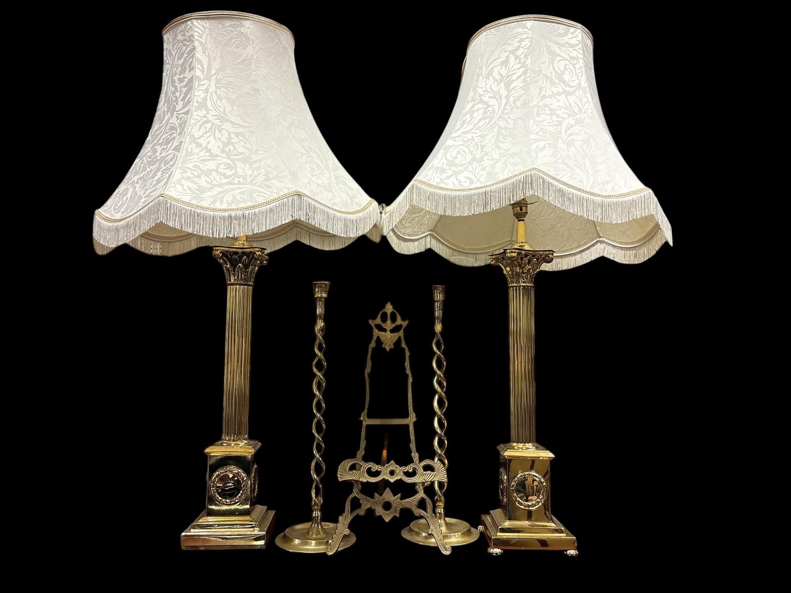 A PAIR OF BRASS CORINTHIAN COLUMN TABLE LAMPS each with a reeded columnar stem above a square stepped base on lobed bun feet, with shades 111cm (h) together with A PAIR OF VINTAGE GILT BRASS CANDLESTICKS with a pierced helical design 51cm (h), a Victorian gilt brass folding tabletop picture stand and a blue upholstered elbow chair