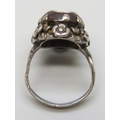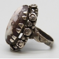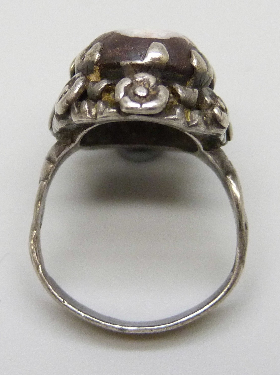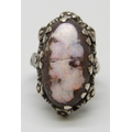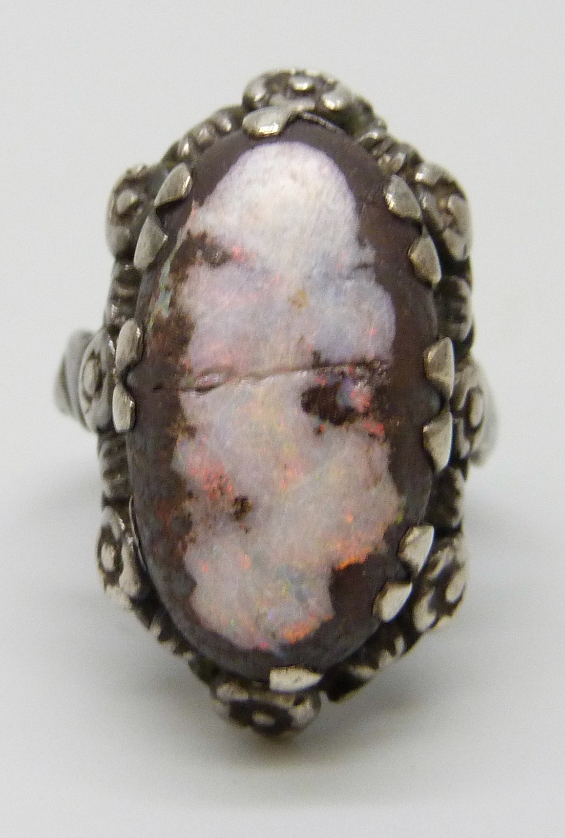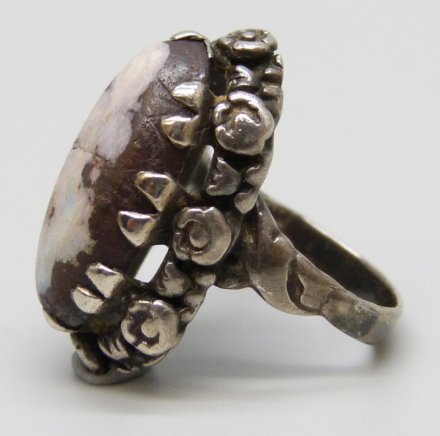 An Arts & Crafts silver and boulder opal ring with floral border, a/f, 7g, stone 2.1cm, L