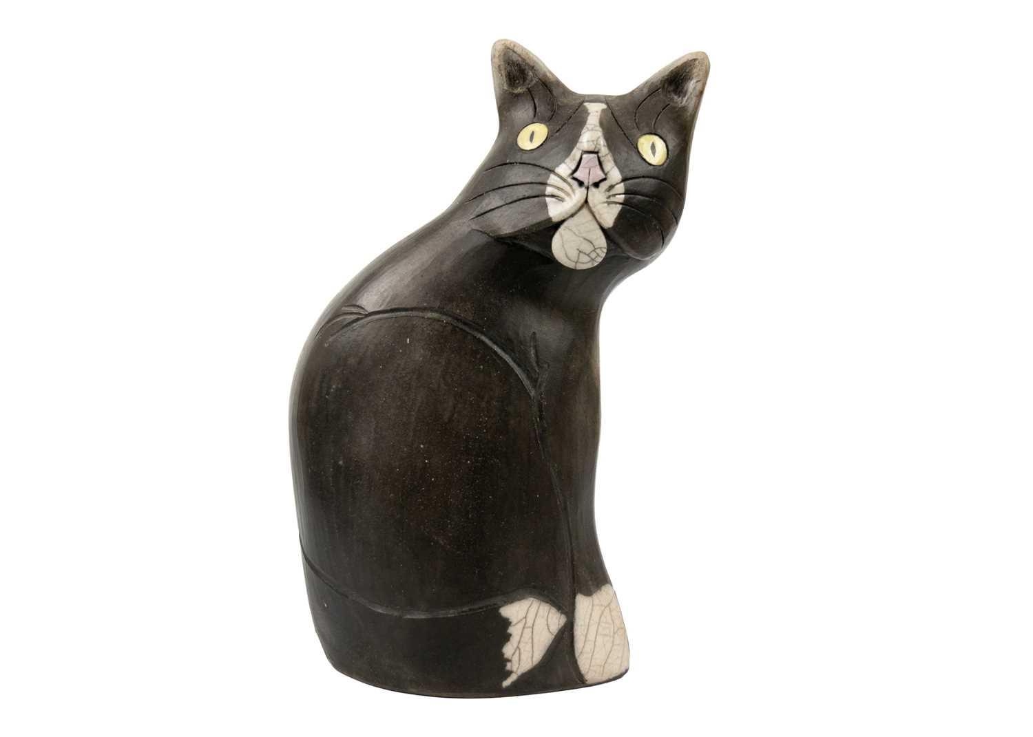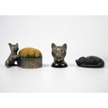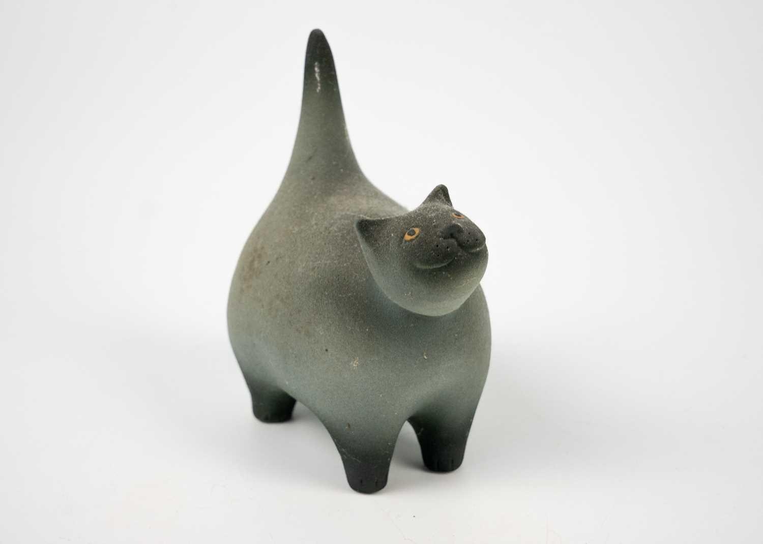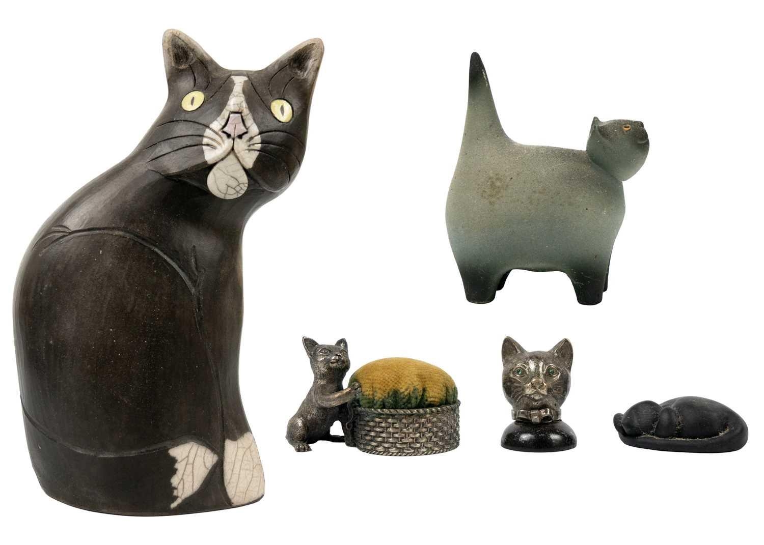 A Tony White cat ceramic figurine. Height 27cm. Together with a pin cushion metal cat figurine and three other small cat figurines.