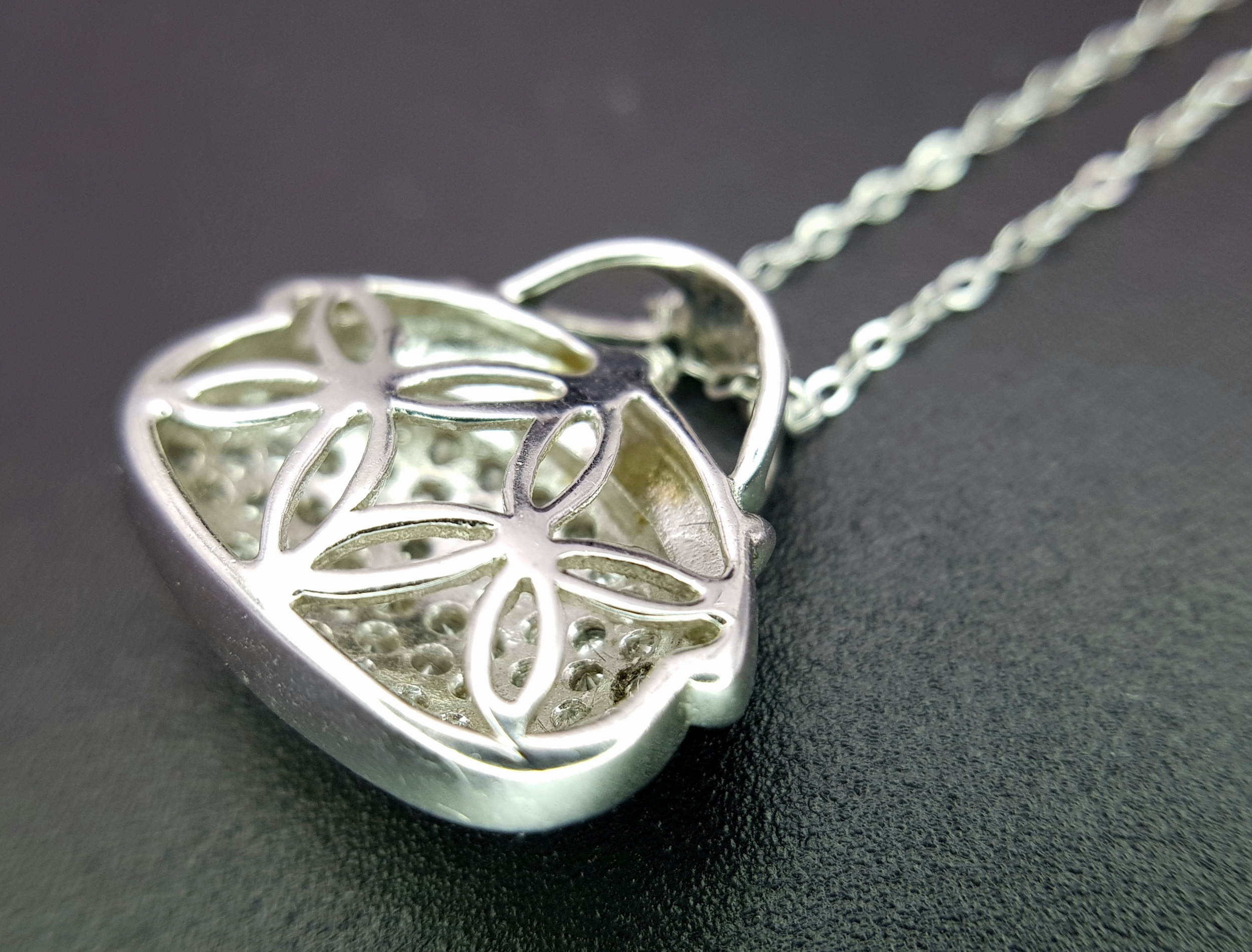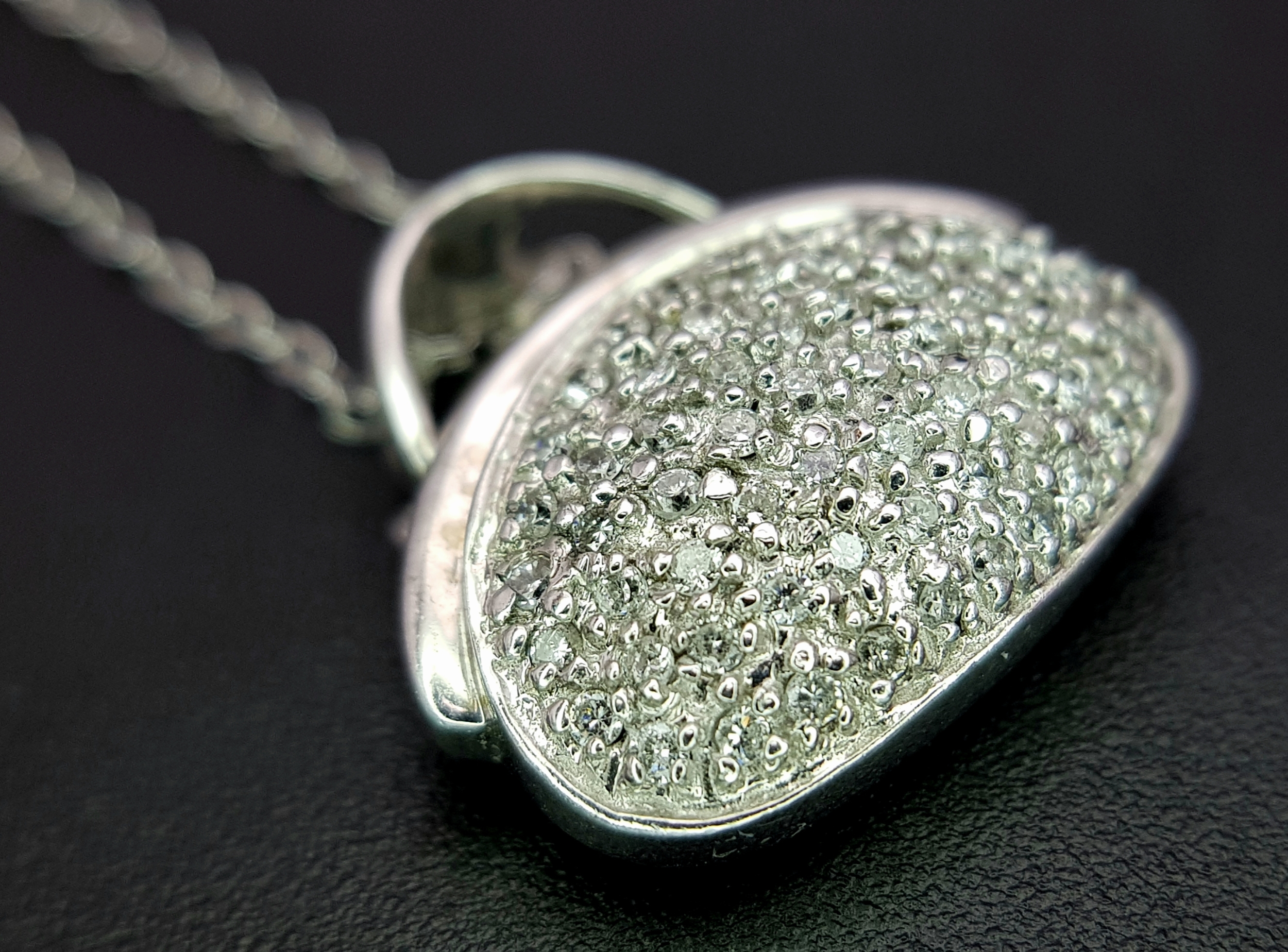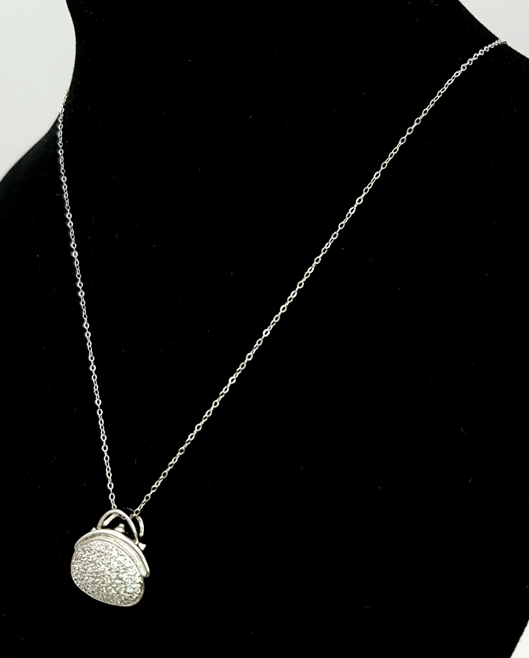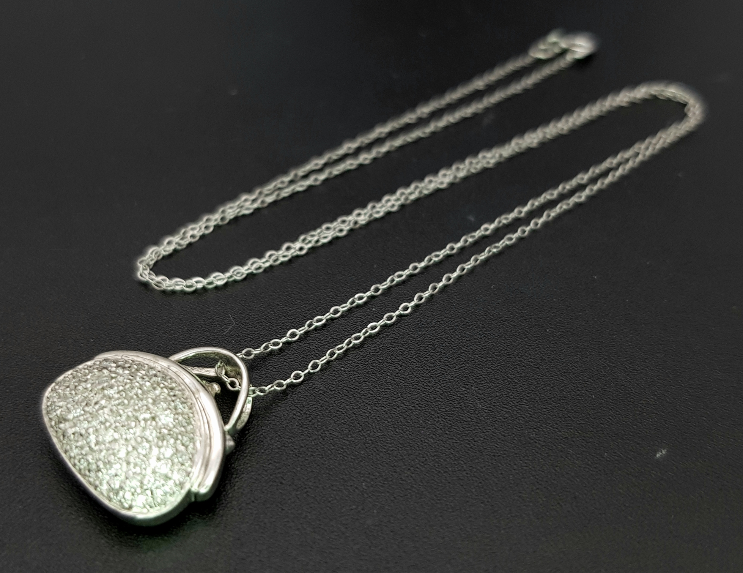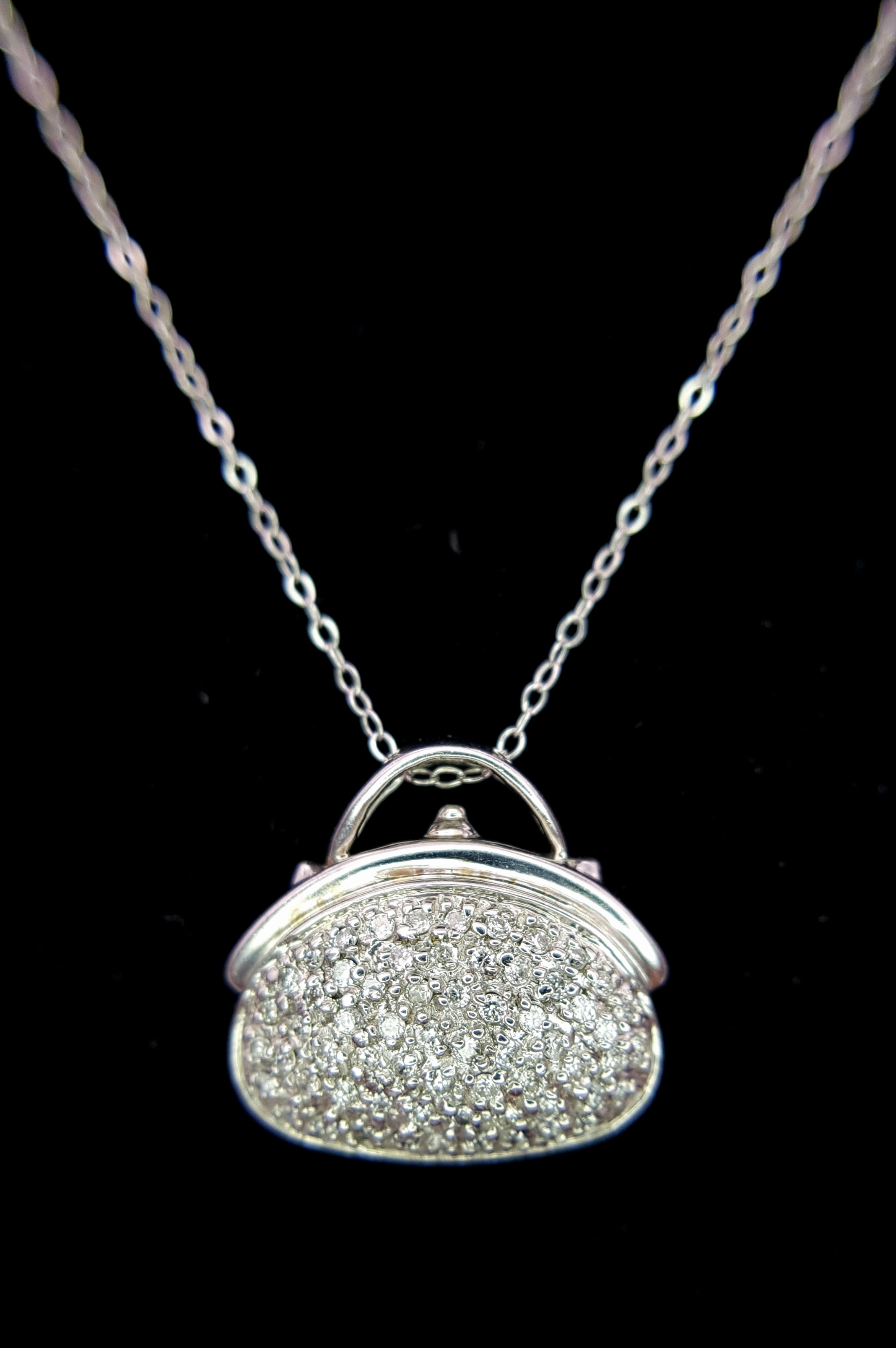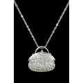 A 14K White Gold and Diamond Handbag Pendant on a 9K White Gold Chain. 18mm and 44cm. 3.4g. Ref: 6.3