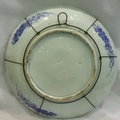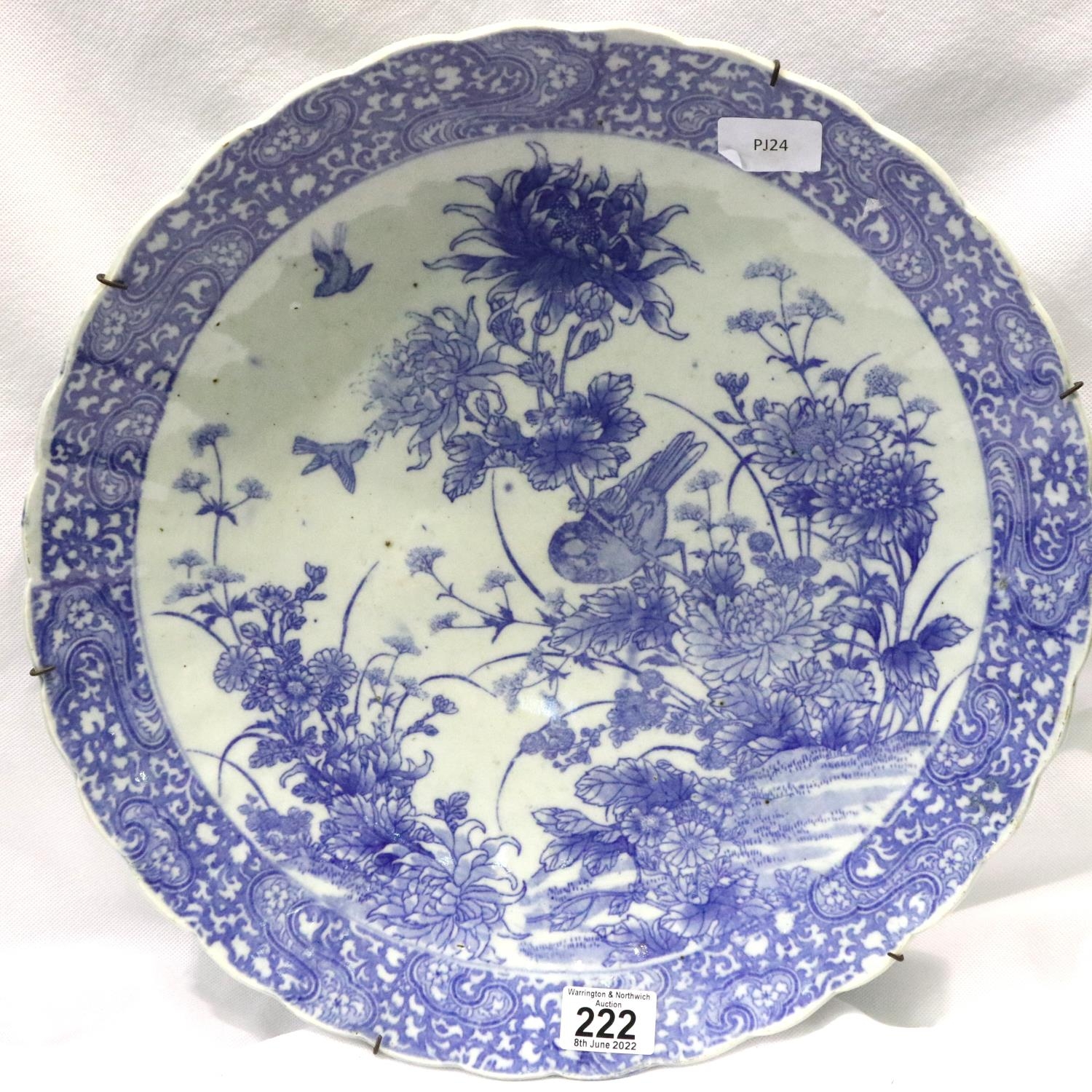 Large Oriental blue and white shallow bowl with bird and Chrysanthemum decoration, D: 40 cm. P&P Group 3 (£25+VAT for the first lot and £5+VAT for subsequent lots)