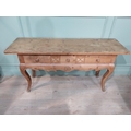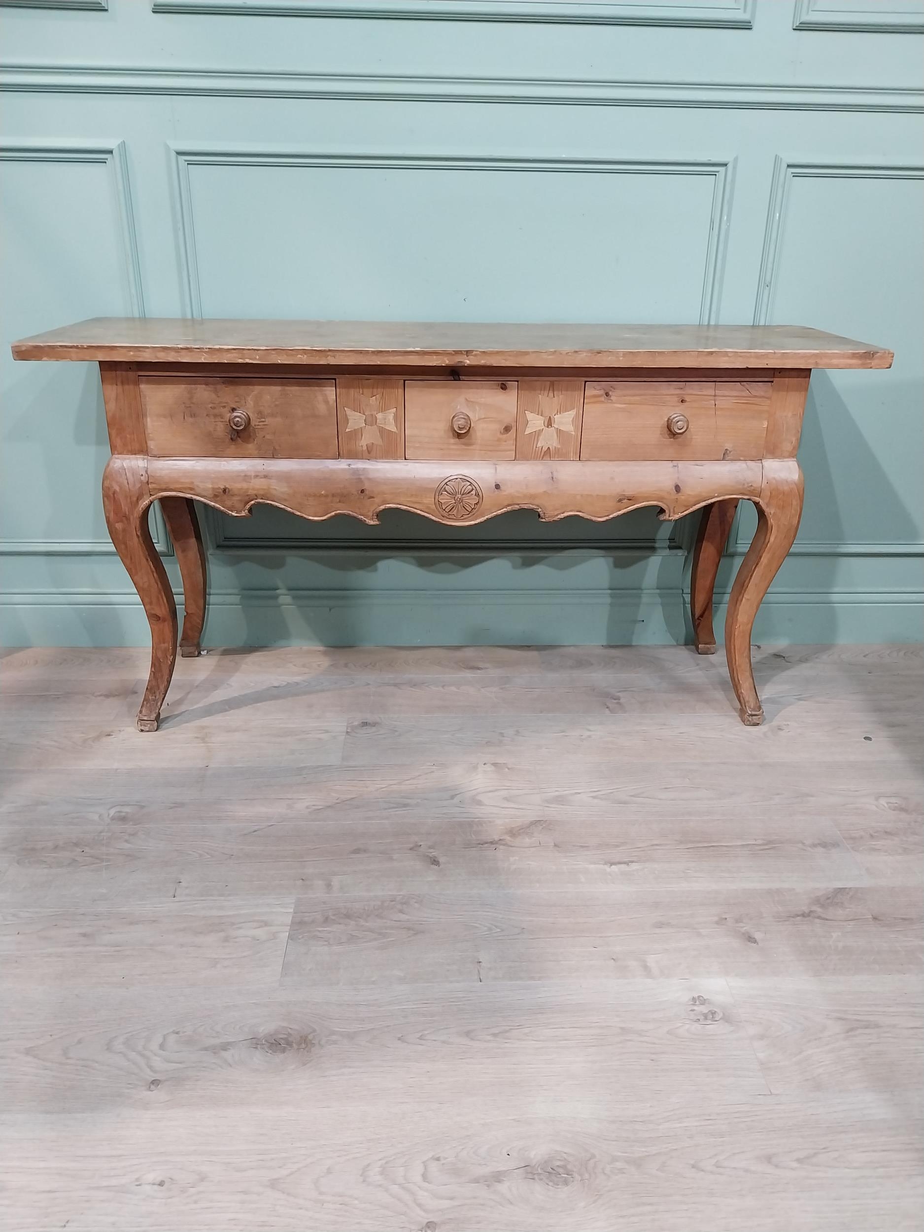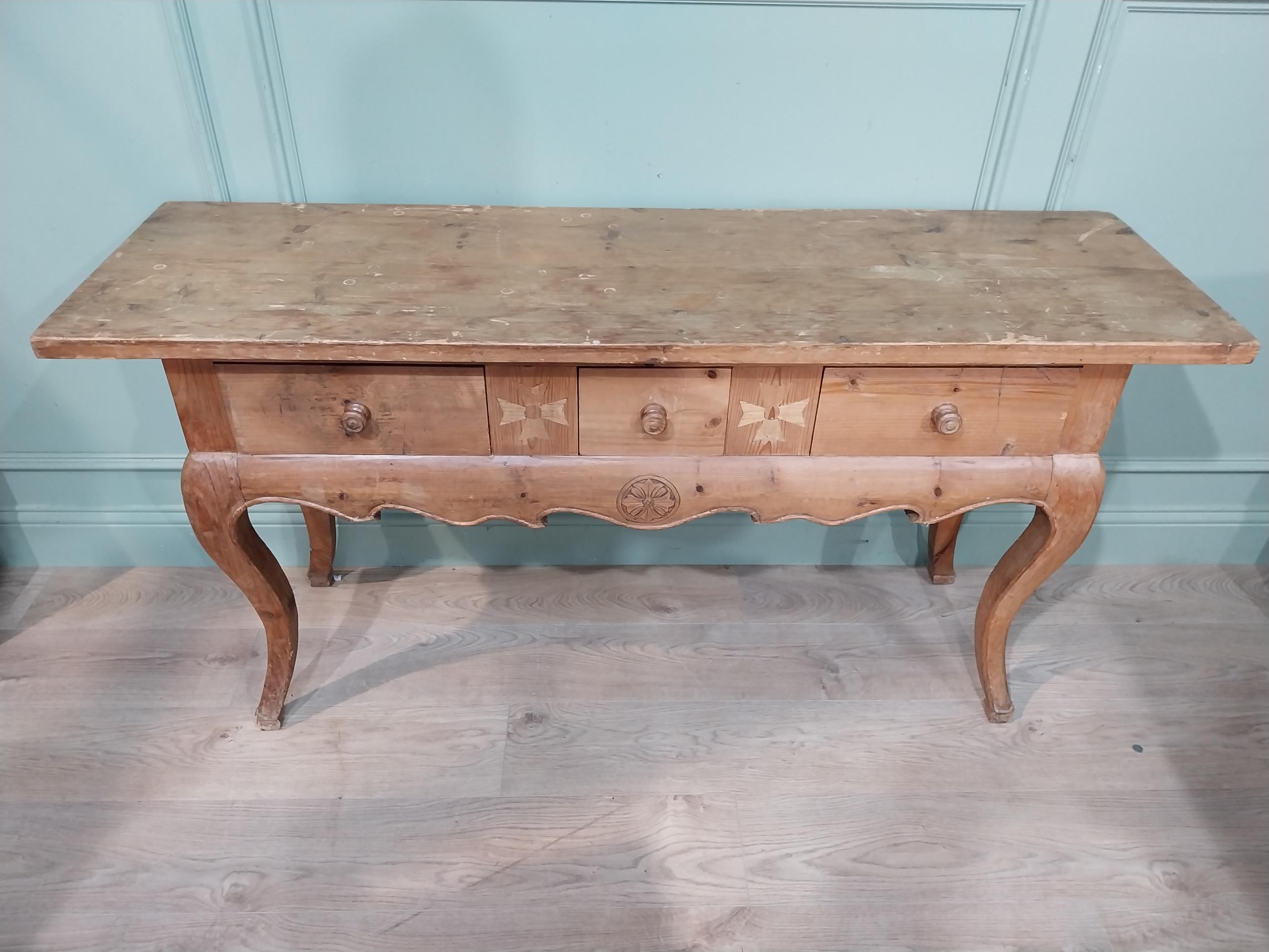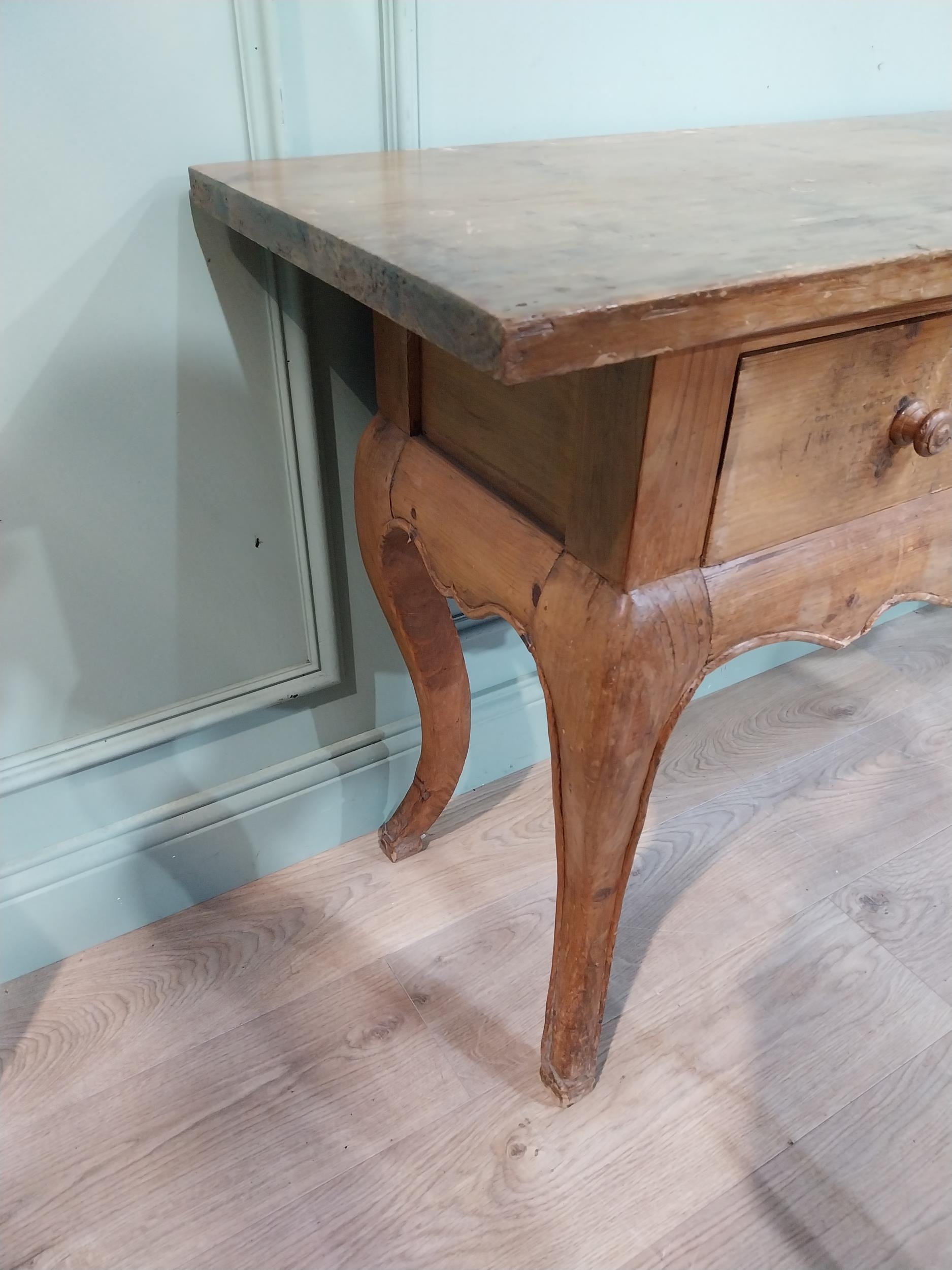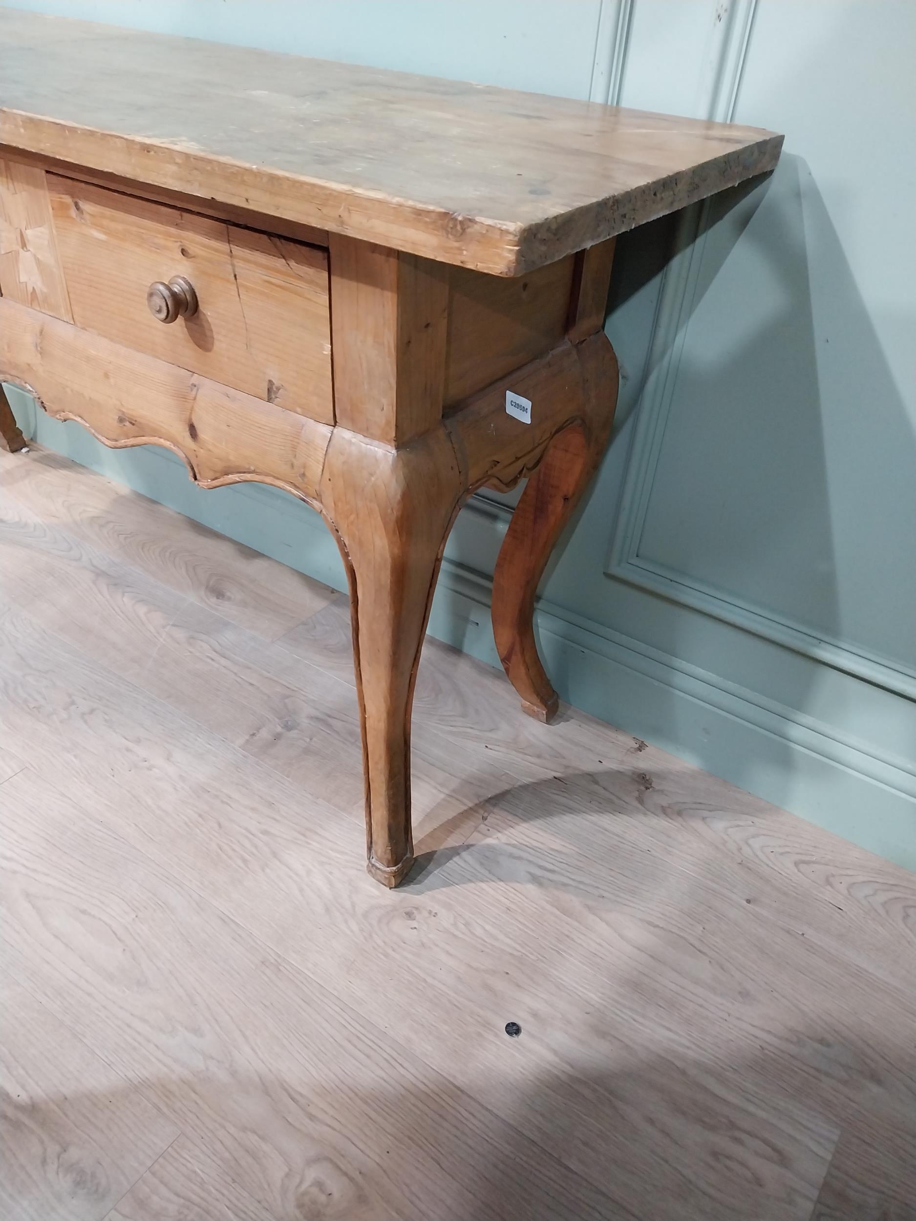 20th C. stripped pine side table on cabriole legs. {78 cm H 150 cm W x 45 cm D}.