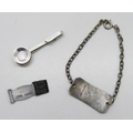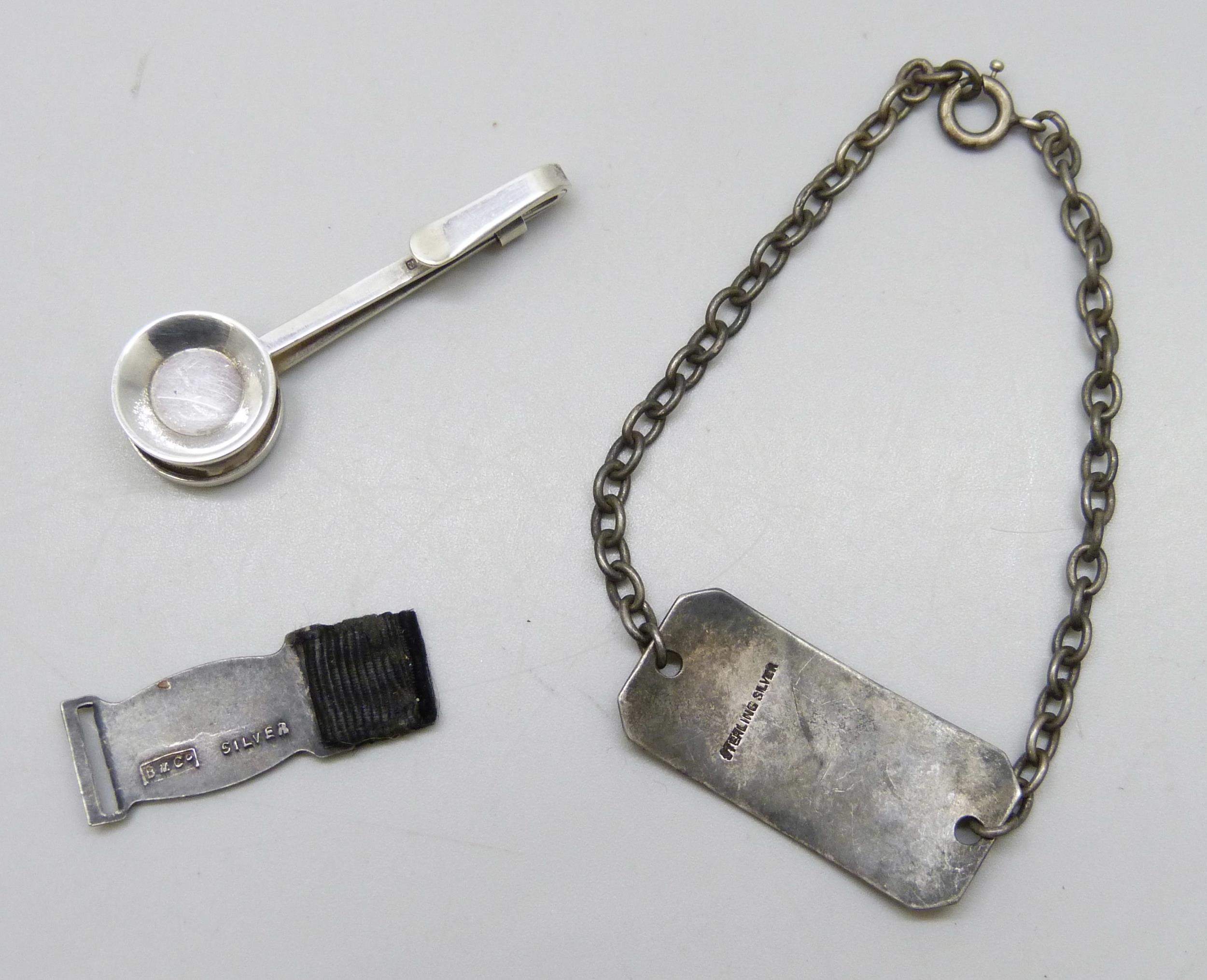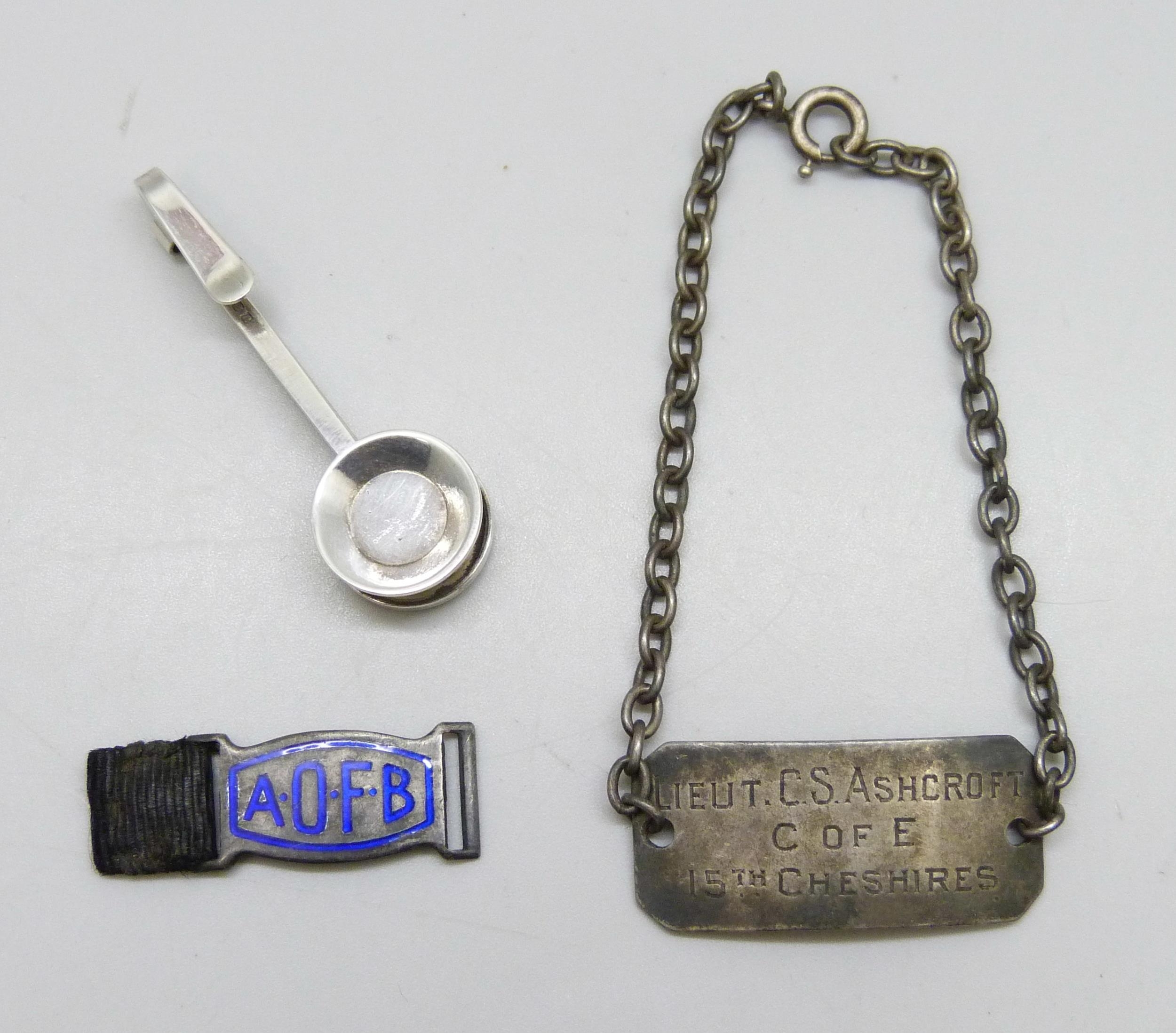 A boxed silver napkin holder, a silver identity bracelet engraved 'Lieut C.S. Ashcroft 15th Cheshires' (Bantom Reg) and a silver Ancient Order of Froth Blowers enamelled tag
