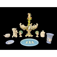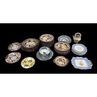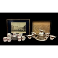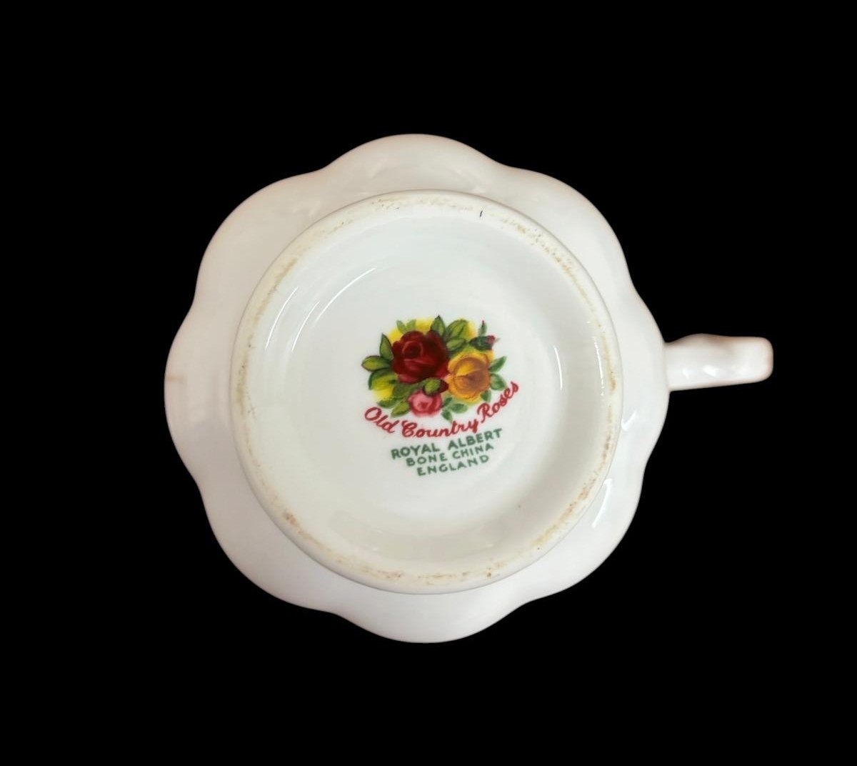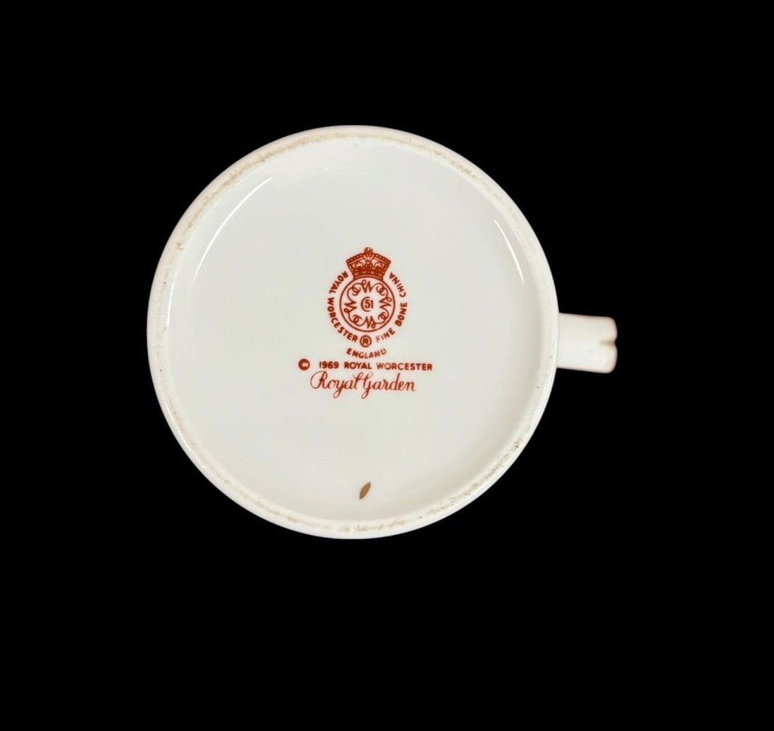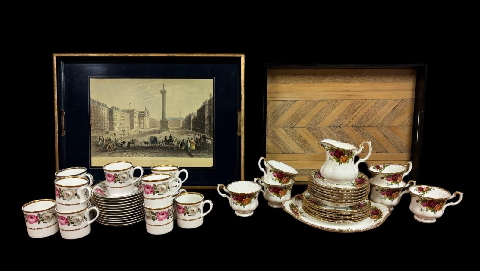 TWO PART FINE BONE CHINA TEA / COFFEE SETS to include twelve Royal Worcester saucers in the Royal Garden pattern with eleven coffee cups and a Royal Albert Old Country Roses pattern part tea set comprising six cups, six saucers, six side plates, a cake plate and a creamer together with two serving trays Largest 55cm (l) x 49cm (w)