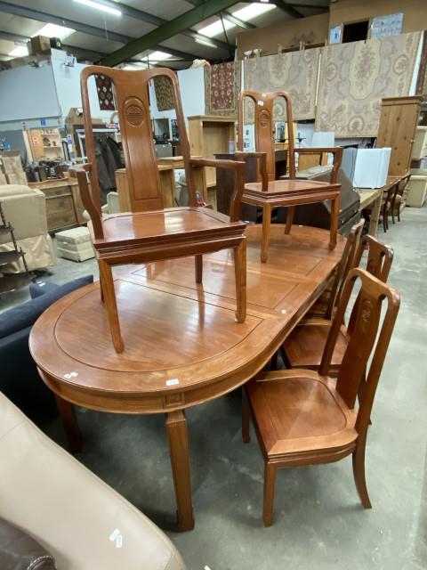 Chinese rosewood extending dining table and 7 chairs including 2 carvers 78H 243W 111D