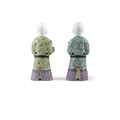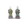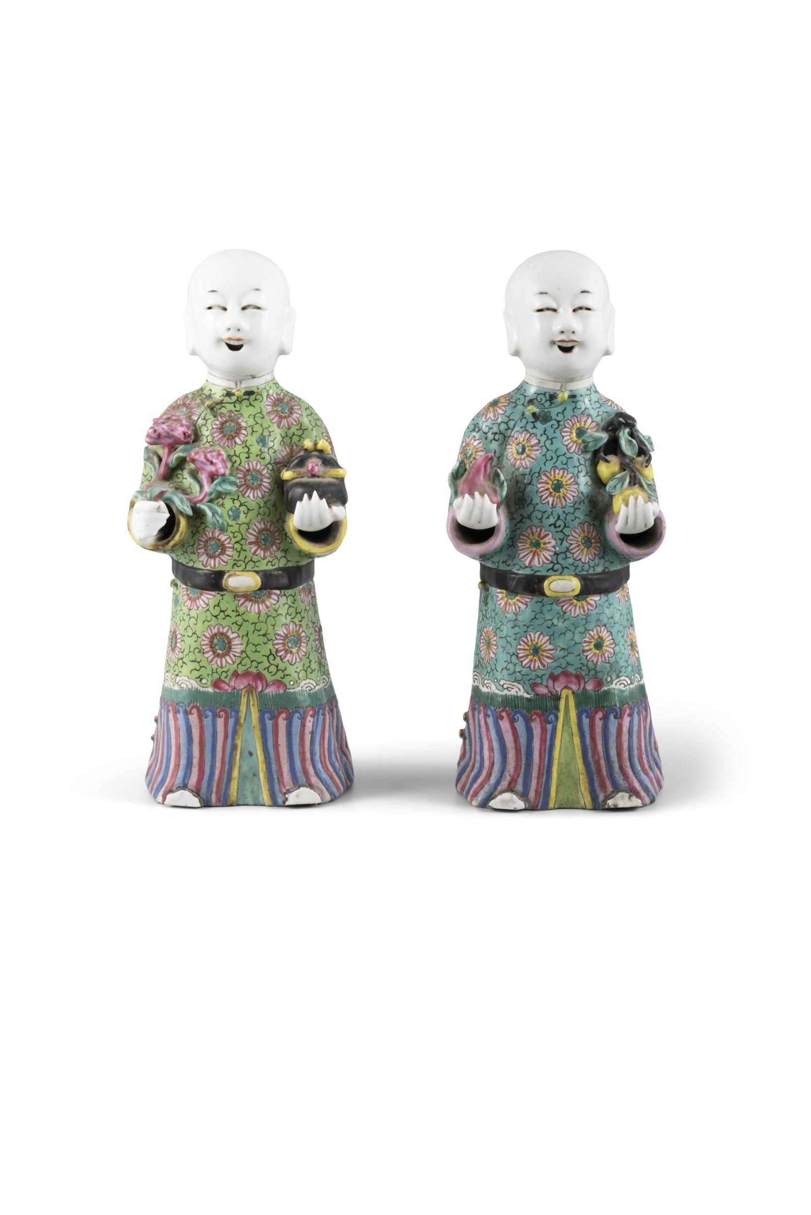 A PAIR OF CHINESE POLYCHROME PORCELAIN FIGURES OF HOHO BROTHERS HOLDING AUSPICIOUS OBJECTS ?? ?????? China, late Qing dynasty H: 21cm