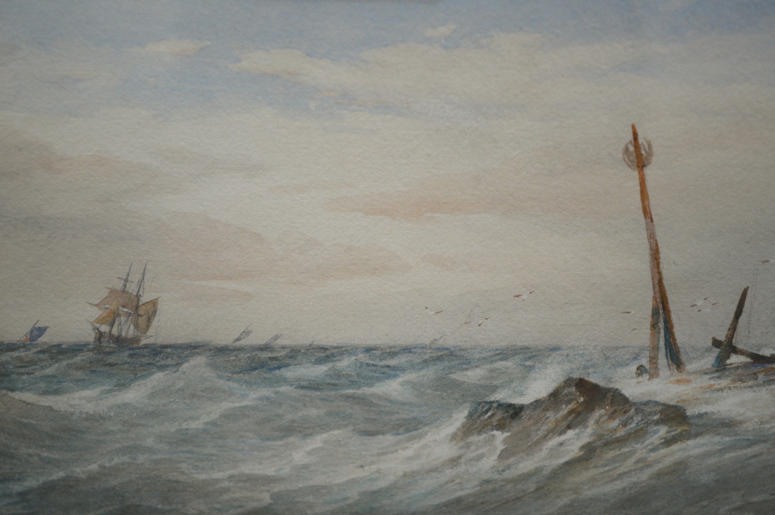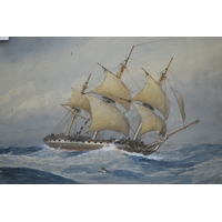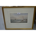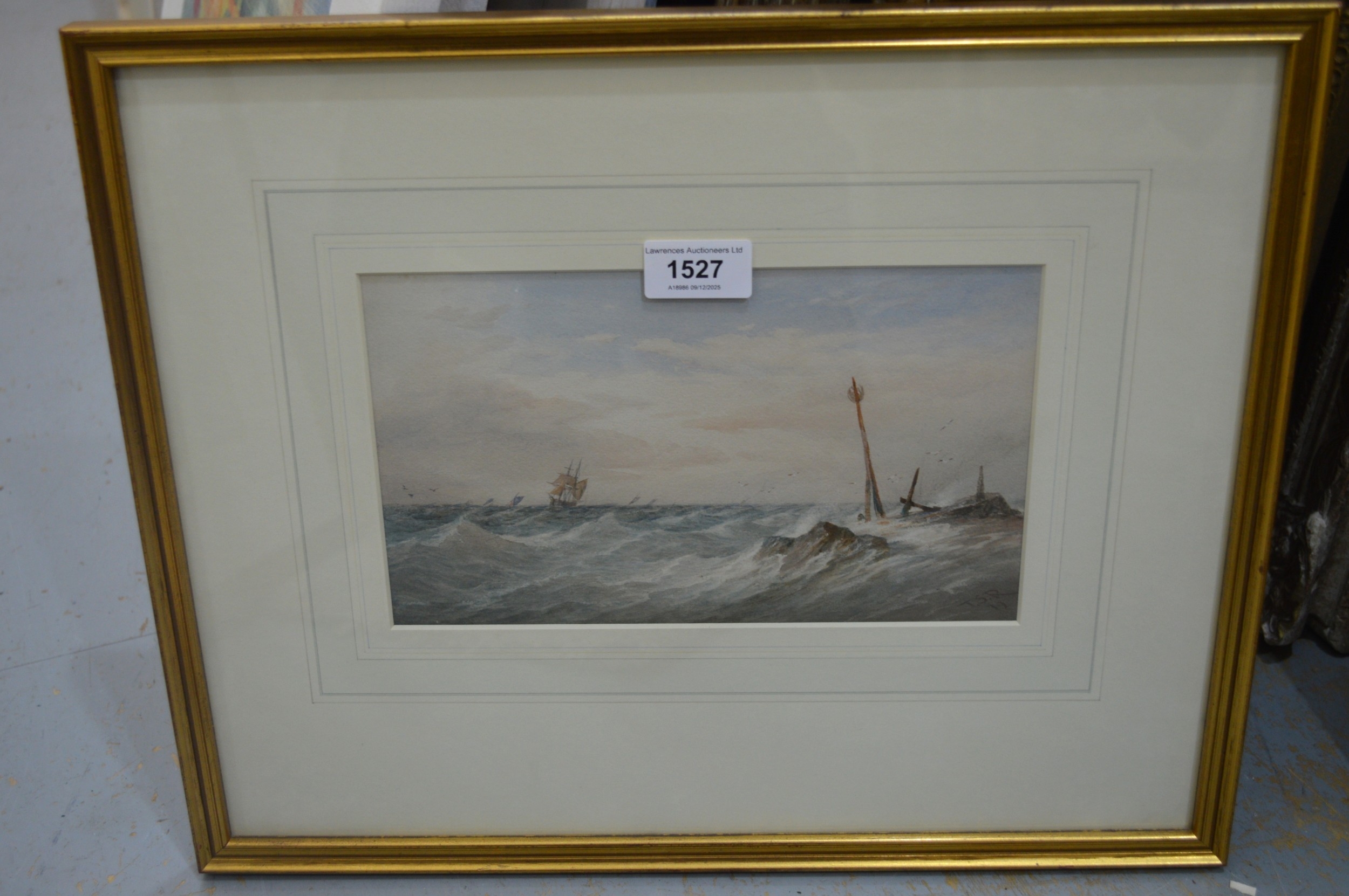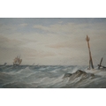 Thomas Sewell Robins, watercolour, shipping in a stiff breeze, signed with monogram, dated 1879, bearing label verso, 14 x 24cm, gilt framed