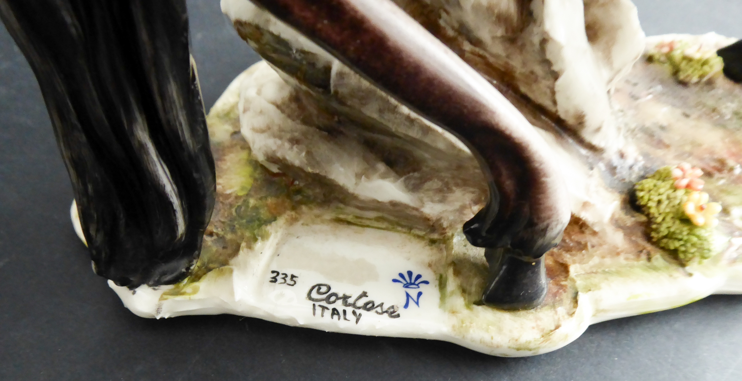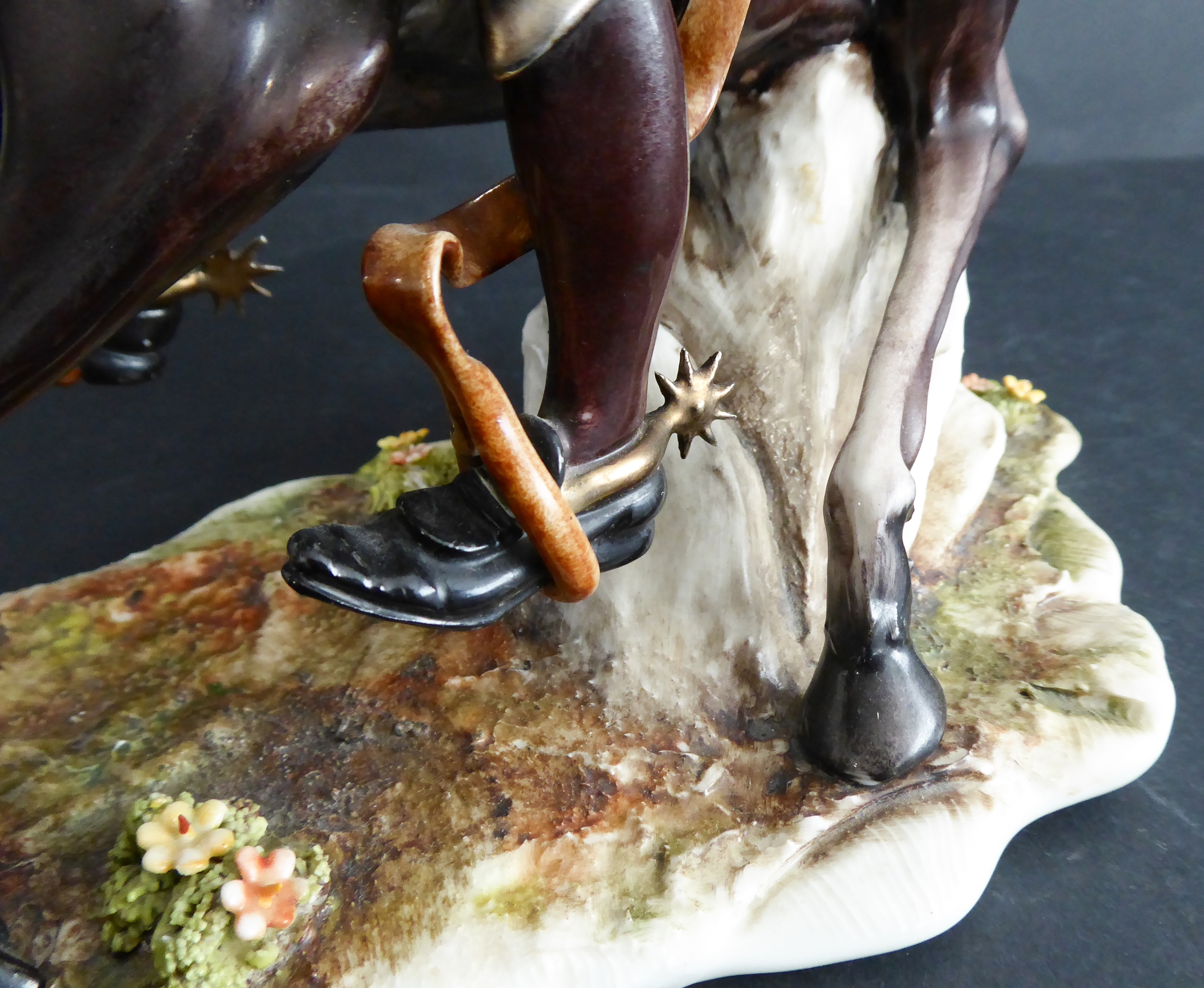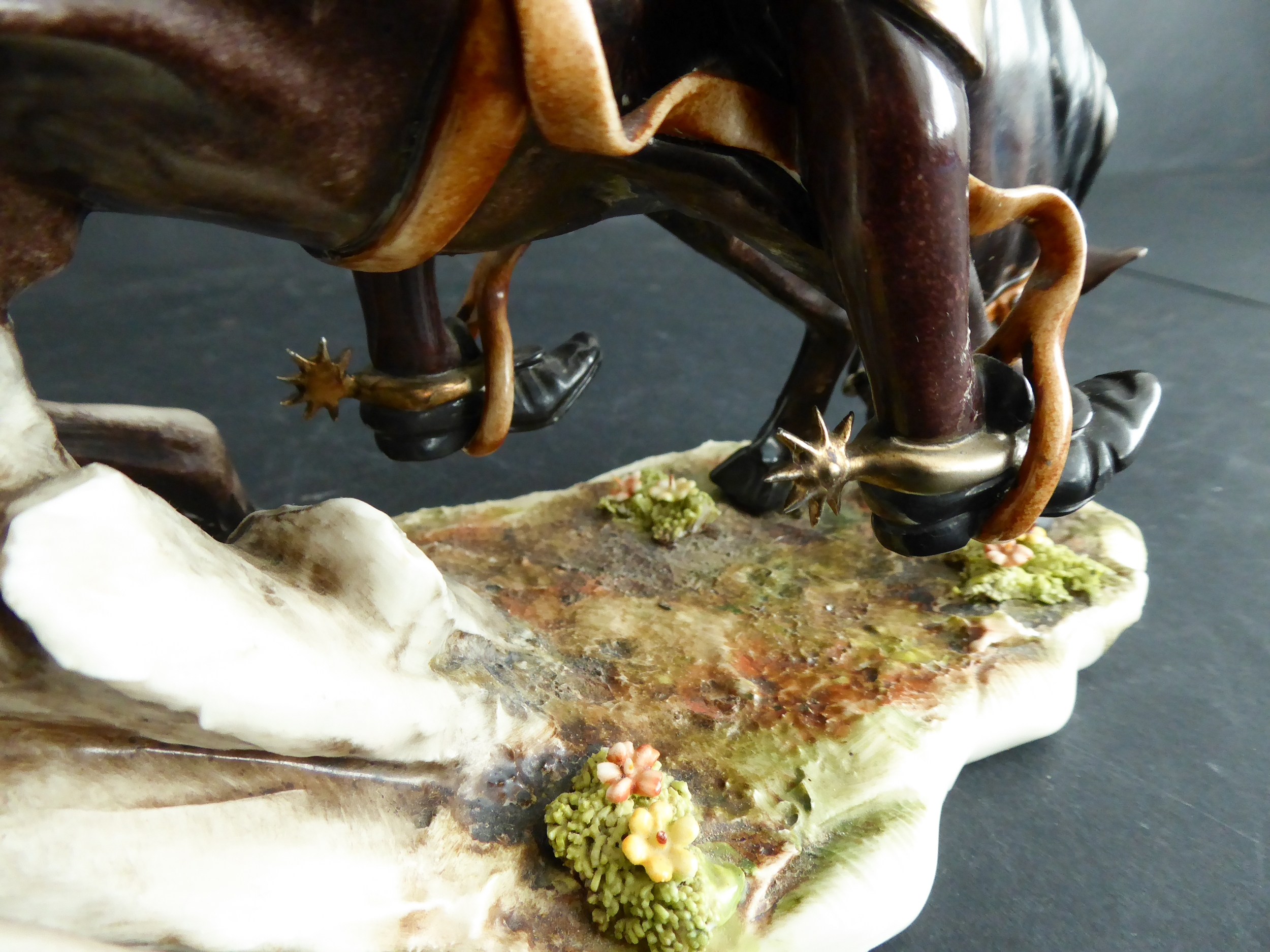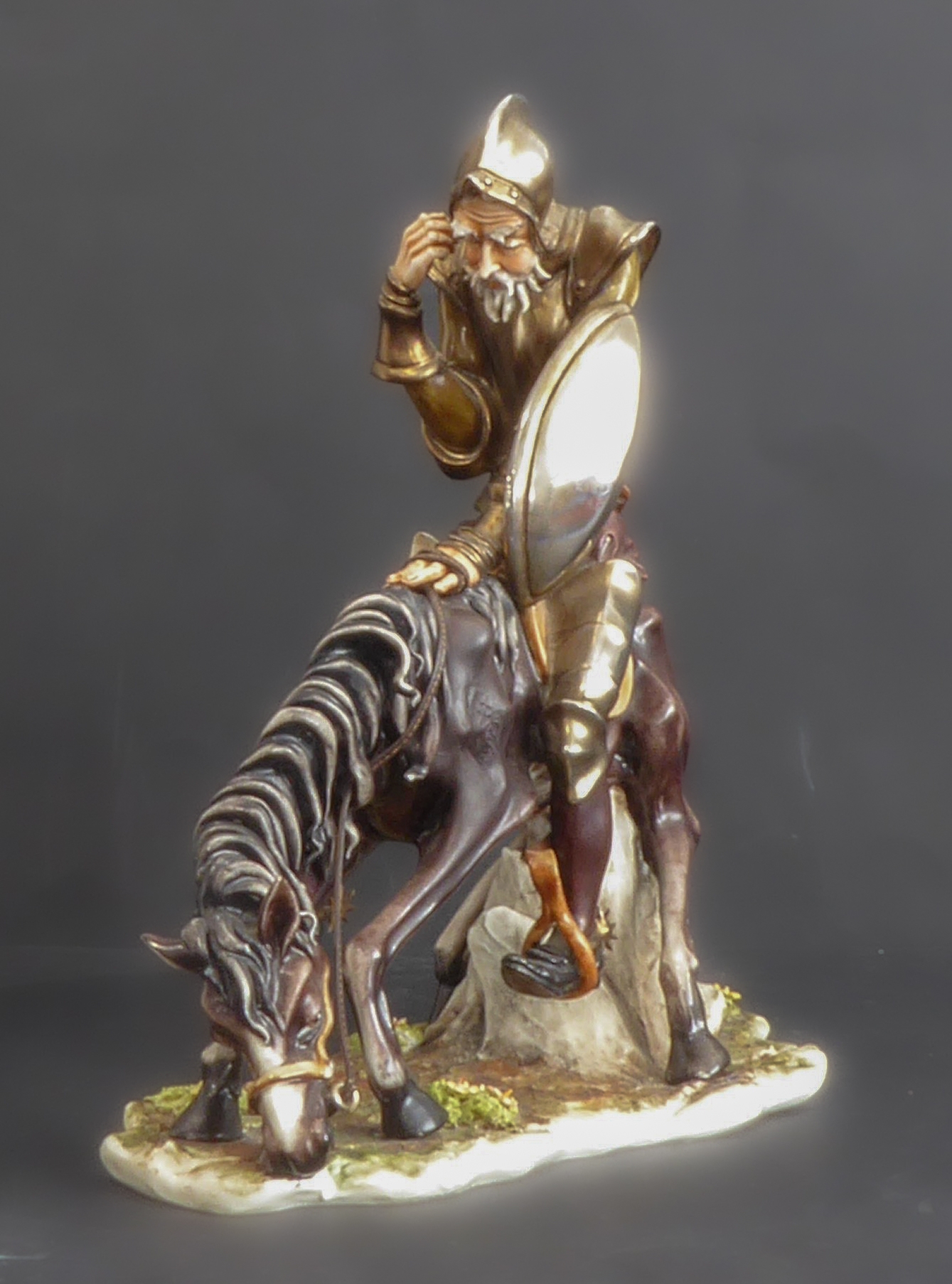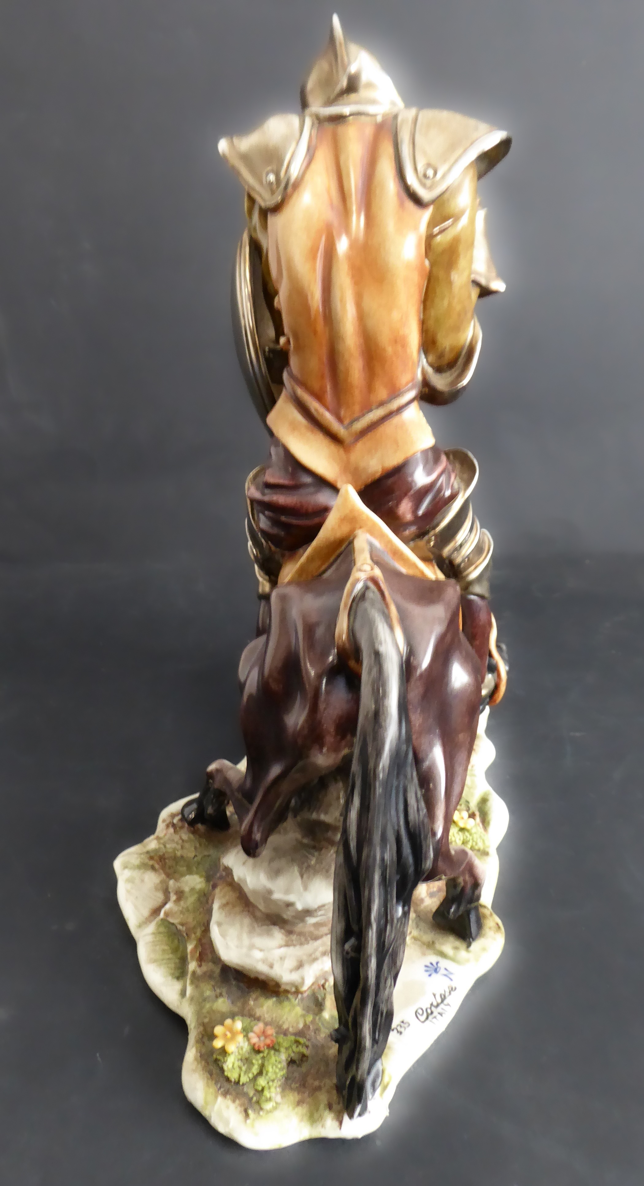 A large hand-decorated Capodimonte porcelain model of Don Quixote in full armour and on horseback, numbered 335 (probably limited edition), Capodimonte mark and signed Cortose - Italy. (26.5 wide x 27 cm high)