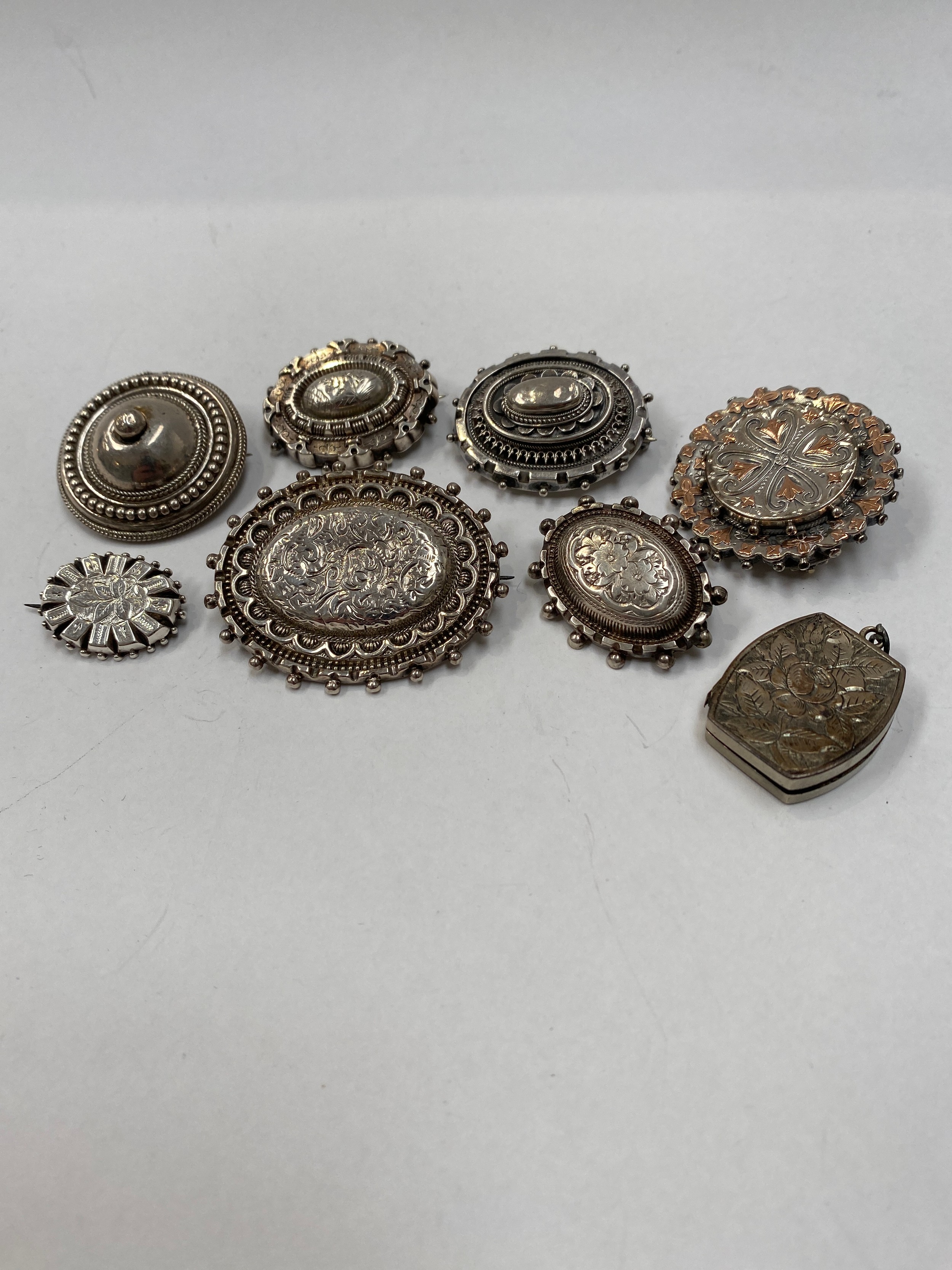 Eight silver lockets and brooches (R) £40