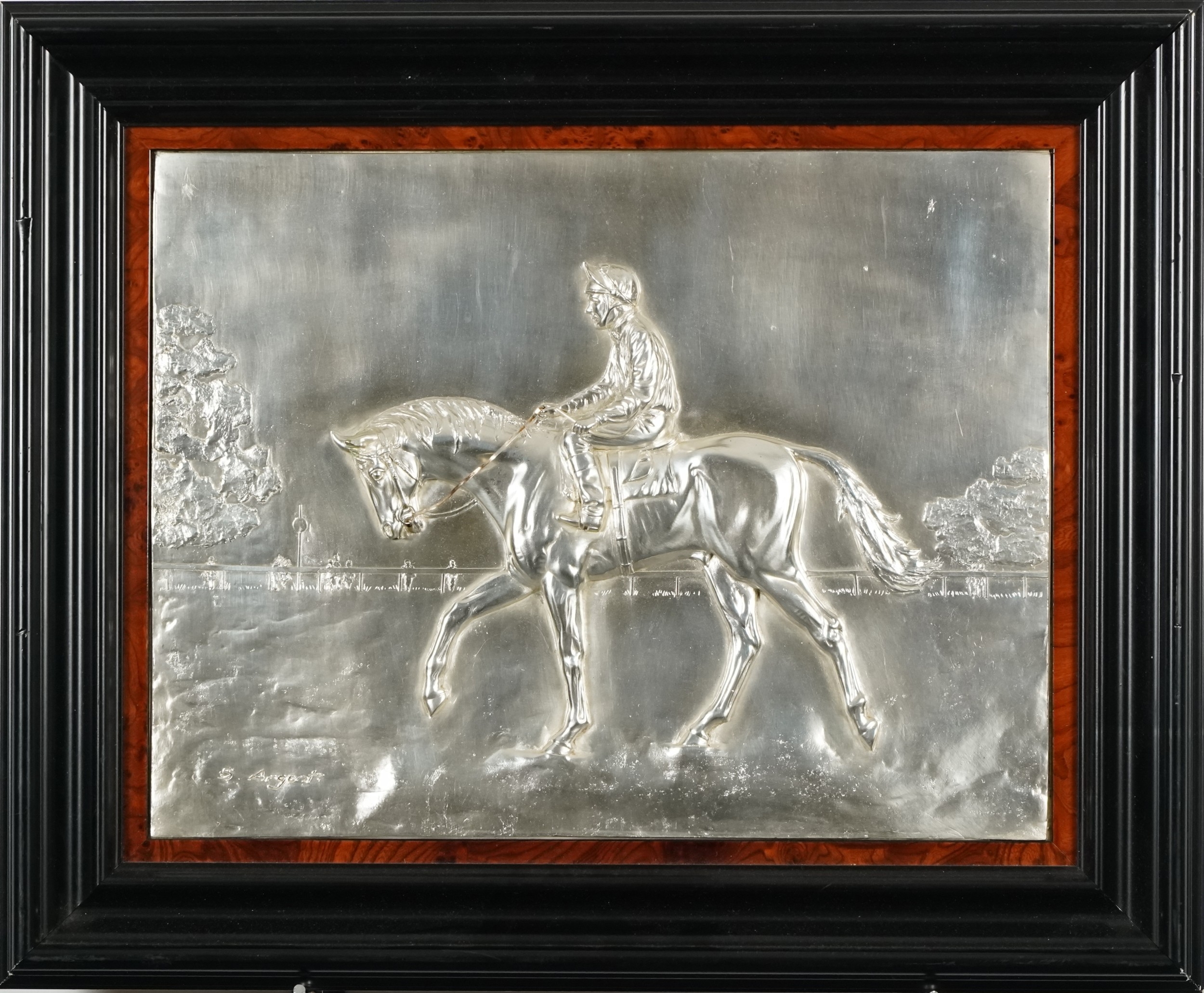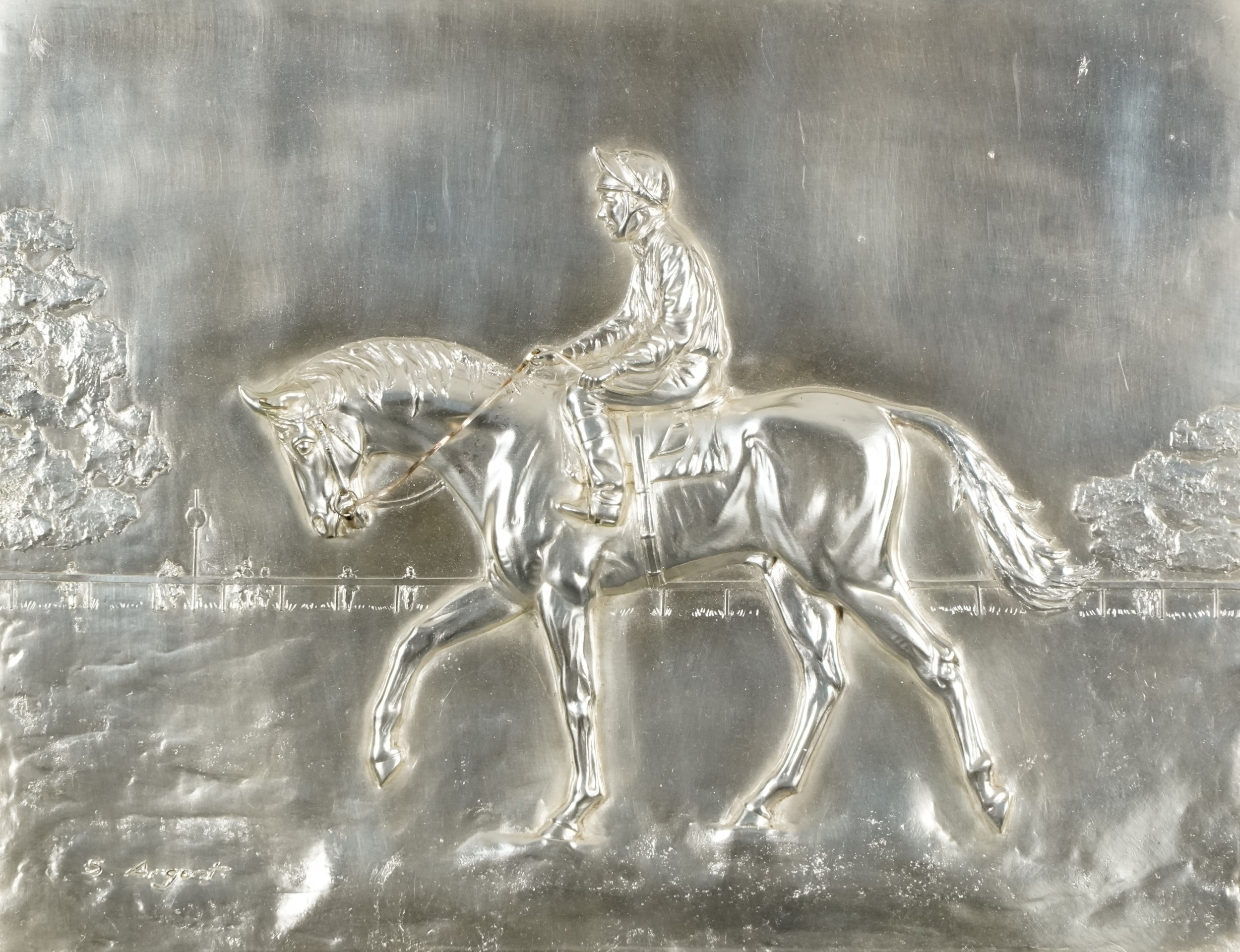 Stanley Argent - Up to the Tape, a limited edition silver plate bas-relief plaque of a racing horse, 20/75, framed, bearing certificate of authenticity verso, 45cm x 56cm.