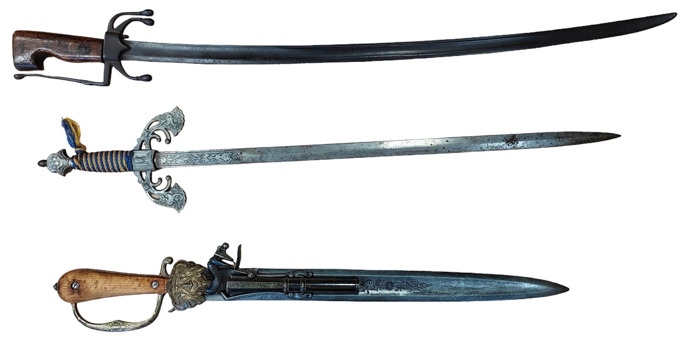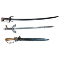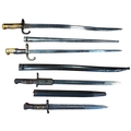 Edged weapons range some with scabbards, includes 1874 Tulle Chassepot sword bayonet with metal scabbard, back of blade marked Tulle Avril 1874 inspection mark to quillon, cross guard marked RS 92502, has bend towards tip of blade, M1874 Gras bayonet dated 1879 with metal scabbard, back of blade marked Mre de St. Etienne 1879, inspection mark to ricasso and quillon cross guard marked FH 11956 etc. pitting to blades otherwise mostly fine/very fine. Qty 7 (B) BUYER MUST COLLECT