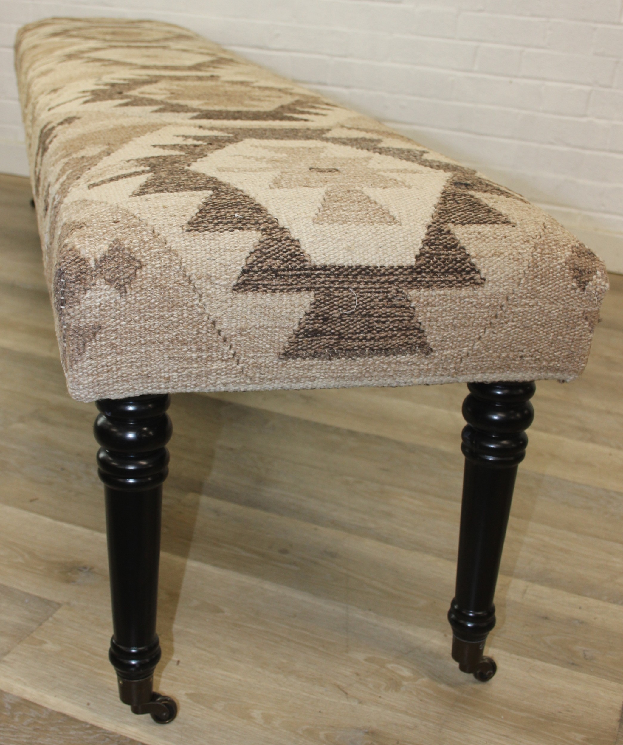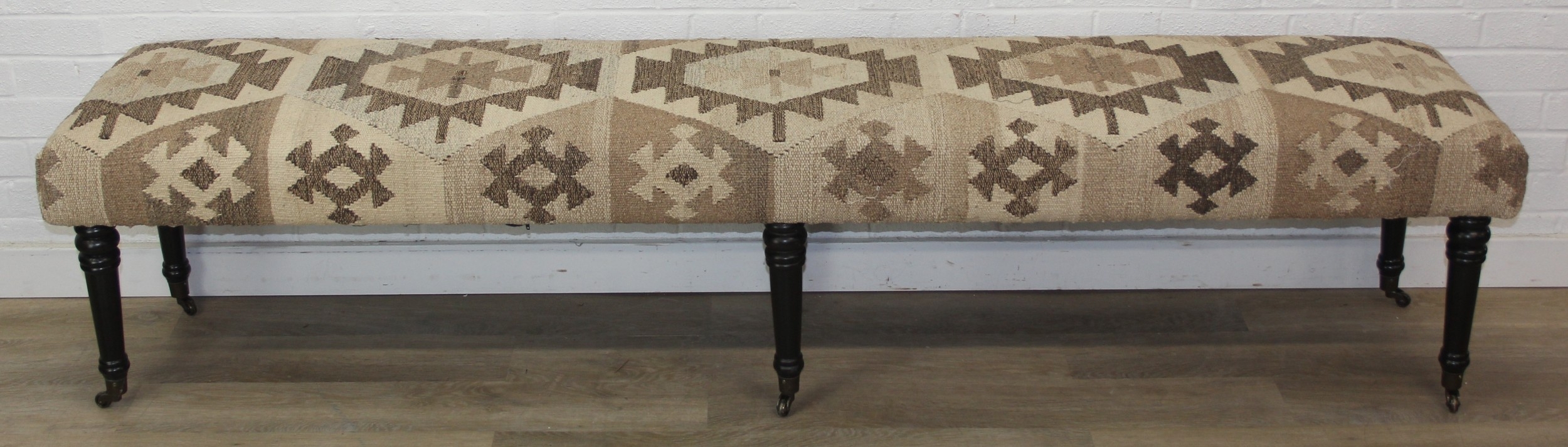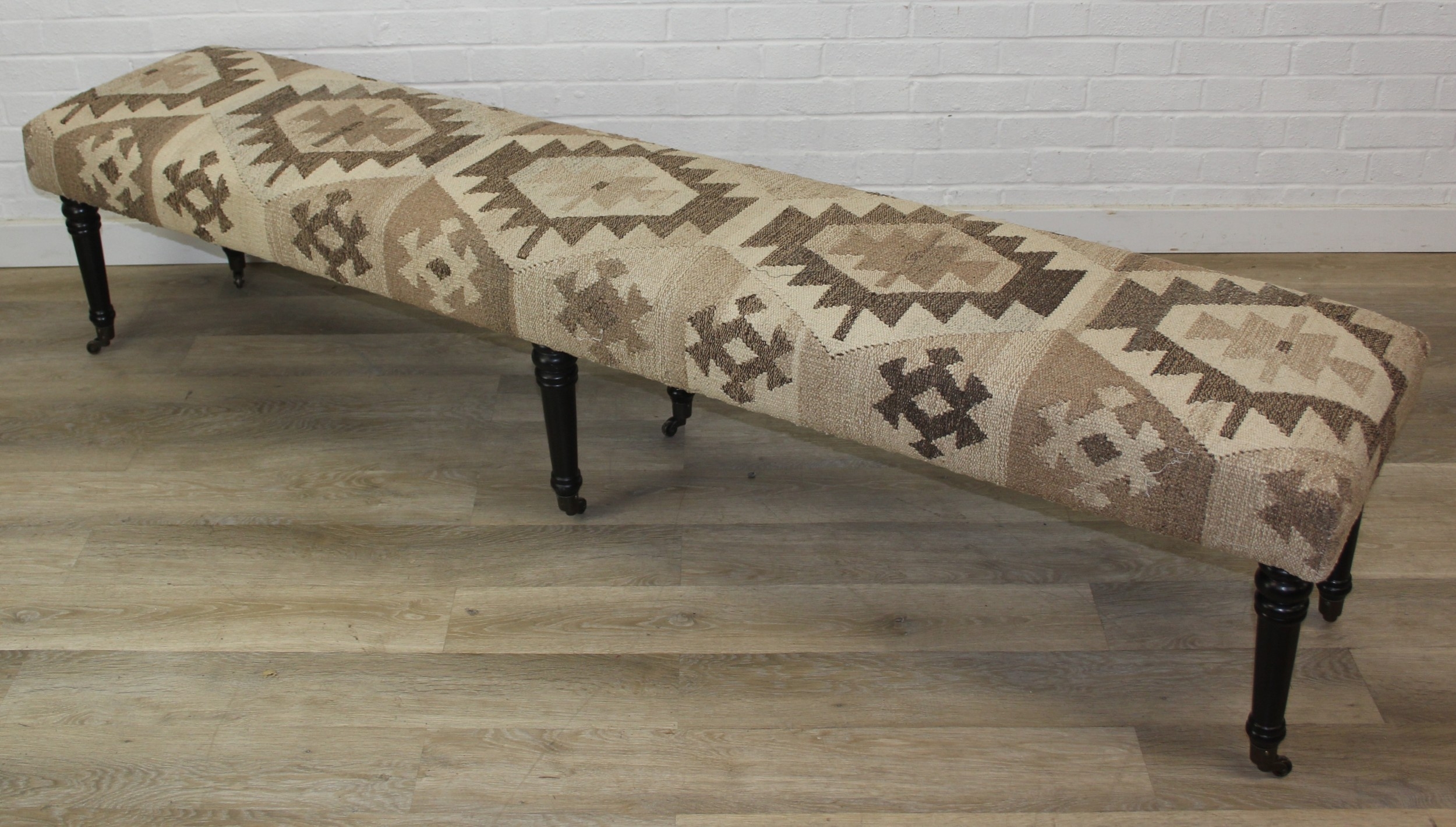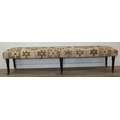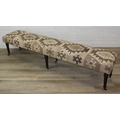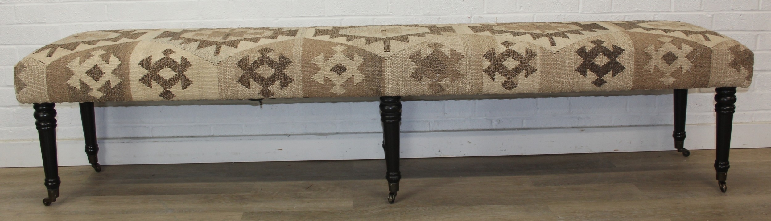 A very large antique style footstool with kilim style top and turned ebonised legs, 220cm x 45cm x 52cm, one of two in the sale