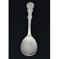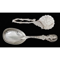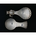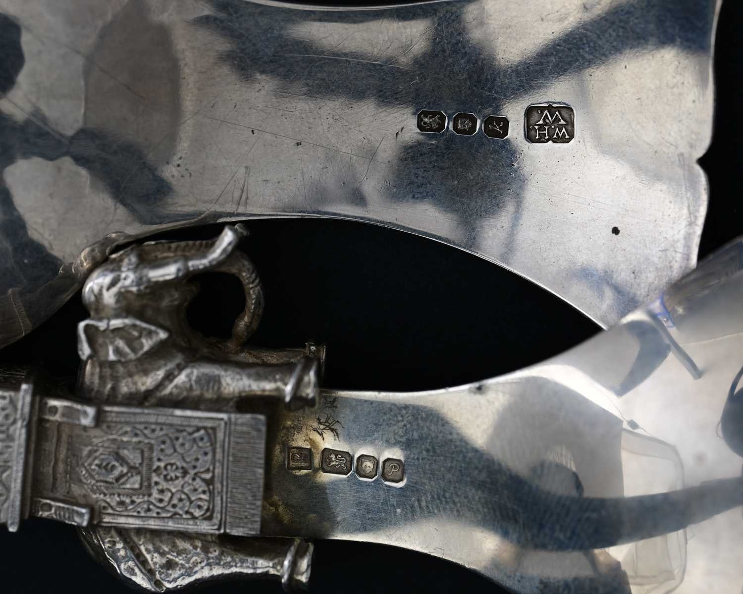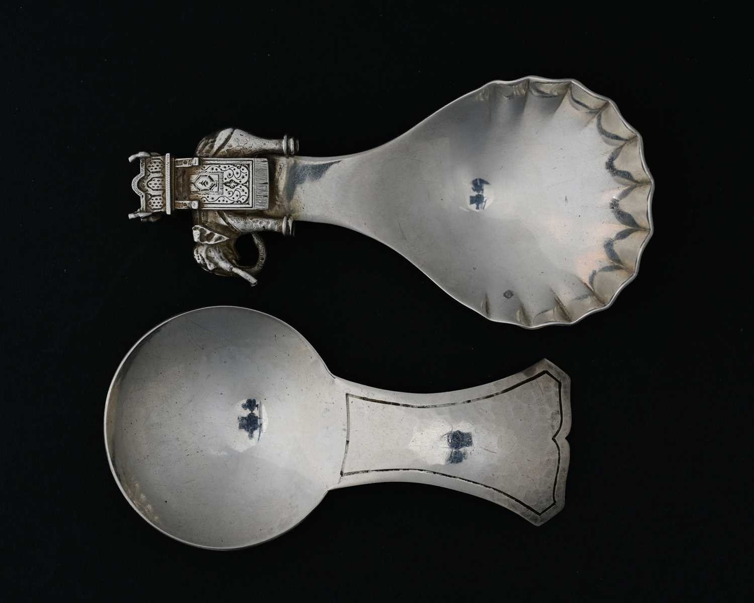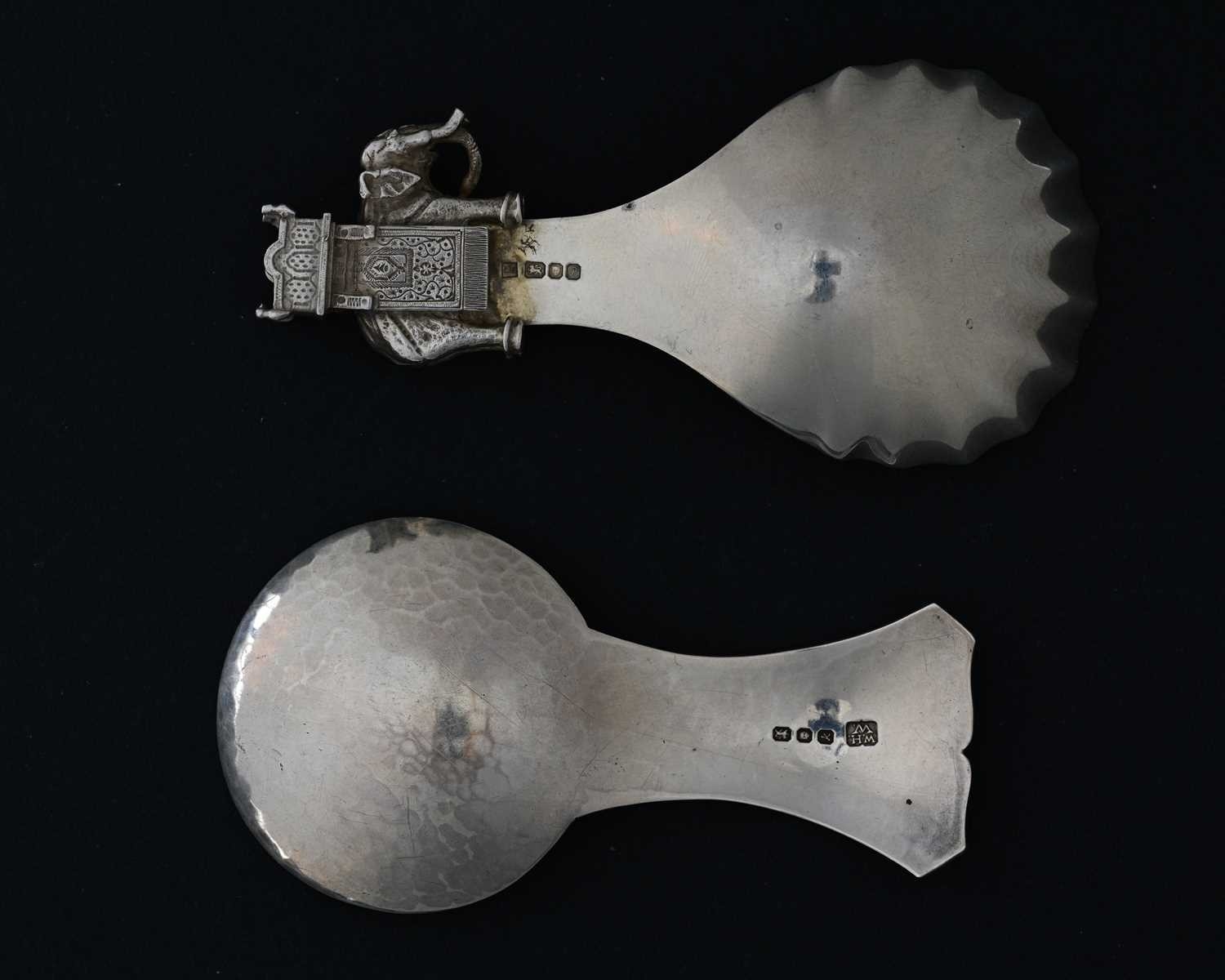 A contemporary silver caddy spoon, by Clive Burr, London 1989, the finial formed as a cast and applied elephant with howdah, length 9.2cm, together with a modernist silver caddy spoon, by William Henry Warmington, London 1965, combined weight 65g/2.08ozt approx (2)