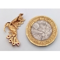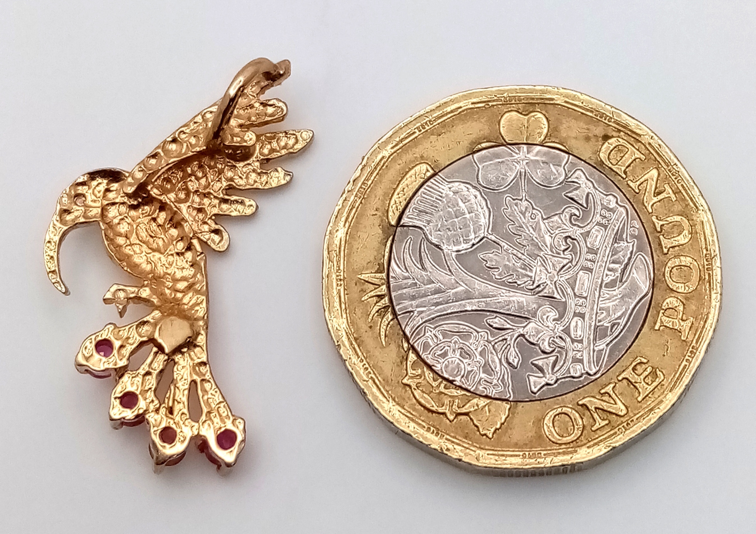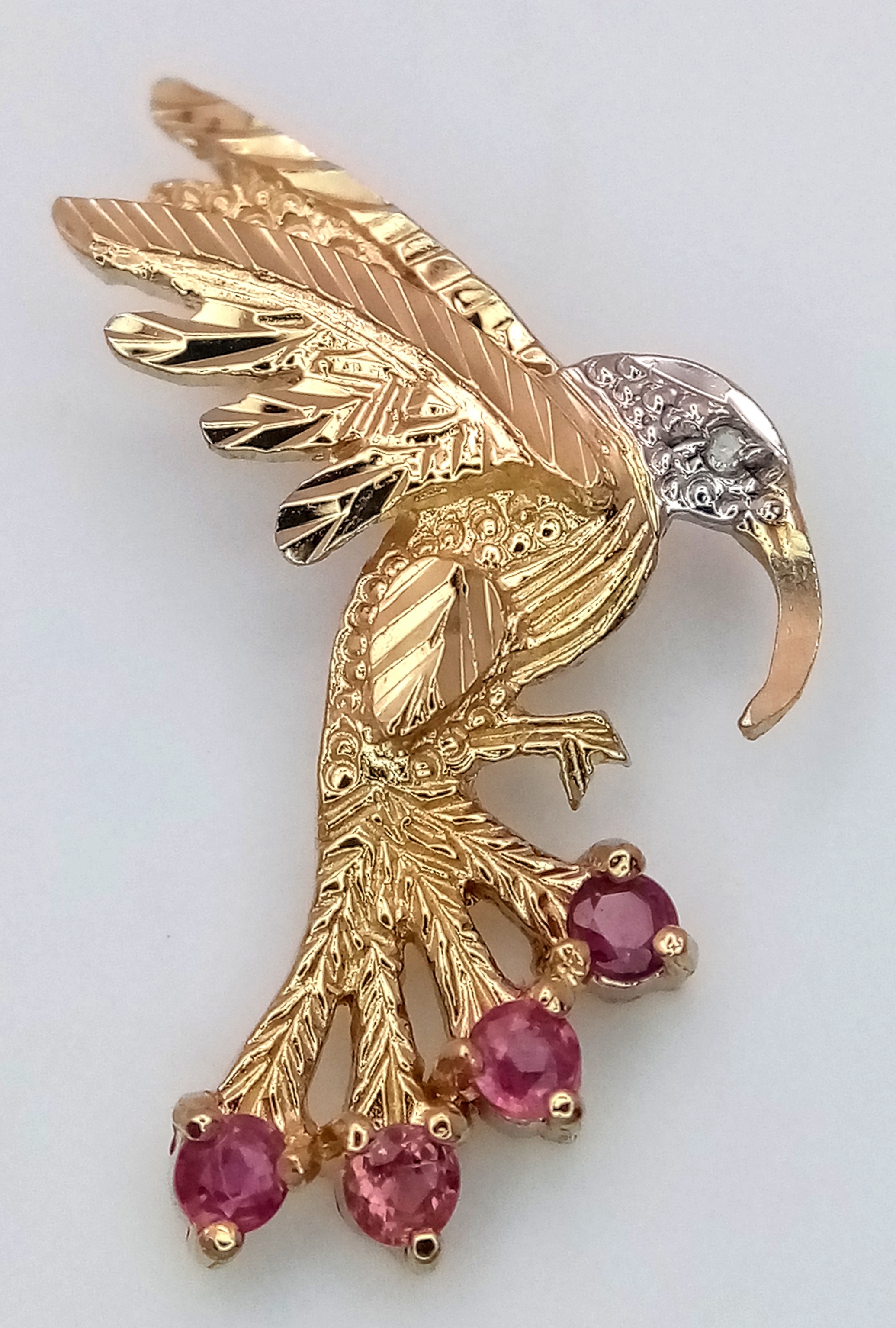 A 9k yellow gold ruby and diamond bird pendant - 0.01ct diamond weight. 0.12ct ruby weight, 1.8g total weight. SH1740I.