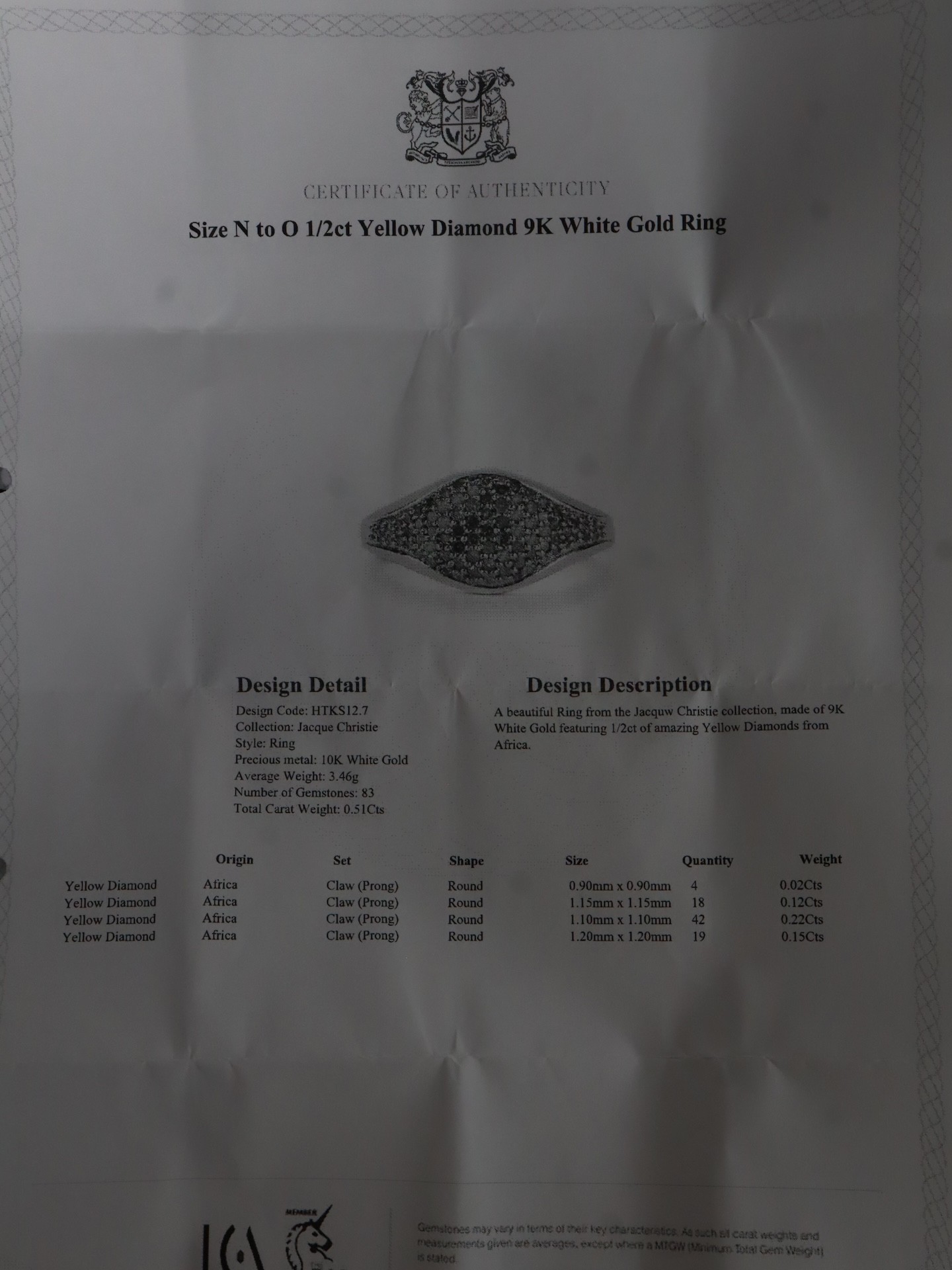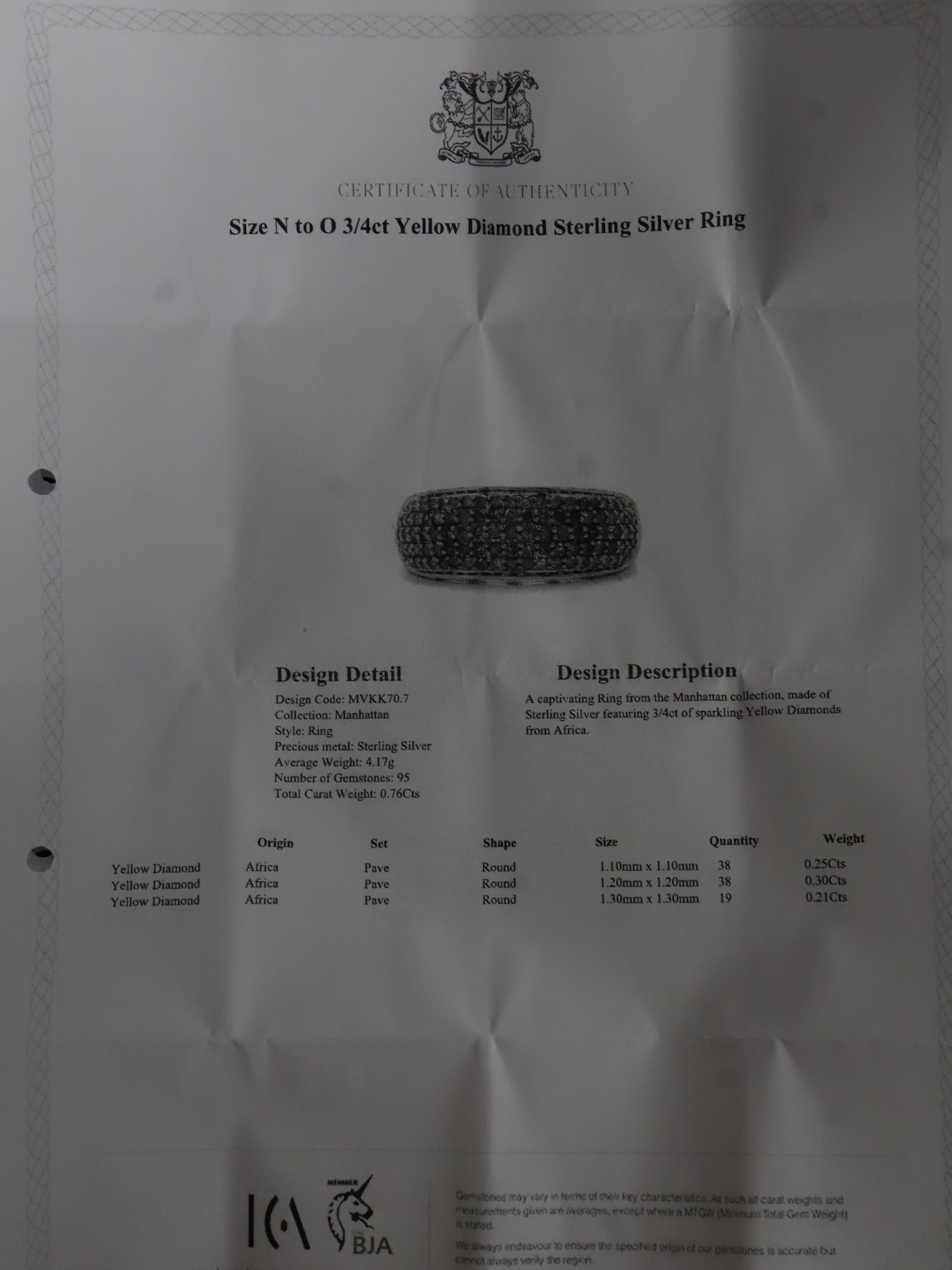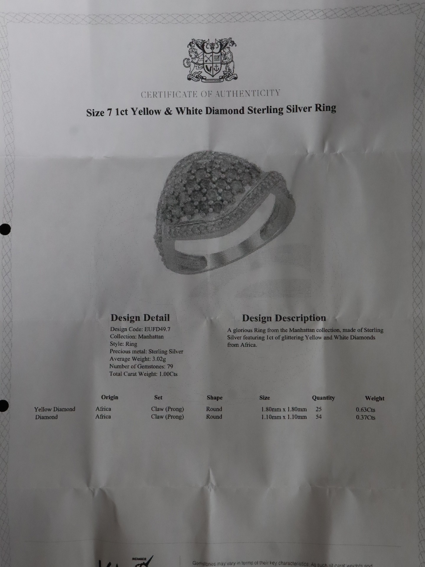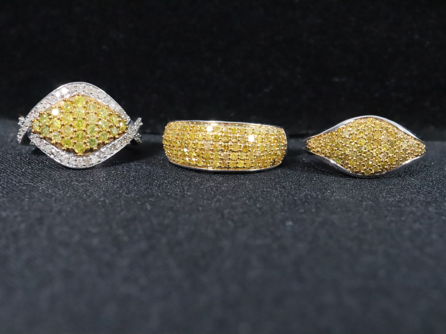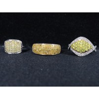 1/2ct Yellow Diamond 9K White Gold Ring Size N to O (3.6g), 3/4ct Yellow Diamond Sterling Silver Ring, 1ct Yellow & White Diamond Sterling Silver Ring Size 7