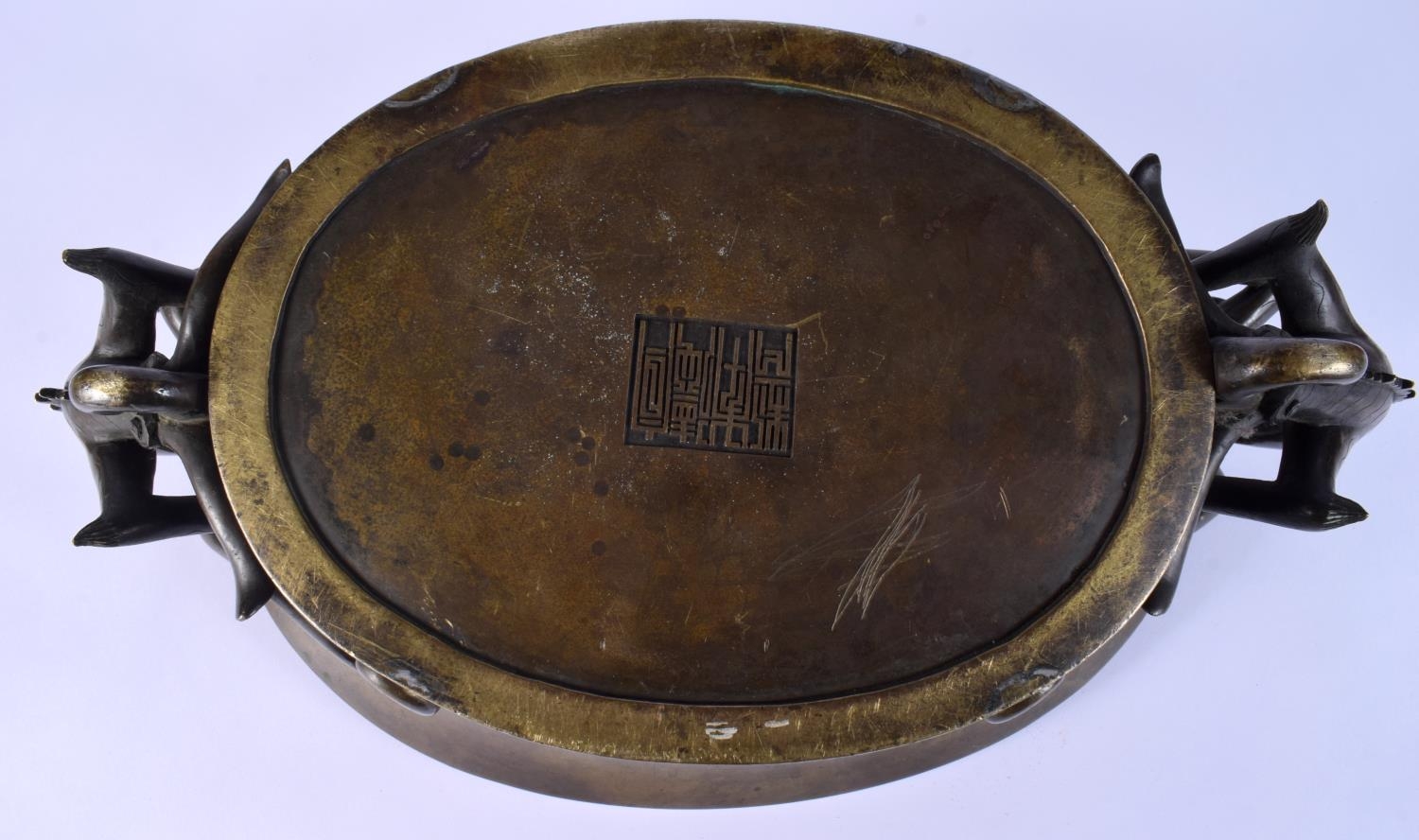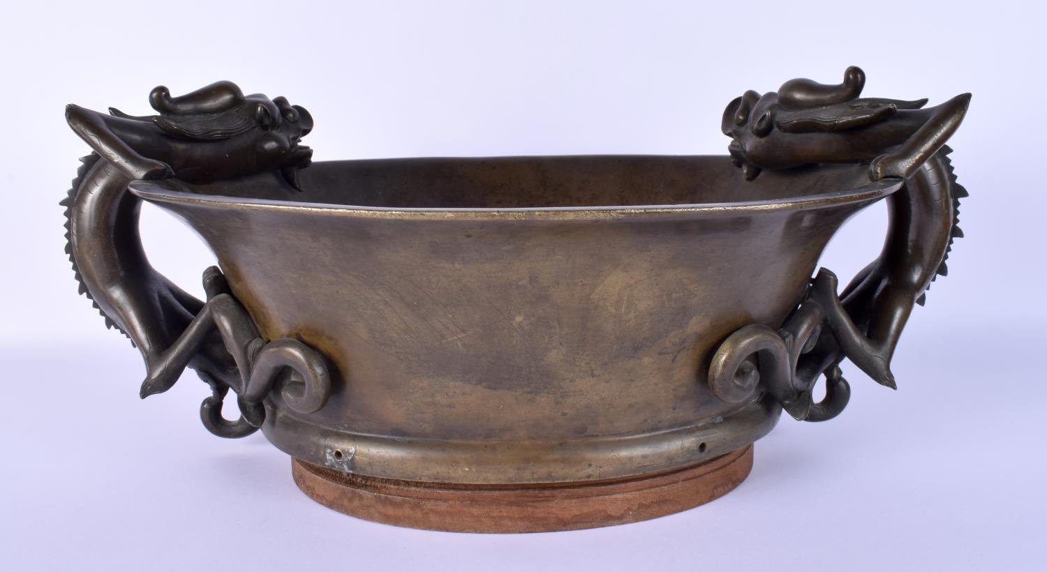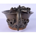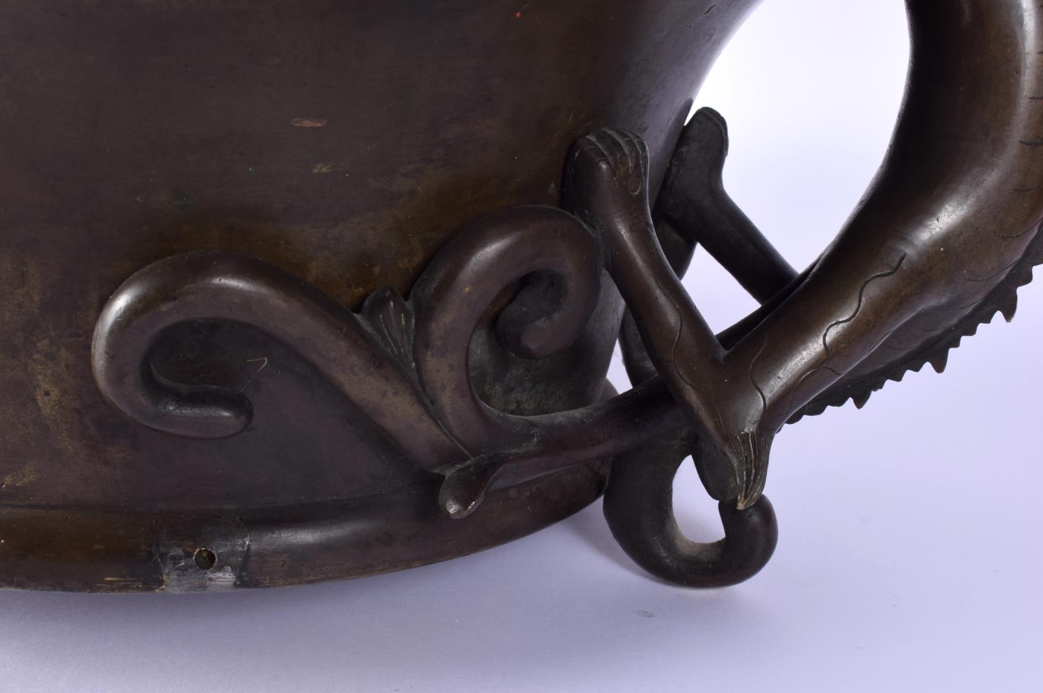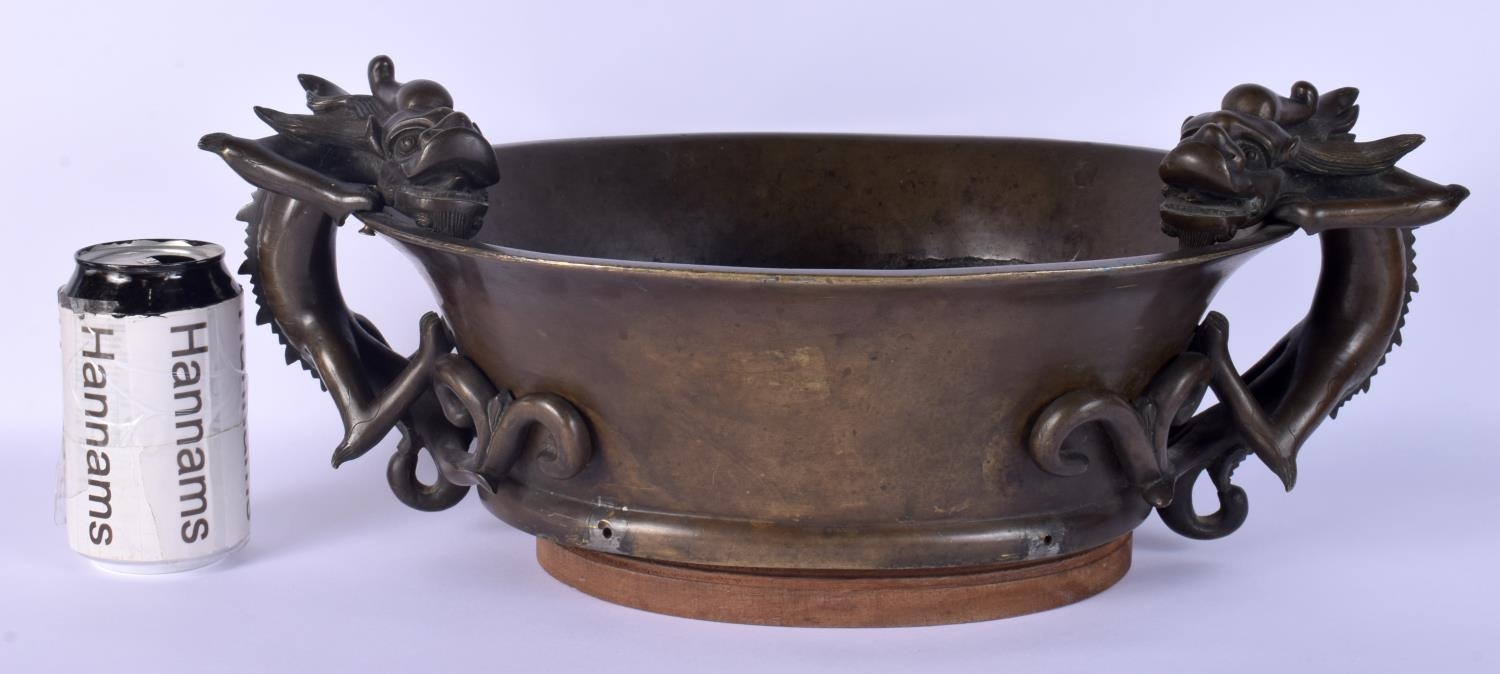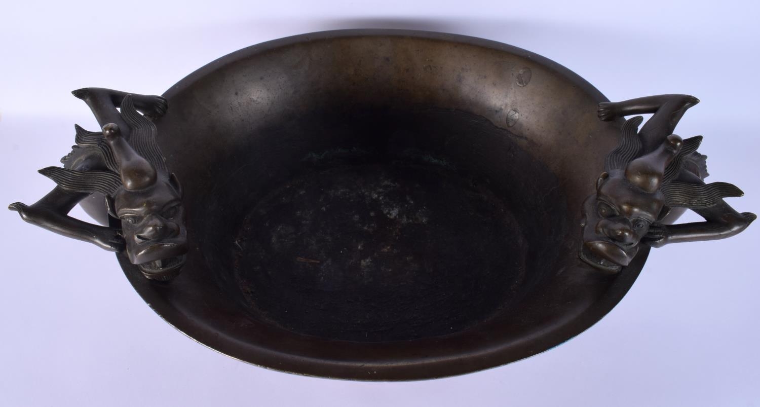 A FINE AND EXTREMELY RARE 18TH CENTURY CHINESE BRONZE NARCISSUS CENSER Qianlong, bearing Xuande marks to base, of extremely large proportions, formed with over hanging beasts. 10.54 kg. 44 cm x 18 cm, internal width 30 cm.