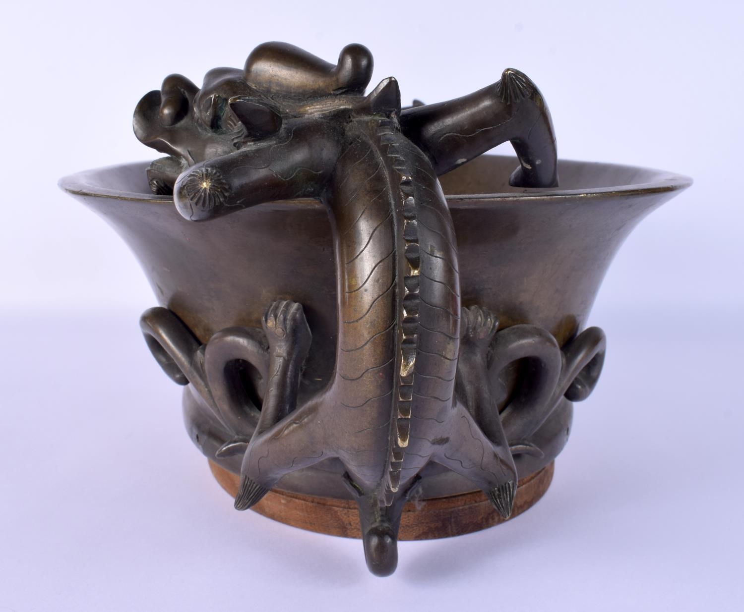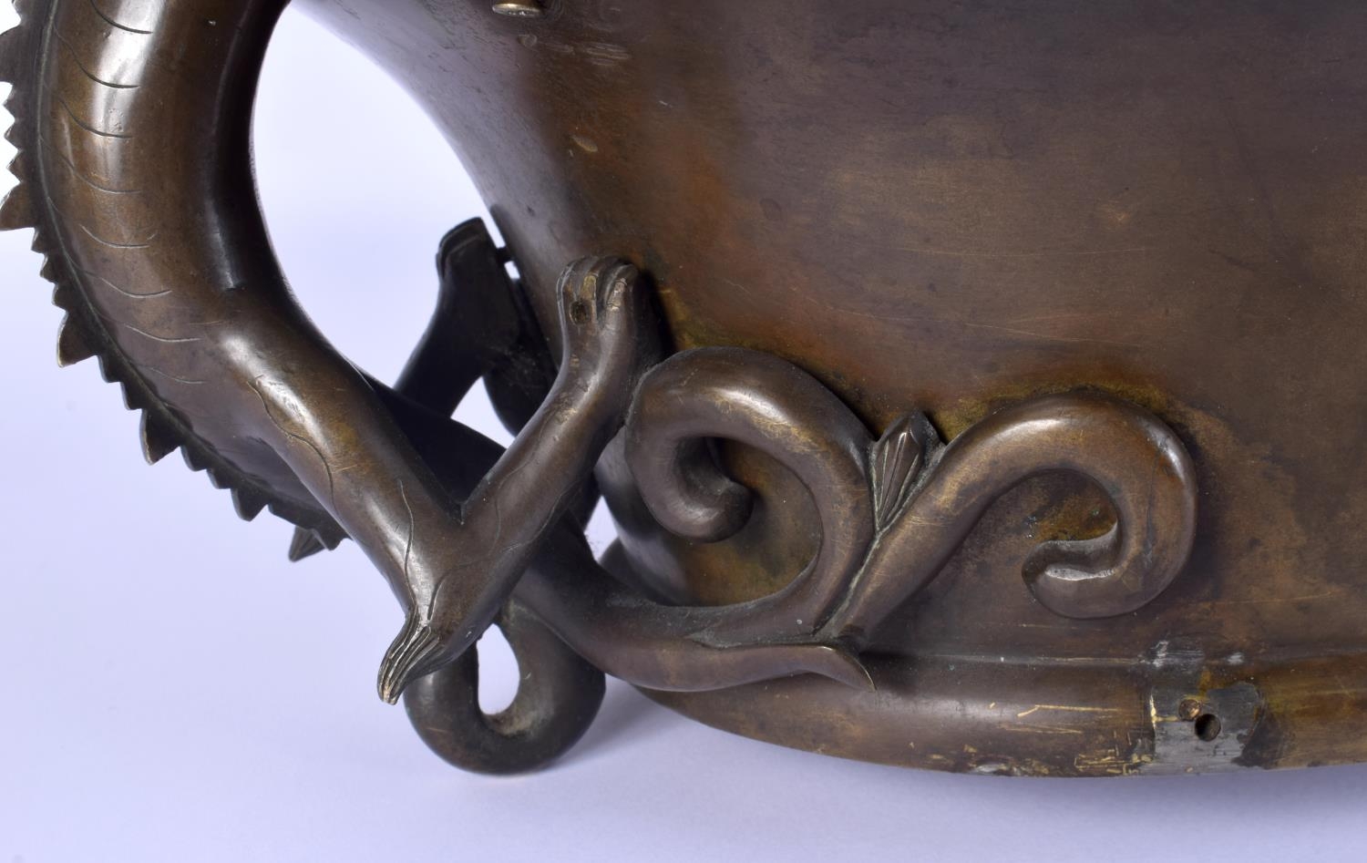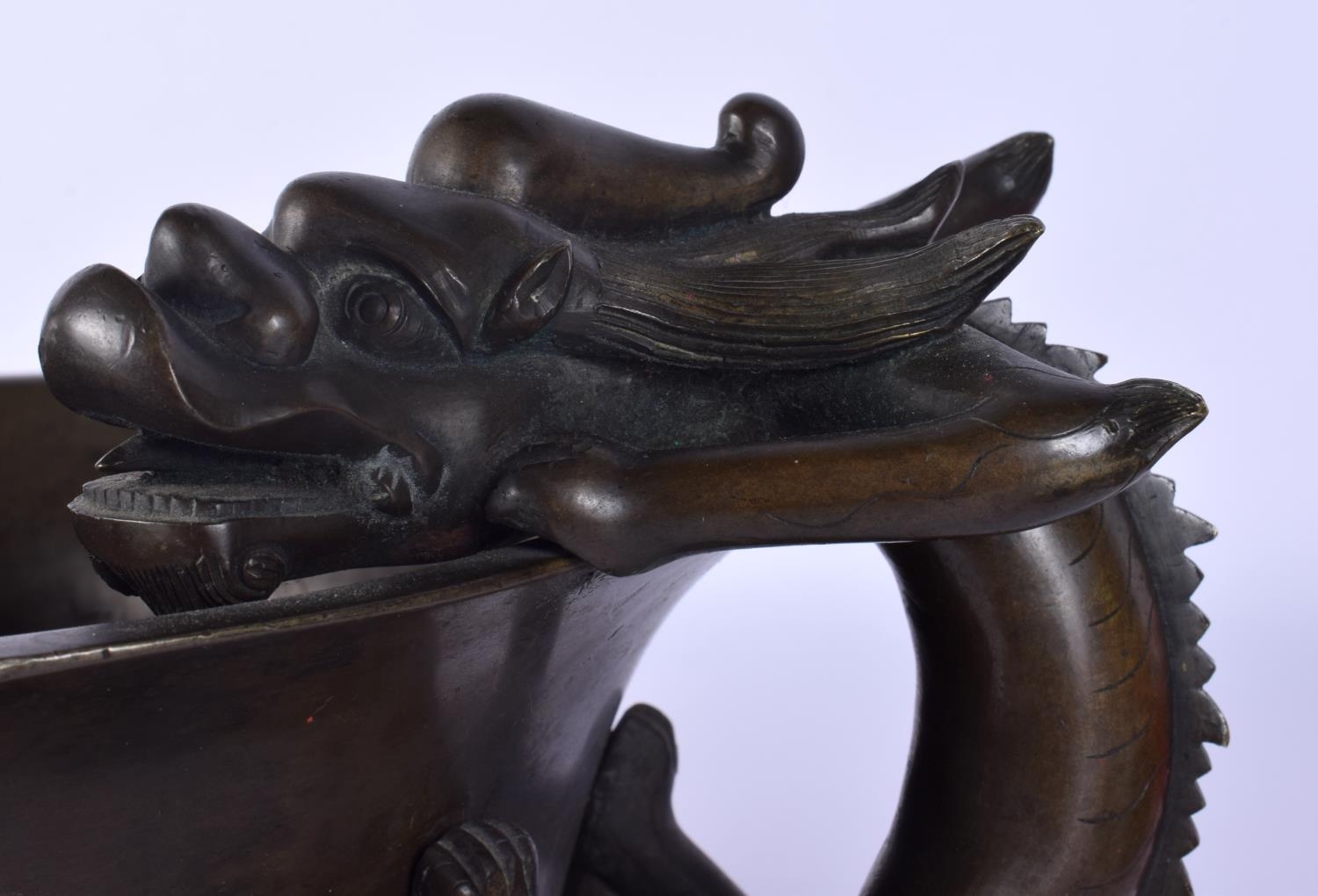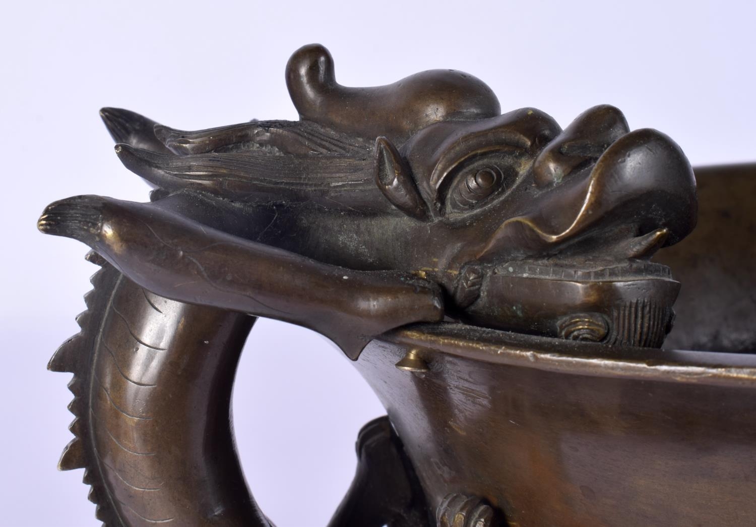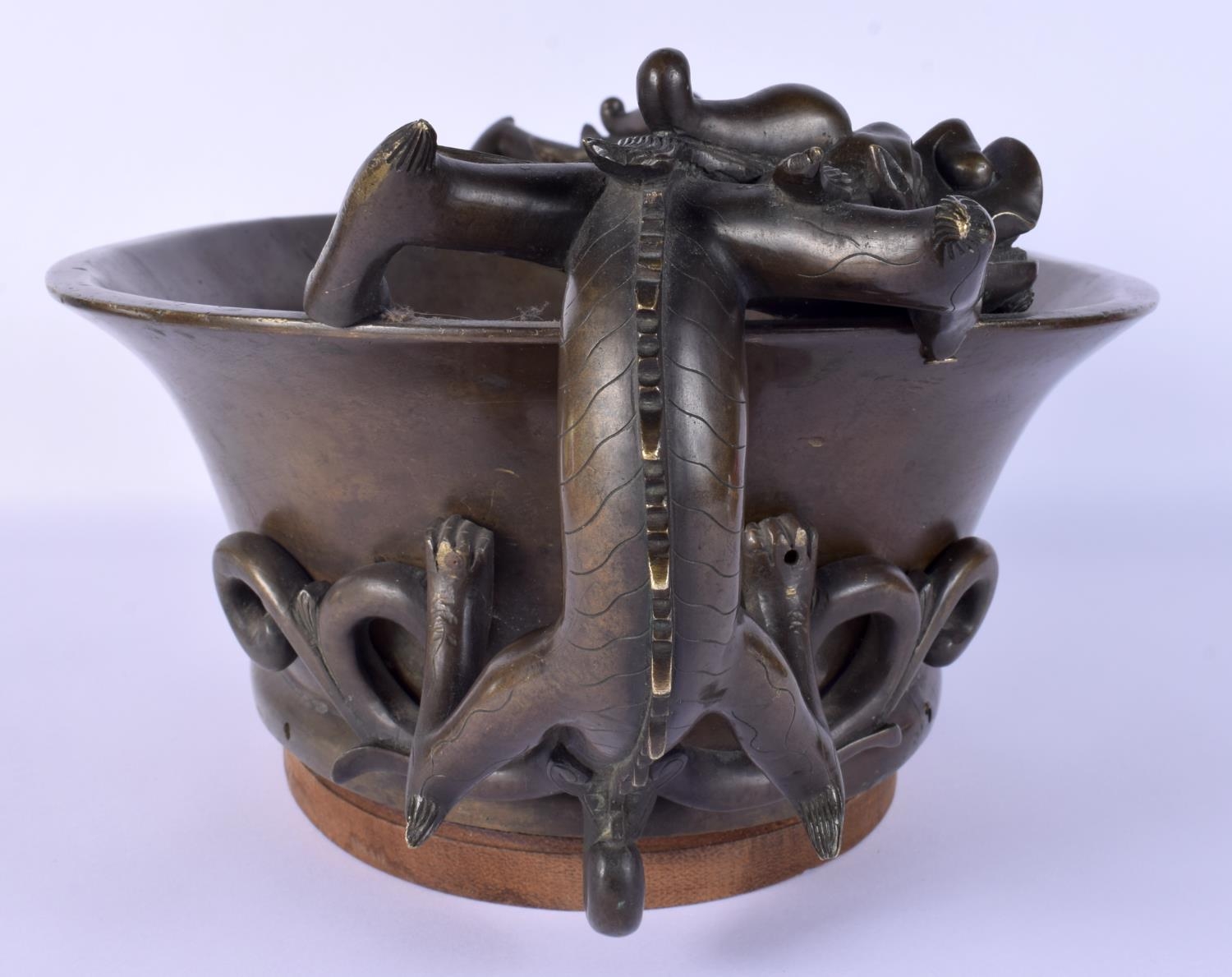 A FINE AND EXTREMELY RARE 18TH CENTURY CHINESE BRONZE NARCISSUS CENSER Qianlong, bearing Xuande marks to base, of extremely large proportions, formed with over hanging beasts. 10.54 kg. 44 cm x 18 cm, internal width 30 cm.
