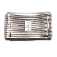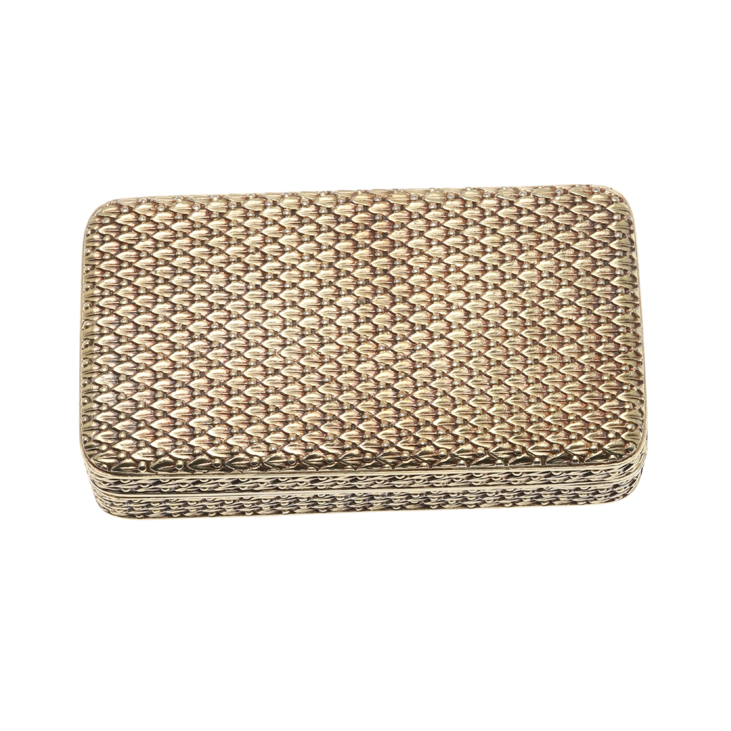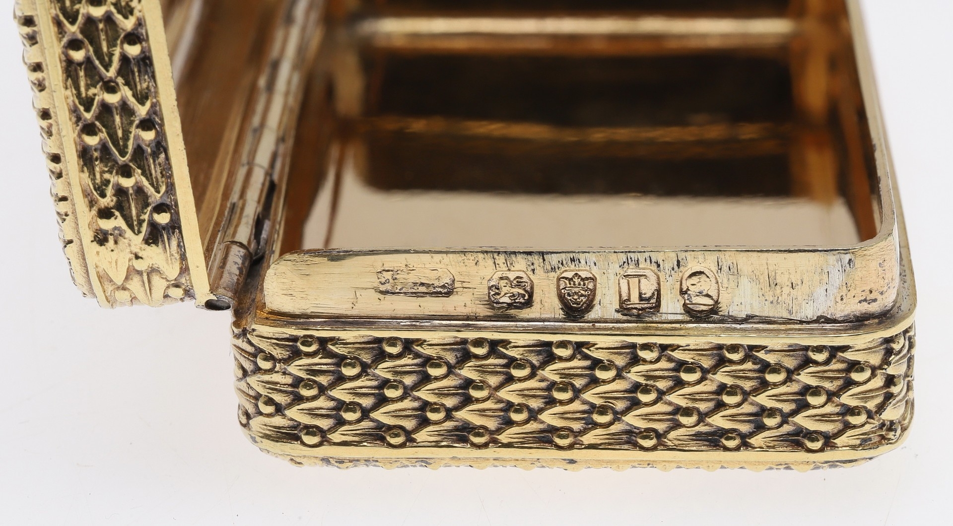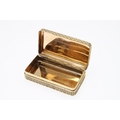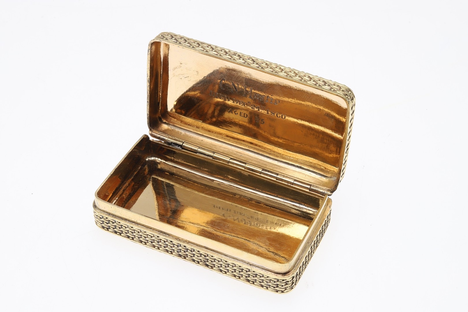 A GEORGE III SILVER GILT SNUFF BOX. Of rectangular form with faux basket weave decoration, later engraved to the inside of the lid 'C.N.Mustie, Died Decr 24th 1860, Aged 85'. Hallmarked (W.L, possibly), London, 1806. 8cm x 4.5cm, 3.2ozt.