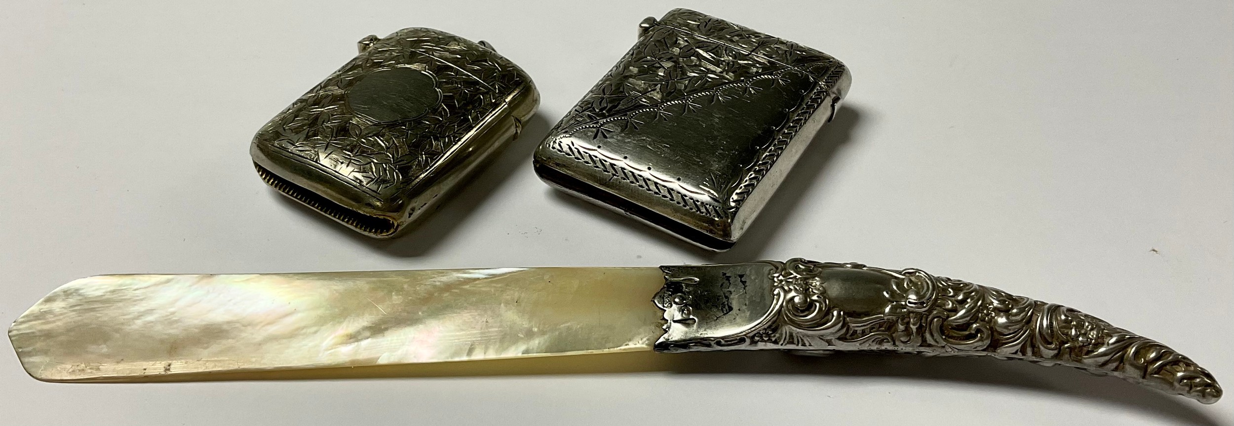 An Edwardian silver vesta case, Chester 1903, 30g; a Victorian silver and mother-of-pearl paper knife, 18cm, Birmingham 1896; an EPNS vesta case (3)