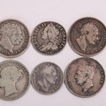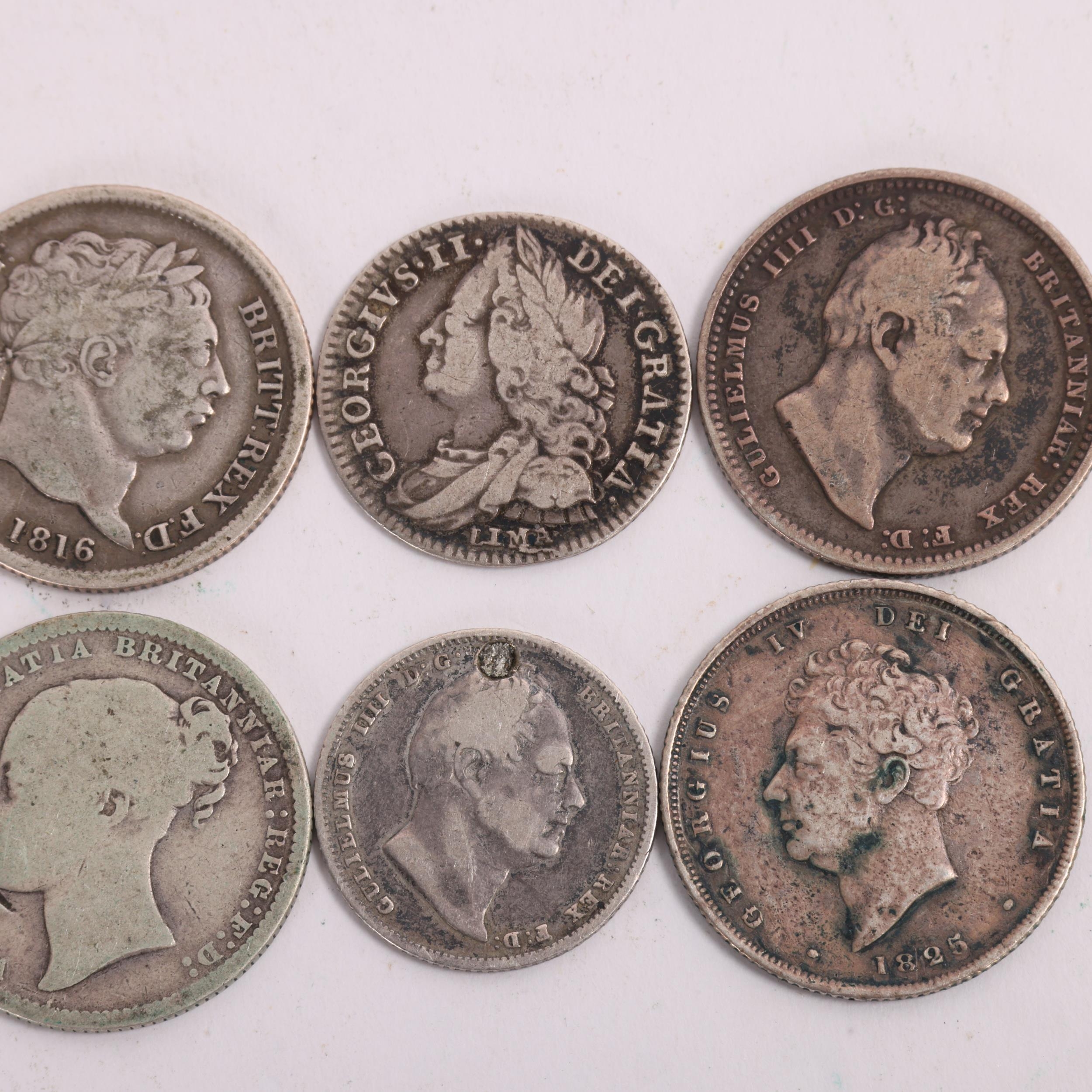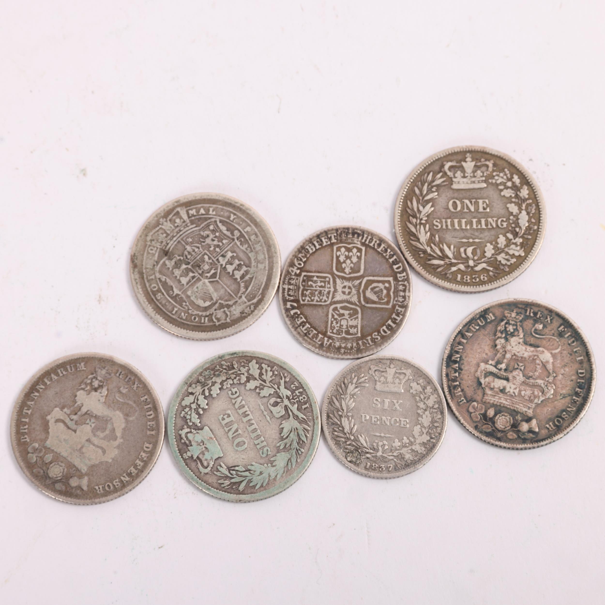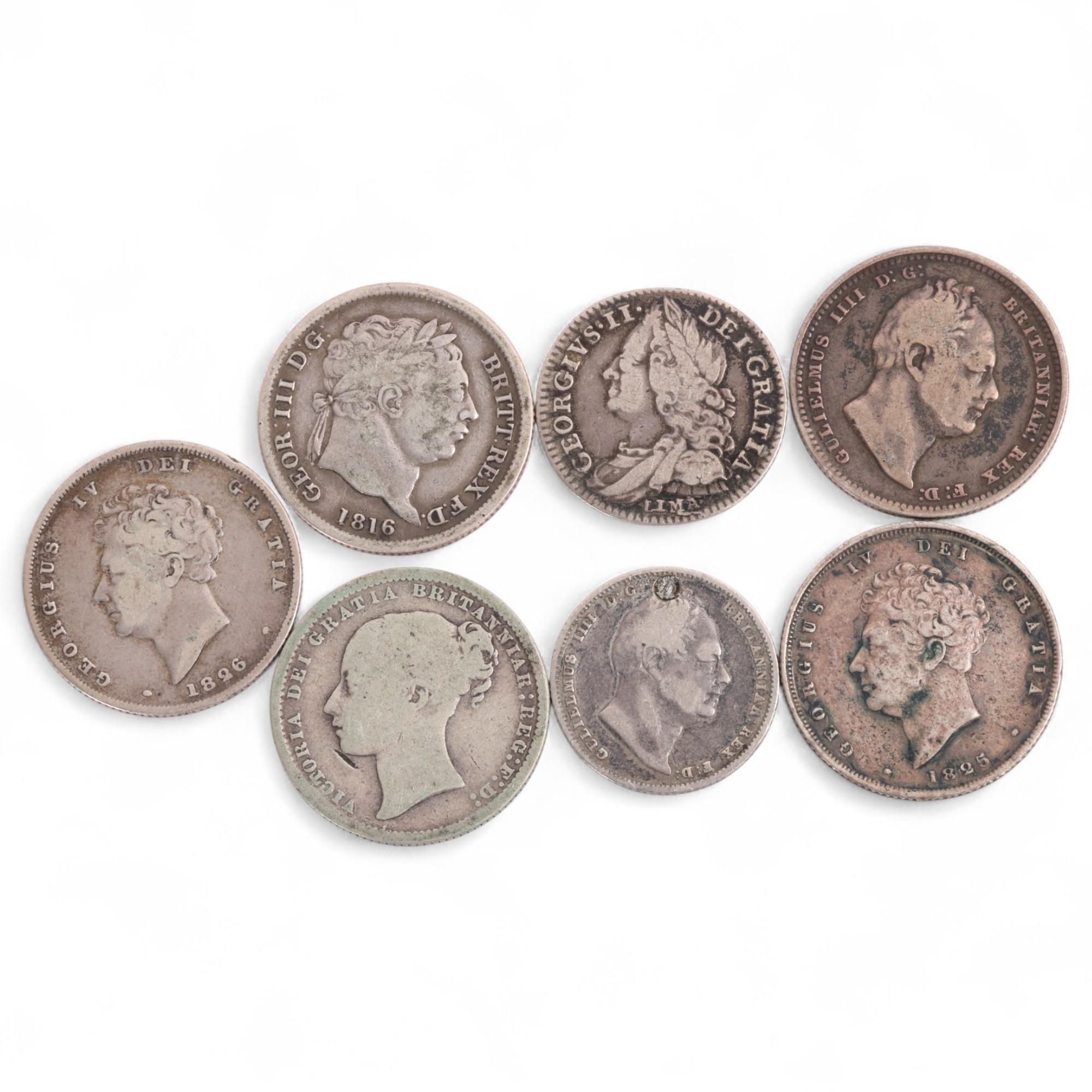 7 silver British coins, including George II 1746 Sixpence, George III 1816 Shilling, 2 George IV shillings, William IV 1837 Sixpenece and 2 others, total weight 32.3g