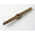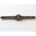 An antique diamond bar brooch, the old and rose cut diamonds grain set as two parallel lines with a central daisy flower in silver backed yellow gold (surface Kee testing as 9ct) 7cm x 12.2cm overall, with pin and c-scroll with safety clip fastening, 7.5g Unless otherwise stated, the KEE test is a surface test only and not a guarantee of metal purity.