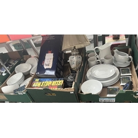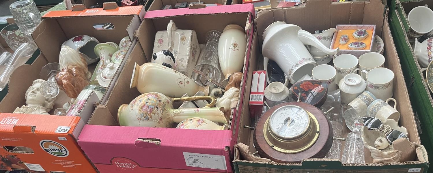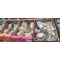3 Boxes containing Crown Devon vases, onyx frog, and assorted ceramics