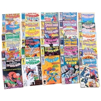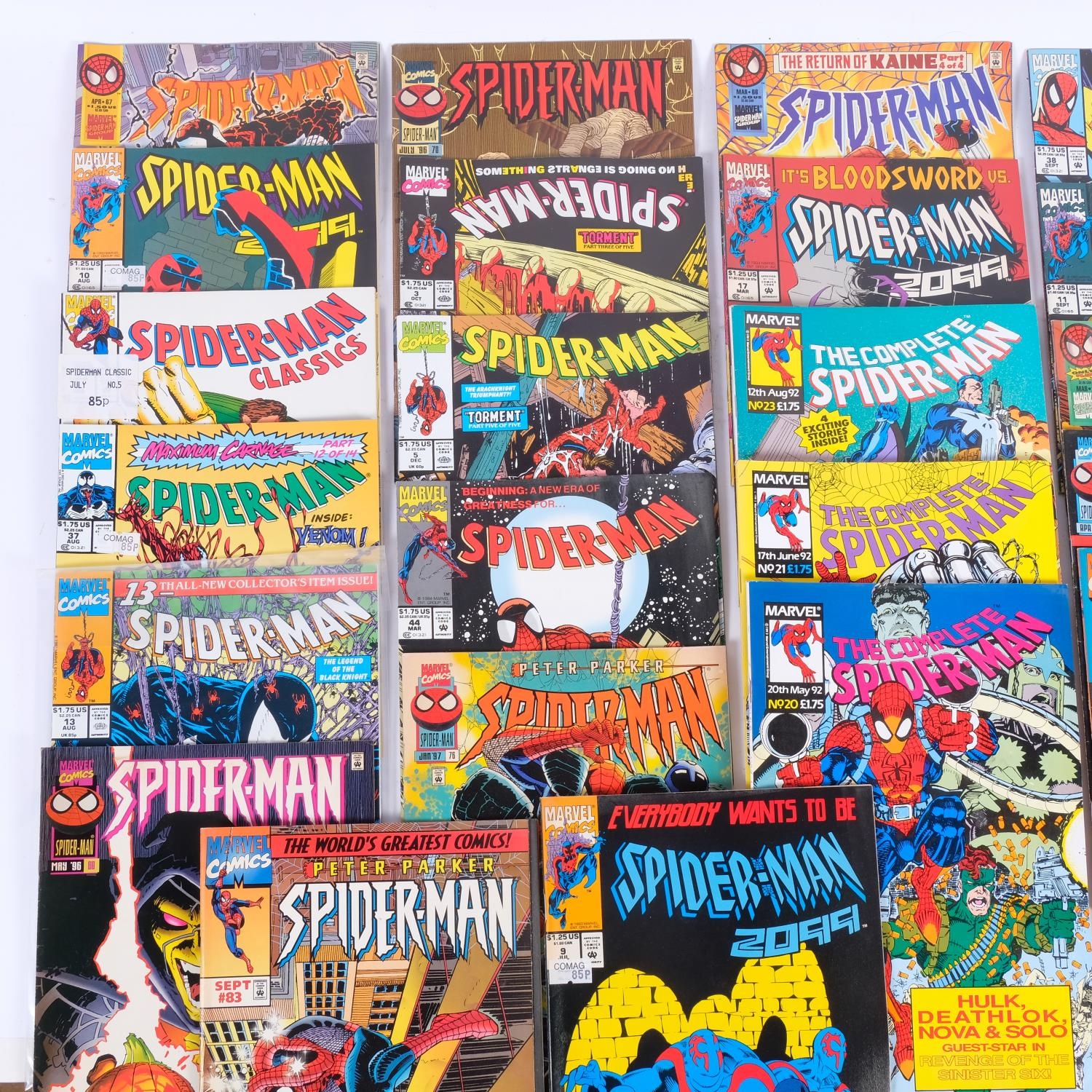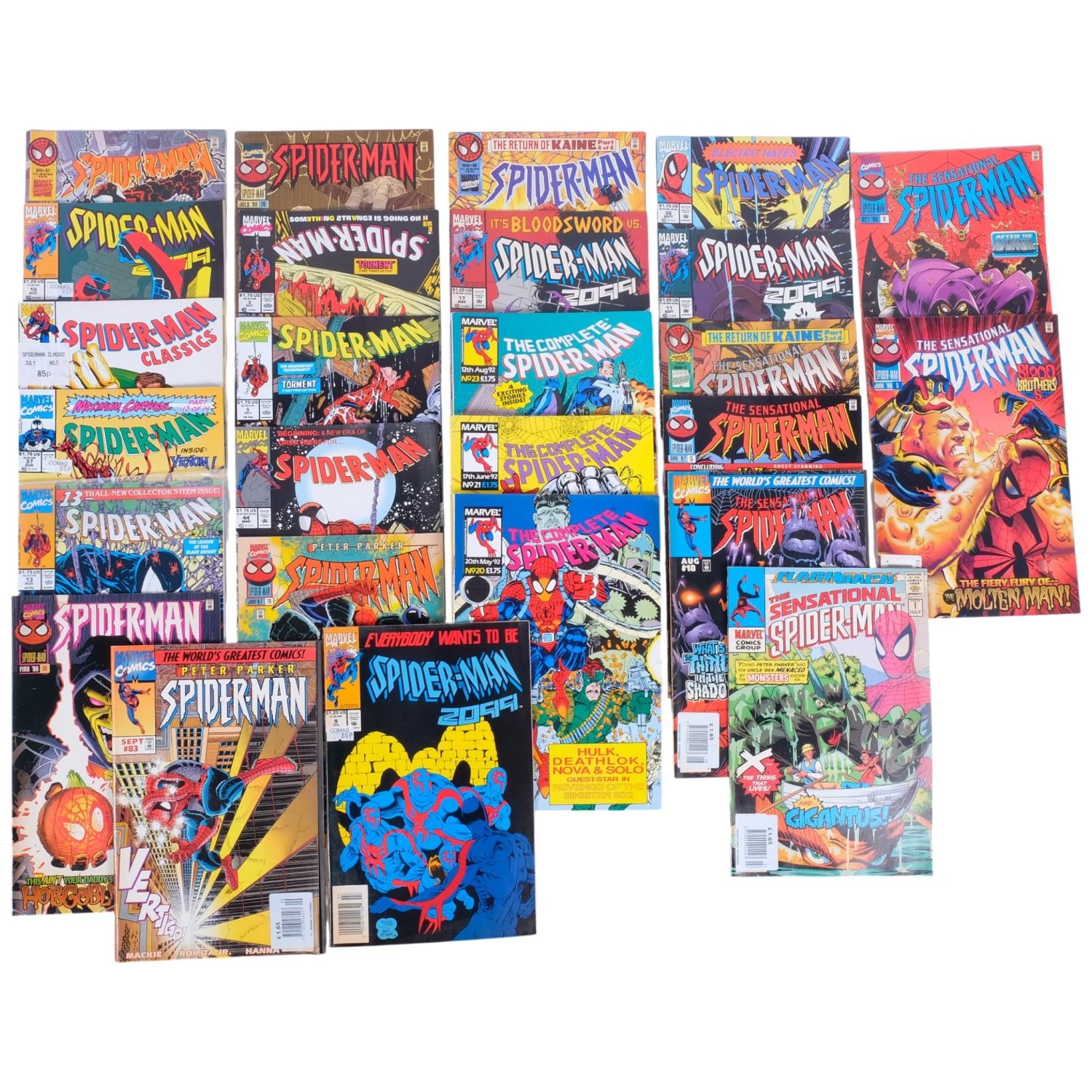 A collection of various Spiderman comics, including The Complete Spiderman x 3, The Sensational Spiderman The Return of Kaine, part 2 of 4, and part 4 of 4, It's Blood Sword Versus Spiderman 2099, 20 other issues