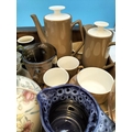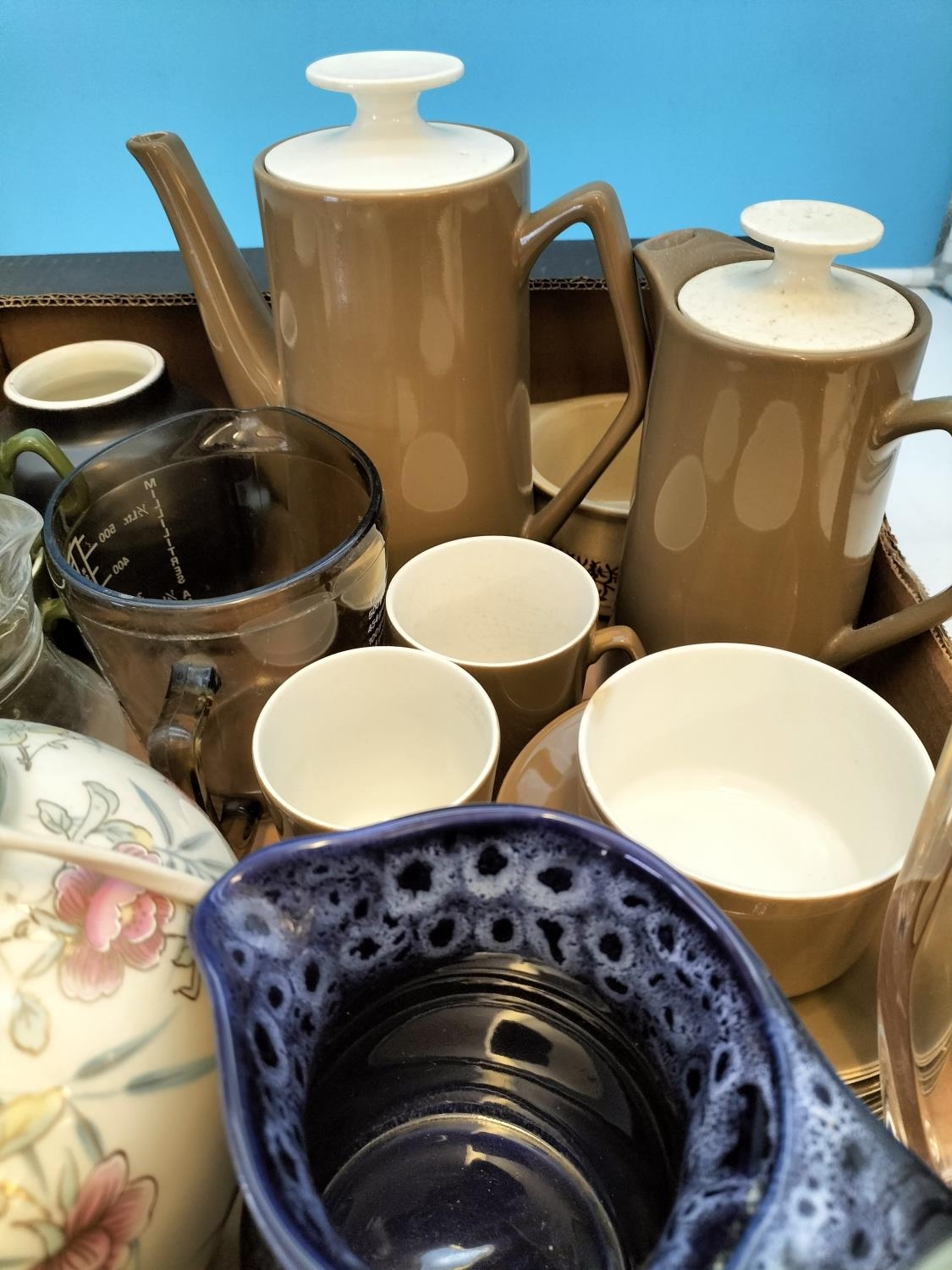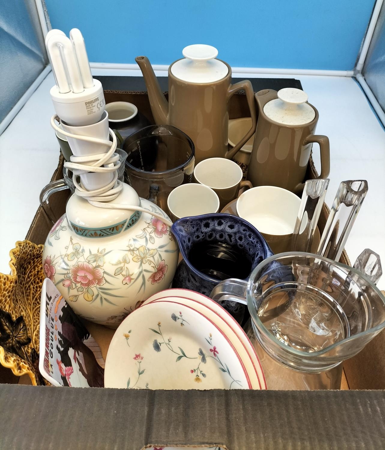 Box of Mixed Pottery and Glass to include Coffee Pot, Lamp Base, Jugs, etc. Sold in Aid of Ukraine.