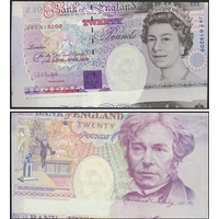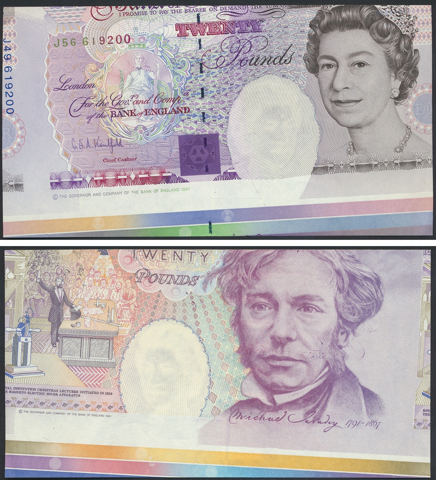 G.E.A. Kentfield. Error £20 J56 619200 design misplaced, angled slightly to left, design shifted up and to right with colour bars below and serial number J49 619200 of leftmost adjoining note visible, near uncirculated. (BNYB E4a(i)) (N)